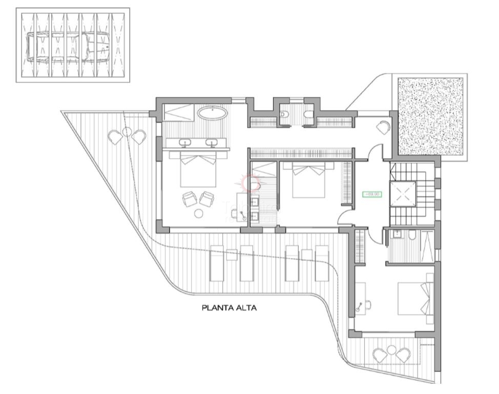 Drei Doppelzimmer mit eigenem Bad und eine Balkonterrasse mit Blick auf das Meer. Die Hauptschlafzimmersuite ist größer und verfügt über einen Ankleidebereich mit vielen Schränken und ein größeres Badezimmer mit separater Dusche und Badewanne.