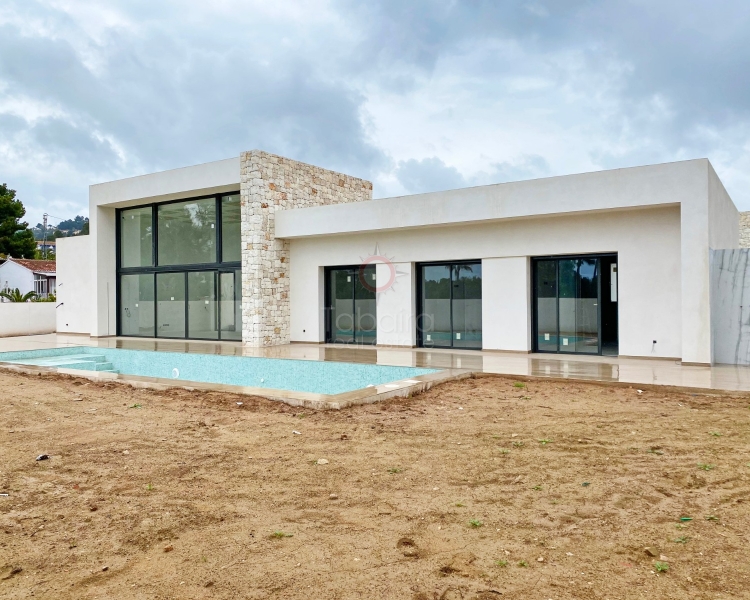 Villa moderna en venta cerca de Moraira en una sola planta. Tres dormitorios, dos baños uno en suite, salón y cocina abierta, piscina al mismo nivel de salón, ducha y zona de lavandería exterior, trastero 10X3 m2 en Parcela de 500 m2 y una construcción de 150 metros. 15 minutos a pie de Moraira.