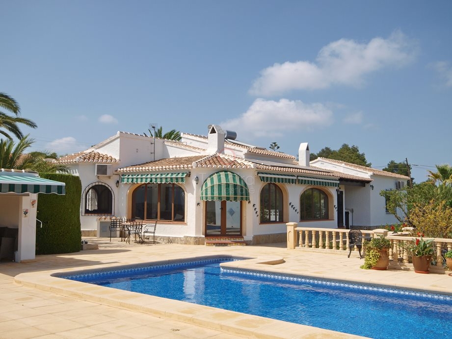 Villa for sale located close to the golf course of Javea in the North Costa Blanca, this spacious property with all the accommodation on the ground level occupies an elevated plot in the residential area of “Las Mandarinas" and enjoys pleasant views across the golf course. The constructed area built onto the plot is 226.6 square meters and comprises of entrance lobby, hallway with store cupboard and shower room, 2 large double bedrooms both with en-suite bathrooms and a third double bedroom which is also a good size and a fully equipped kitchen with a granite worktop. The living area of the property is split into four separate areas with French doors leading to the gardens and pool area. Additional auxiliary rooms are a exterior shower room and WC, laundry room, a poolside porch and a machine room for the swimming pool.