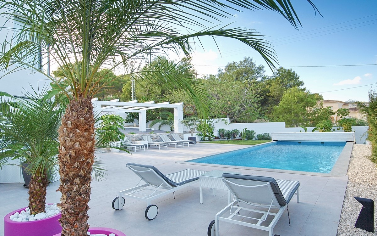 Villa moderna y lujosa de 5 dormitorios situada a 280 m de la playa de Baladrar, tiendas, bares y restaurantes en la zona de Pepe la Sal, Cap Blanc a poca distancia a pie y la ciudad de Moraira a cinco minutos en coche.