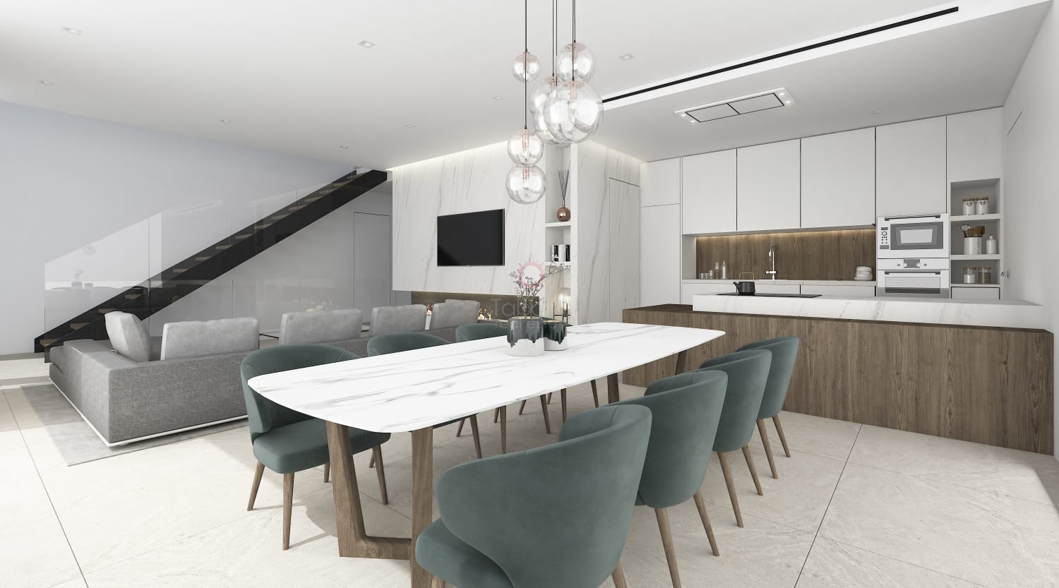 Cocina abierta totalmente equipada de planta abierta al salón y comedor de la propiedad y con acceso a una terraza lateral. Cocina equipada con electrodomésticos integrados, armarios lisos de diseño moderno y encimera de porcelana de alta calidad con isla.