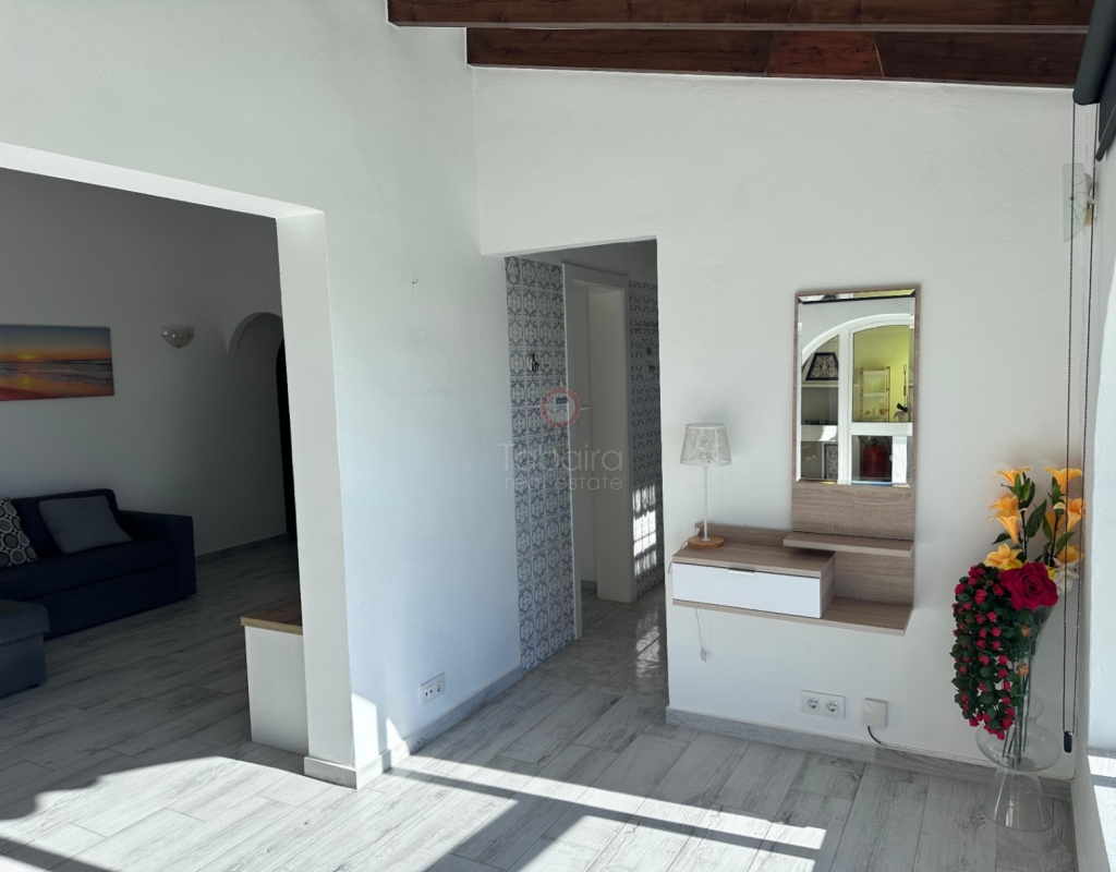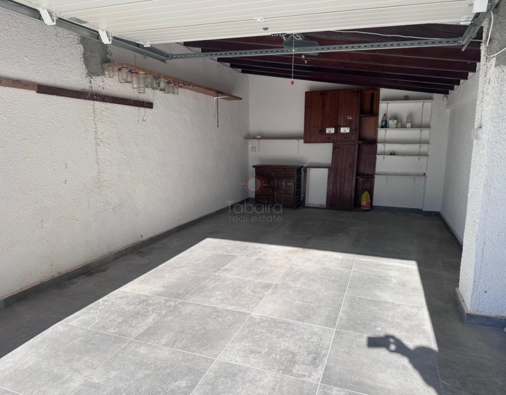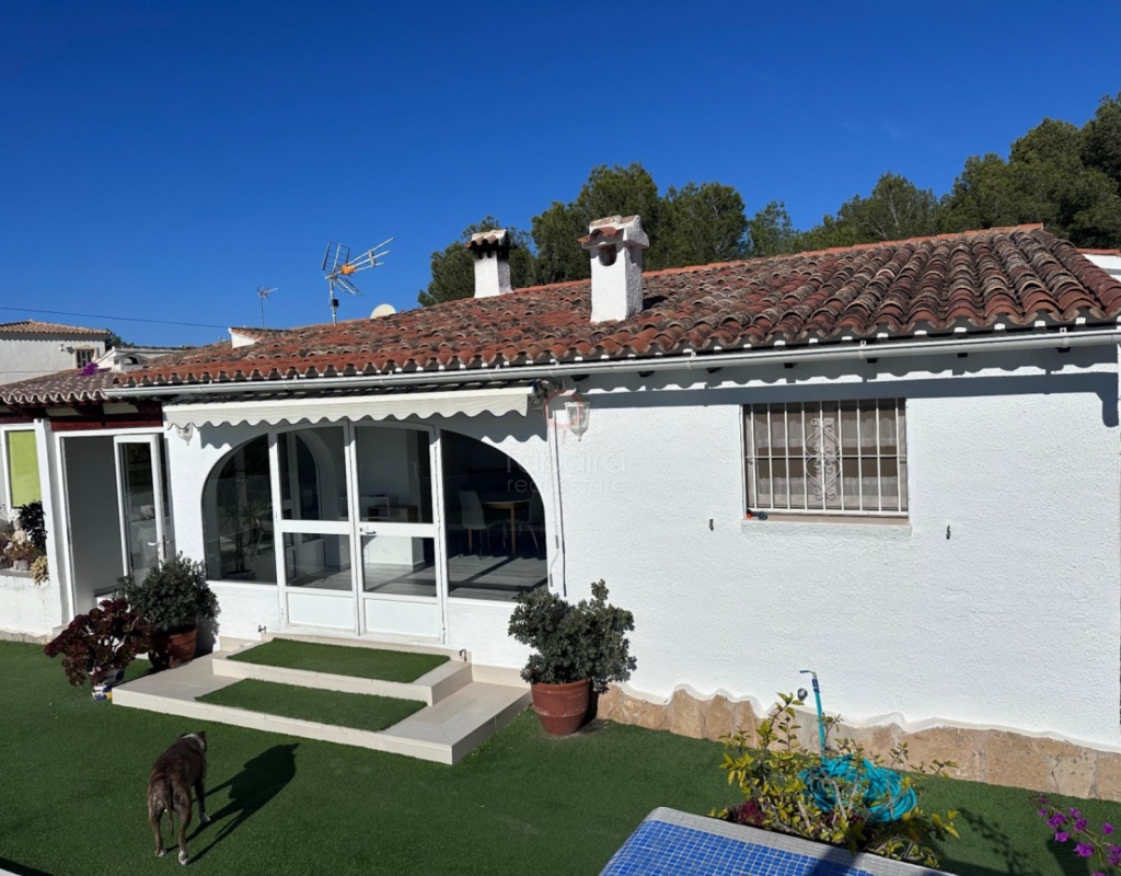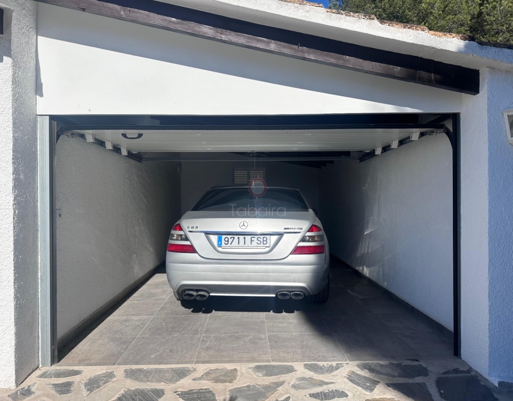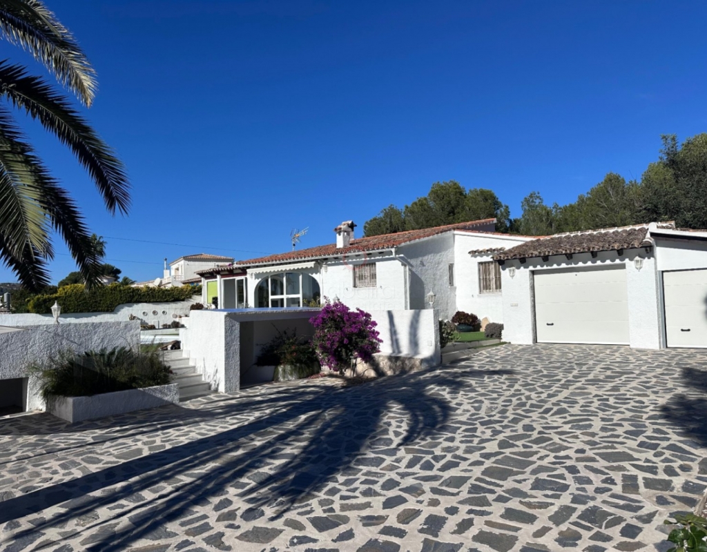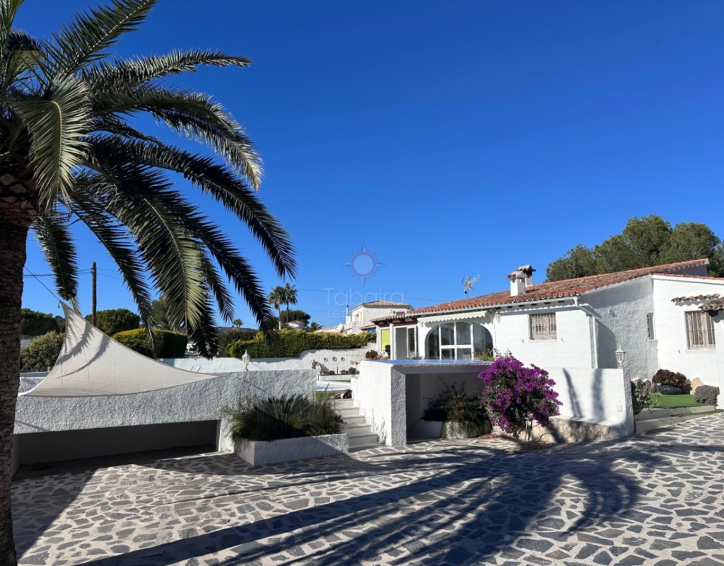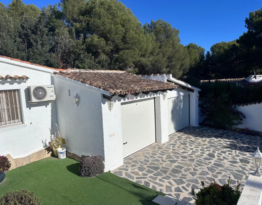 Villa en venta en Moraira, La Sabatera. Villa de una sola planta con 3 dormitorios, piscina privada, vistas al mar, orientación sur y dos garajes en 800 m², a 3 km del mar y del centro. En la tranquila zona de La Sabatera, en Moraira, se encuentra esta villa de una sola planta en una parcela prácticamente llana de 800 m². La vivienda tiene orientación sur, ofrece vistas al mar y se encuentra a solo 3 km del centro y de la costa. Descripción La villa tiene una superficie construida de aproximadamente 180 m² y es totalmente de una sola planta. El salón-comedor con chimenea es luminoso y conecta directamente con la terraza cubierta y la terraza de la piscina. La cocina independiente es funcional y dispone de suficiente espacio de almacenamiento. La vivienda cuenta con tres dormitorios, un cuarto de baño con ducha y un aseo independiente para invitados. Además, hay un lavadero. En el exterior, la parcela ofrece varias terrazas, una piscina y una barbacoa cubierta que linda directamente con la vivienda. Además, la villa dispone de dos garajes independientes. La vivienda está bien construida y bien mantenida, lo que la convierte en una base excelente para una futura modernización. Detalles Parcela de aprox. 800 m²Superficie construida aprox. 180 m²Villa de una sola plantaOrientación surVistas al marPiscina privadaDos garajesAire acondicionadoPor qué visitar esta villa Ubicación tranquilaTodo en una sola plantaBuena relación entre espacio interior y exteriorCerca del mar y del centroEsta villa en venta en Moraira es una agradable vivienda de una sola planta en una ubicación excelente. ¿Desea visitar esta villa en Moraira? Póngase en contacto con uno de nuestros agentes y concierte una cita.