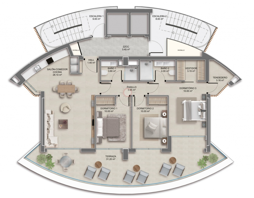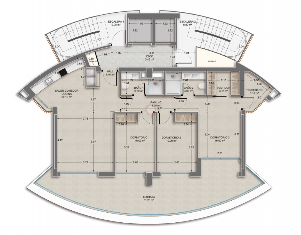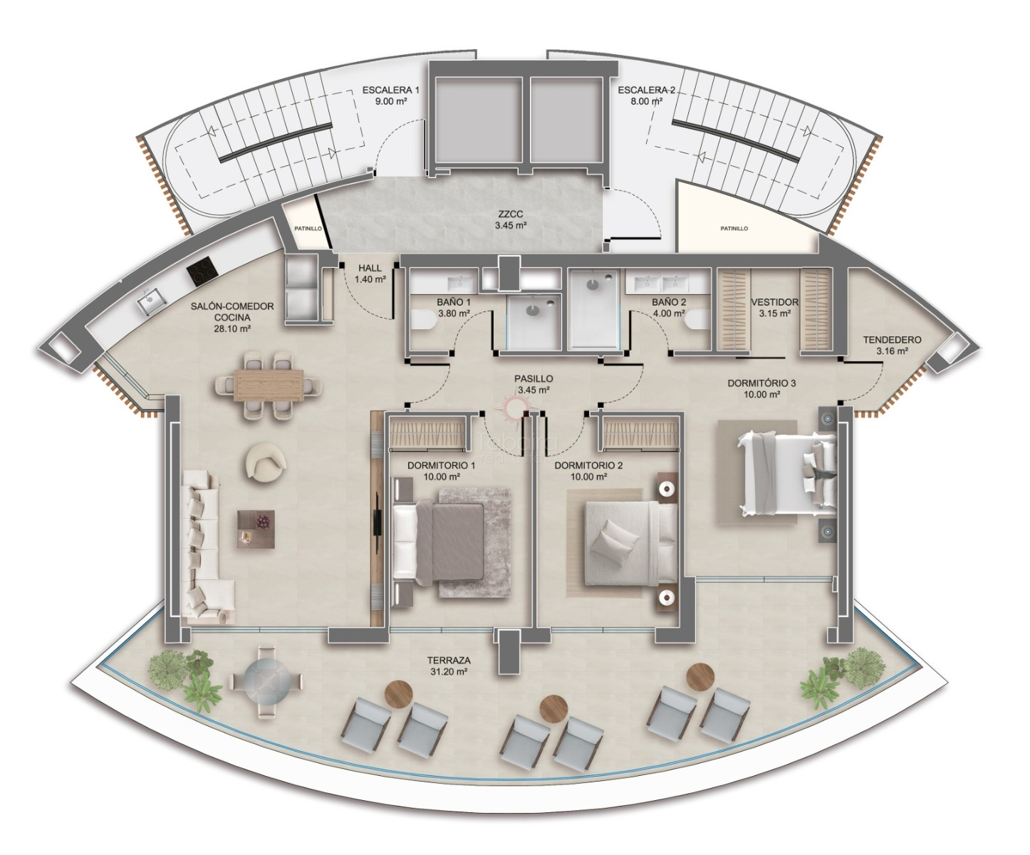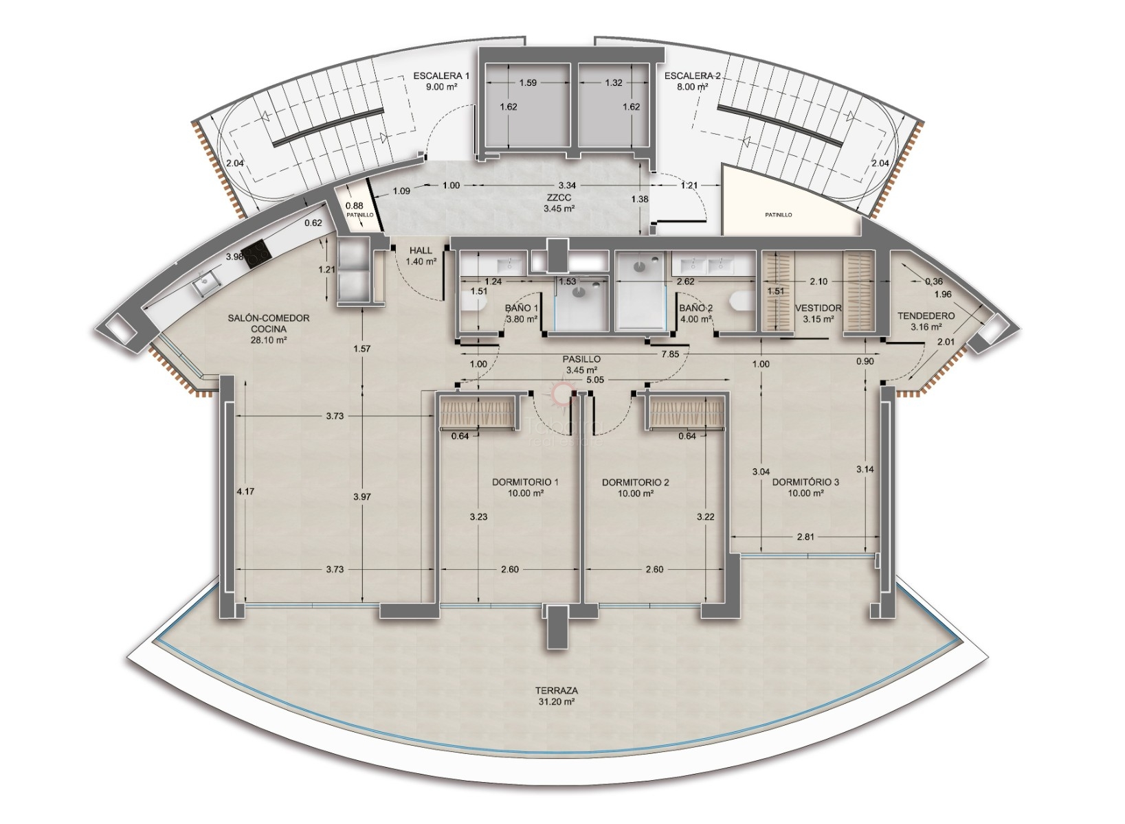 El apartamento forma parte de un moderno complejo residencial con ascensor, piscina comunitaria bien cuidada y plazas de aparcamiento y trasteros opcionales en el garaje subterráneo. La propiedad destaca por su alta calidad de construcción y sus acabados exclusivos. Con una superficie construida de aproximadamente 126,91 m², la vivienda ofrece una distribución bien pensada. El espacio principal es el amplio salón-comedor con cocina abierta, de unos 28,10 m², que tiene acceso directo a la gran terraza orientada al sur (aprox. 36,30 m²) con vistas al mar. La vivienda dispone de tres dormitorios y dos baños completamente equipados. La suite principal cuenta con baño en suite y vestidor. Los otros dos dormitorios disponen de armarios empotrados. Todos los dormitorios tienen acceso directo a la terraza, lo que proporciona una sensación de amplitud y luminosidad. La oferta se completa con un práctico cuarto de lavandería y una distribución moderna y funcional que garantiza el máximo confort.