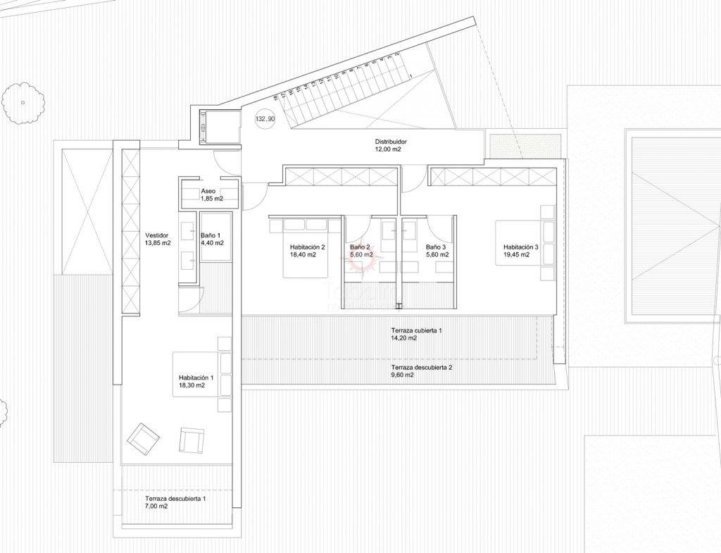 426,0 mètres de construction répartis sur le sol, le sol inférieur et les premiers étages. Au rez-de-chaussée, hall d'entrée escalier et ascenseur de passagers, grand espace ouvert ouvrant sur la piscine et les terrasses couvertes, avec coin salon et salle à manger et cuisine de luxe entièrement équipée avec l'île centrale, une grande chambre avec dressing et salle de bains, et vestiaire. Le premier étage se compose d'une galerie couloir regardant vers le bas dans le hall d'entrée, la deuxième chambre à coucher principale avec terrasse balcon privé, et deux autres suites de chambre ouvrant sur une grande terrasse. Le sol inférieur est relié à la maison principale par l'ascenseur et l'escalier offre un garage à deux voitures et 100 mètres de plus d'hébergement, y compris une salle de cinéma.