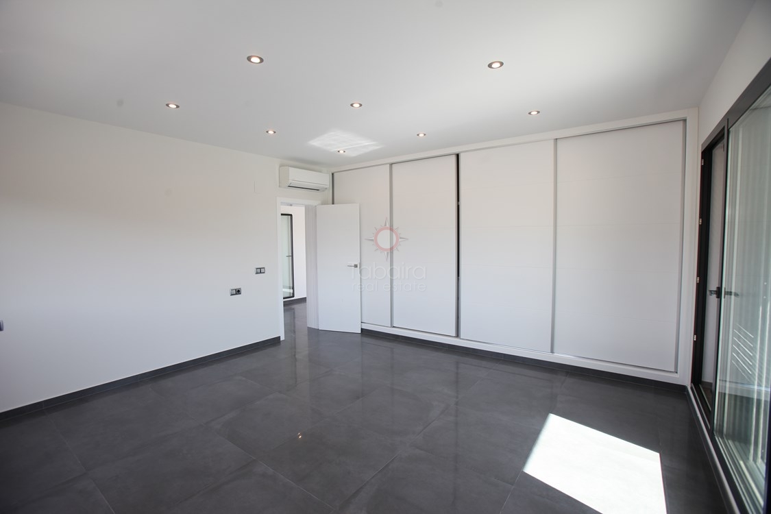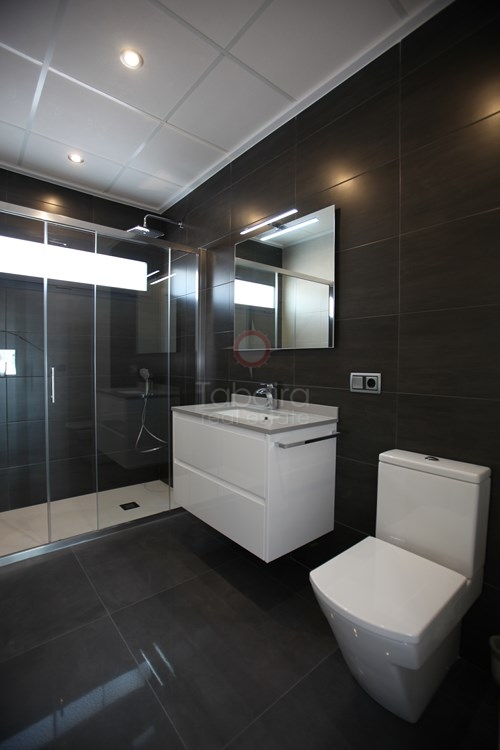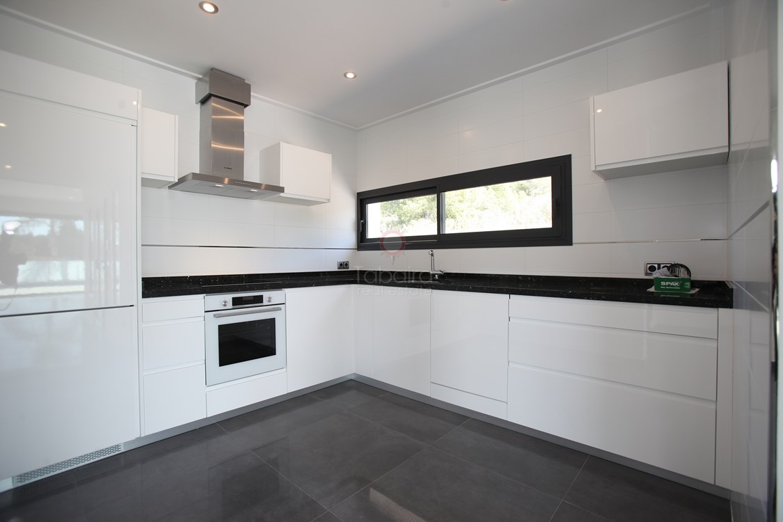 Villa moderne à vendre à Calpe, à 3km du centre, avec un terrain de 995m2 et une construction de 245m2 en deux hauteurs. Salon cuisine trois chambres et deux salles de bains.