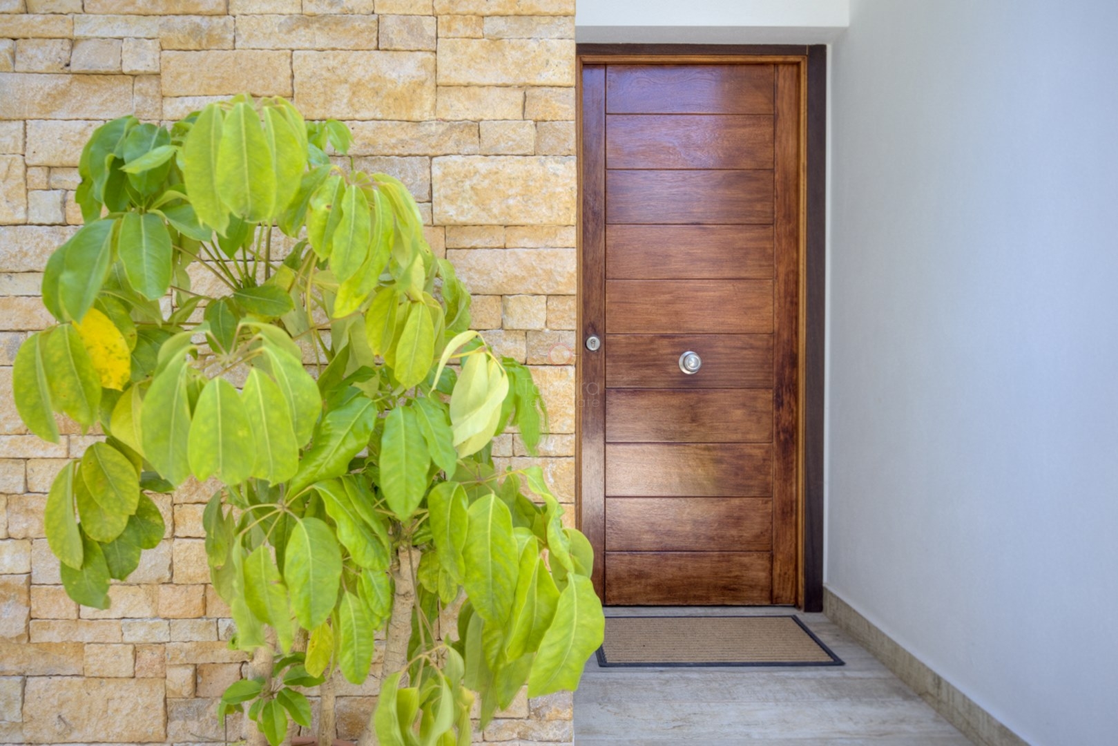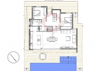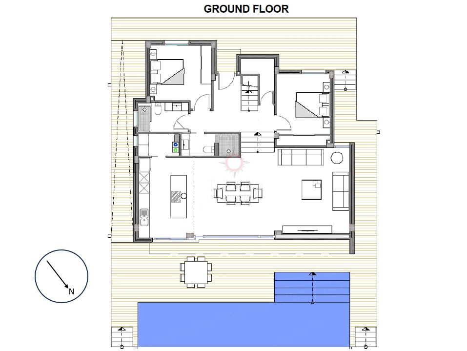 Rez-de-chaussée : Porche d'entrée couvert avec accès de plain-pied depuis le parking, hall d'entrée avec placards de rangement, deux chambres doubles avec placards intégrés, deux salles de bains avec douche, une cuisine moderne avec buanderie attenante et un espace de vie ouvert avec accès à la terrasse de la piscine.
