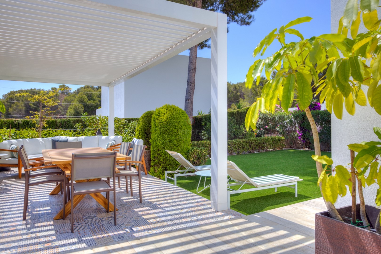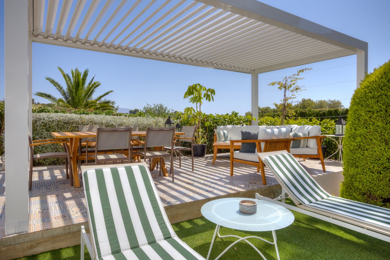 La villa dispose d'un spacieux séjour ouvert, s'étendant sur toute la largeur de la propriété et donnant directement sur la piscine ensoleillée par des baies vitrées coulissantes motorisées.