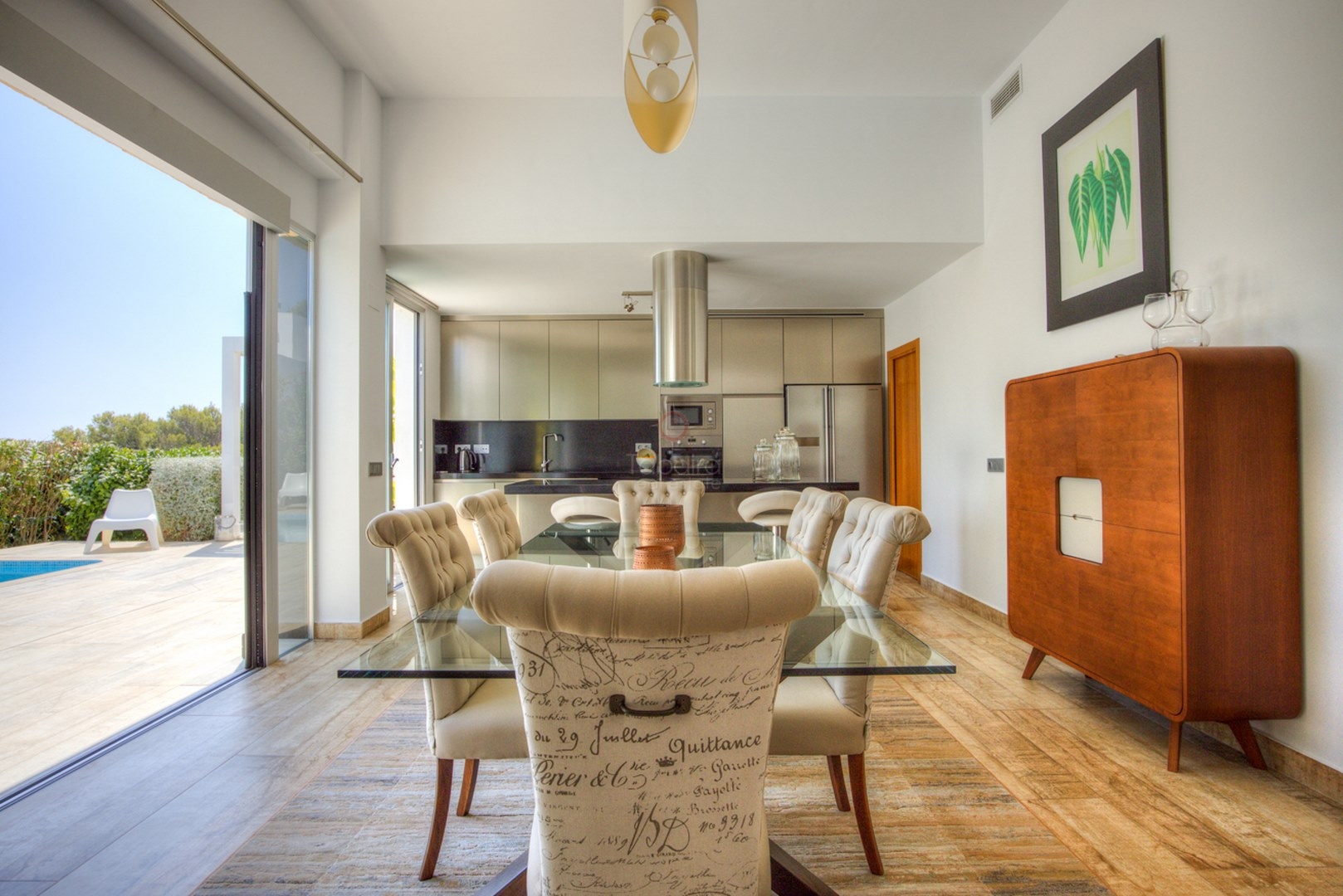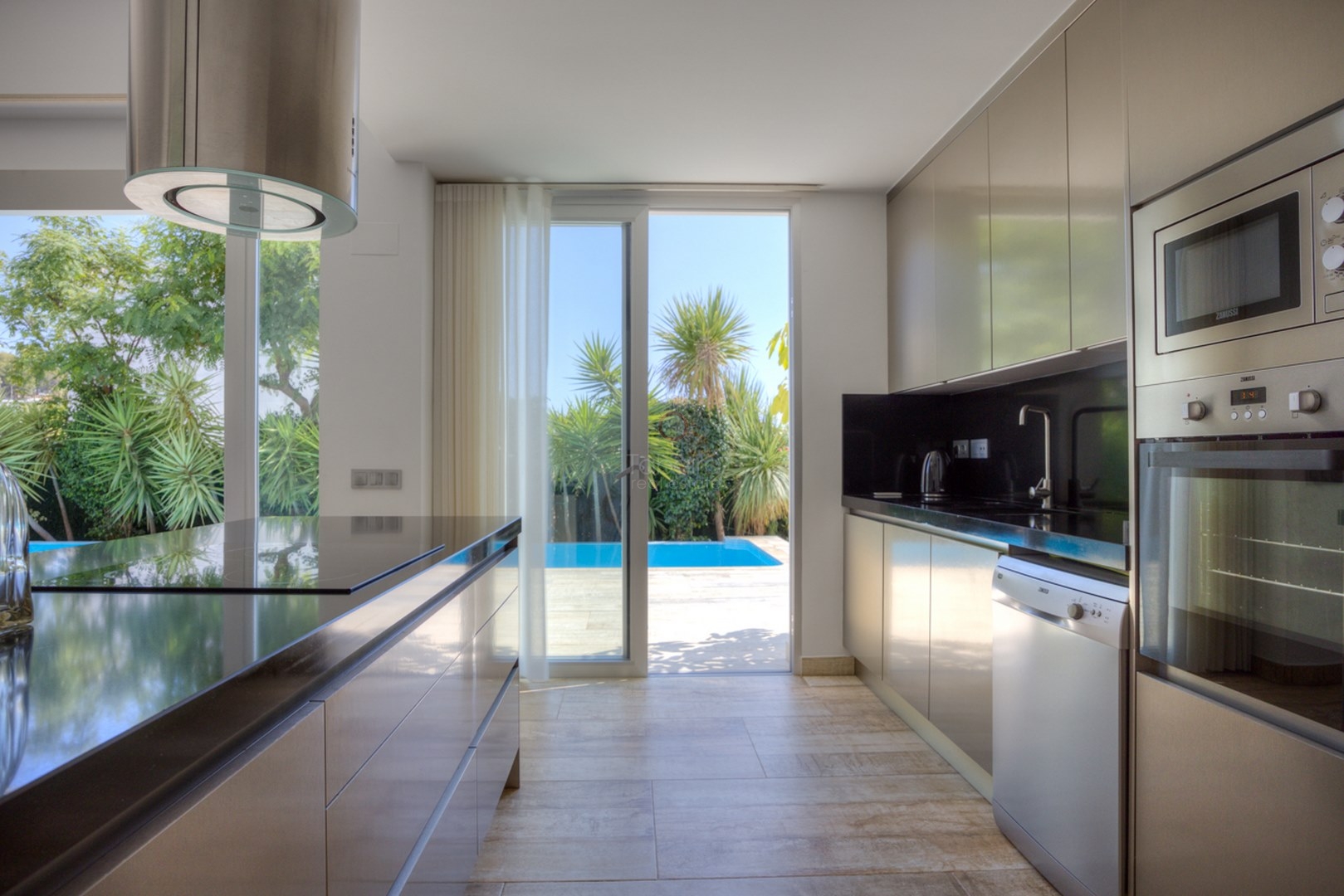 La villa dispose de quatre grandes chambres, de salles de bains contemporaines et d'une cuisine ouverte moderne équipée de meubles laqués, de plans de travail en granit et d'électroménagers intégrés de qualité.