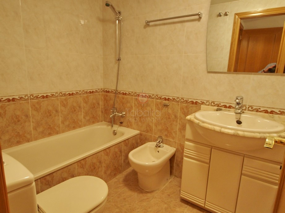 Appartement in het centrum van Moraira 120m2. Met drie slaapkamers, twee badkamers, een eigen badkamer, woonkamer, keuken en een balkon met uitzicht op zee. Garage Ramp, airconditioning en warmte, meubels, marmeren vloeren en dubbele beglazing PVC ramen.