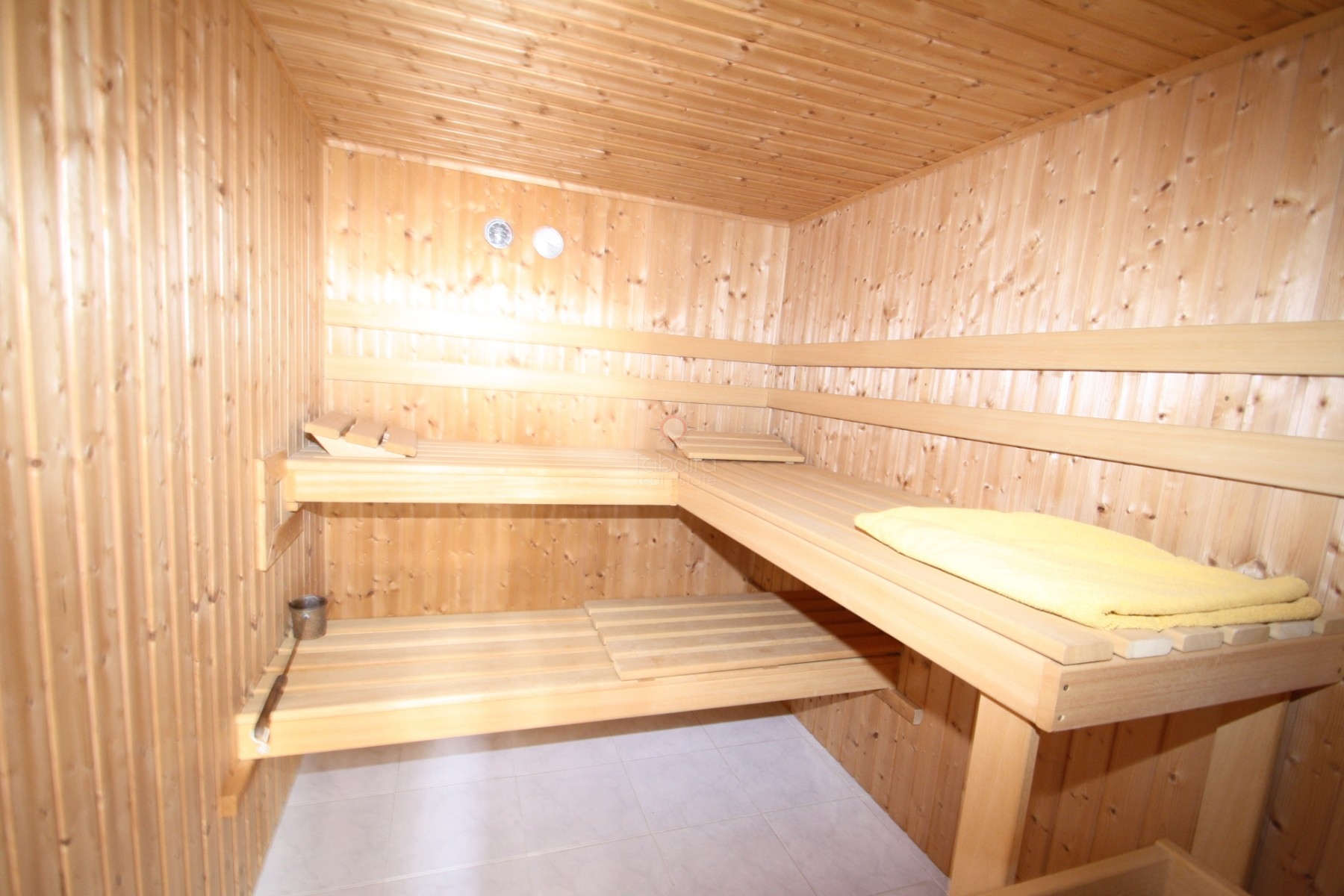 Onder het balkonterras is een grote doucheruimte met sauna aan de achterzijde. Daarnaast een berging. Het zwembad heeft de machinekamer van het zwembad, een buitendouche en een zwembadverwarmer die al enkele jaren niet is gebruikt.