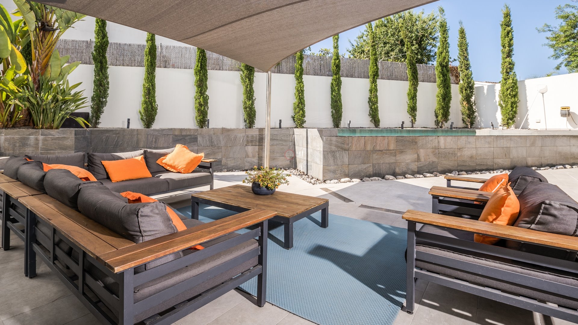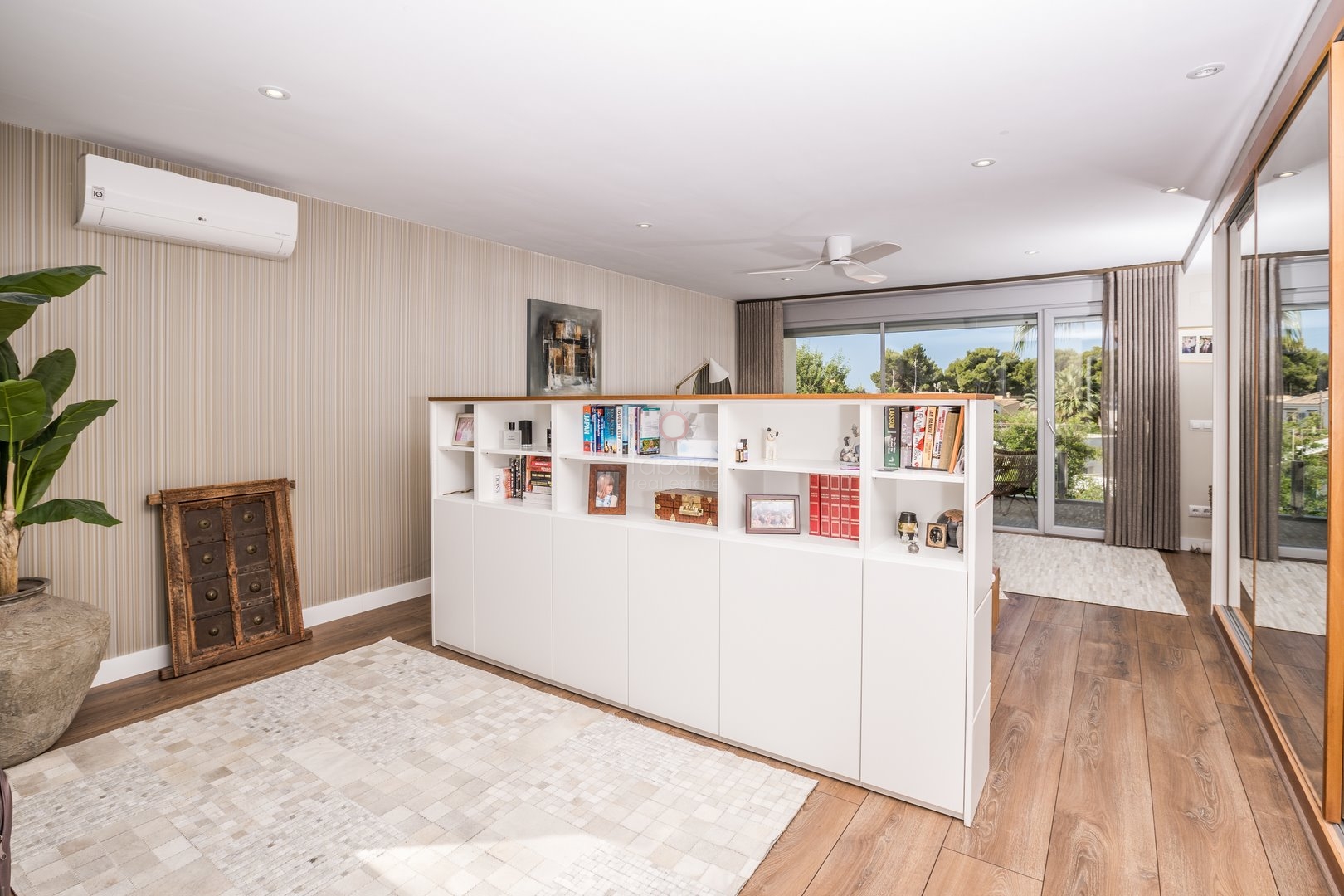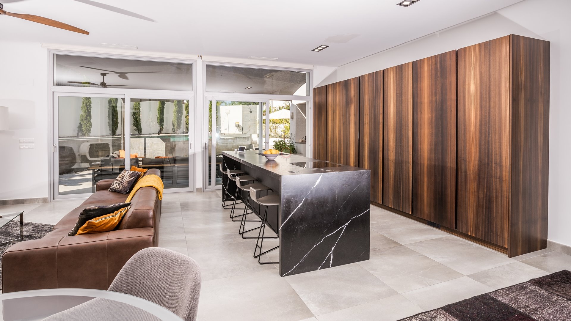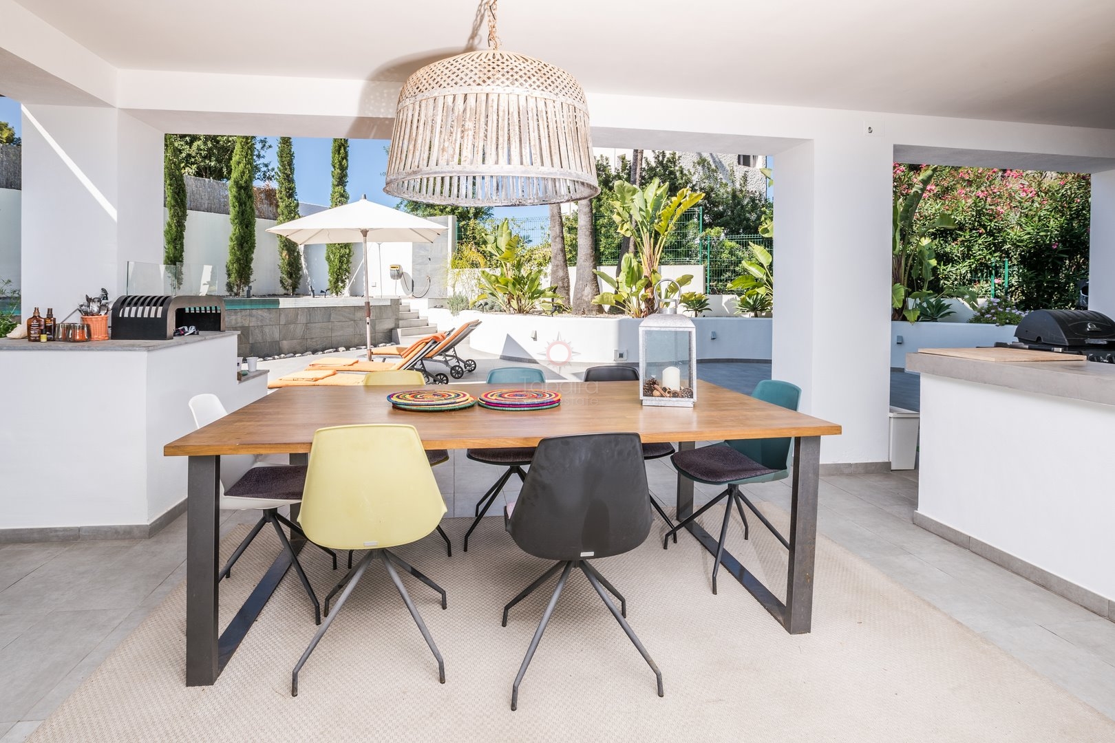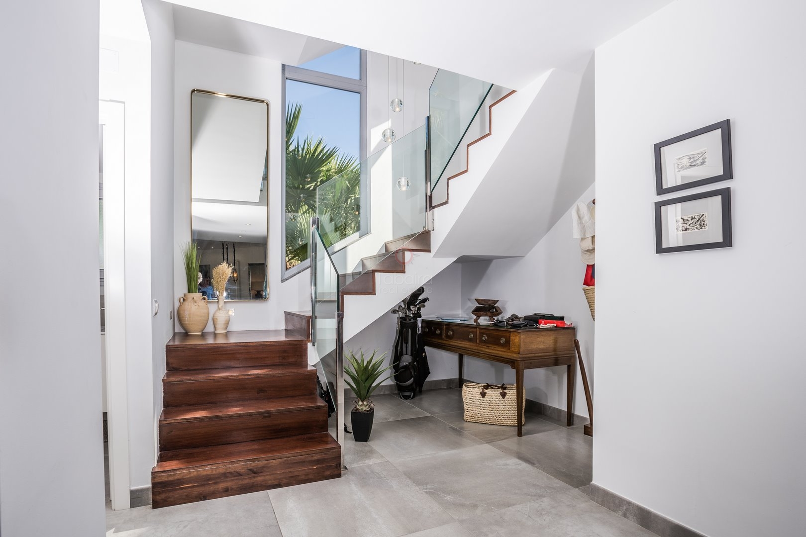De begane grond beschikt over een ruime woon- en eetkamer met grote glazen deuren die communiceren naar het terras bij het zwembad. Een moderne keuken met een groot centraal open eiland naar de leefruimte. Entree, hal met gratis toilet en een kenmerkende trap, bijkeuken / wasruimte en een bar.