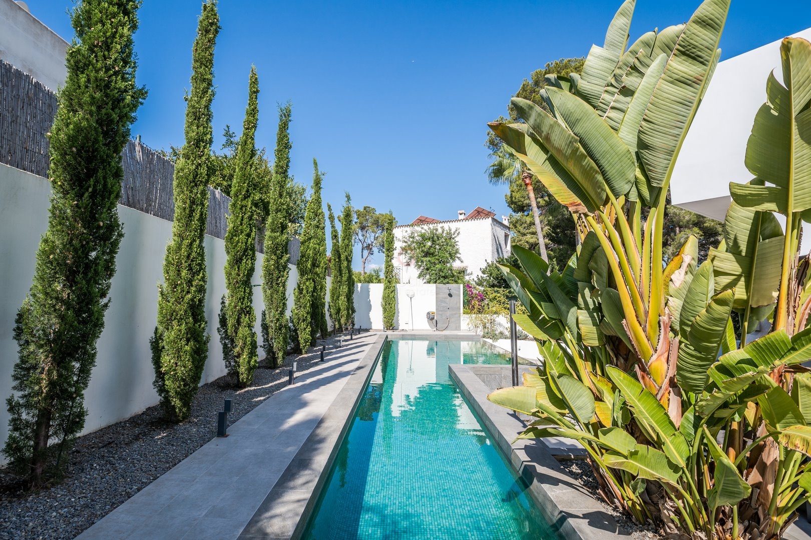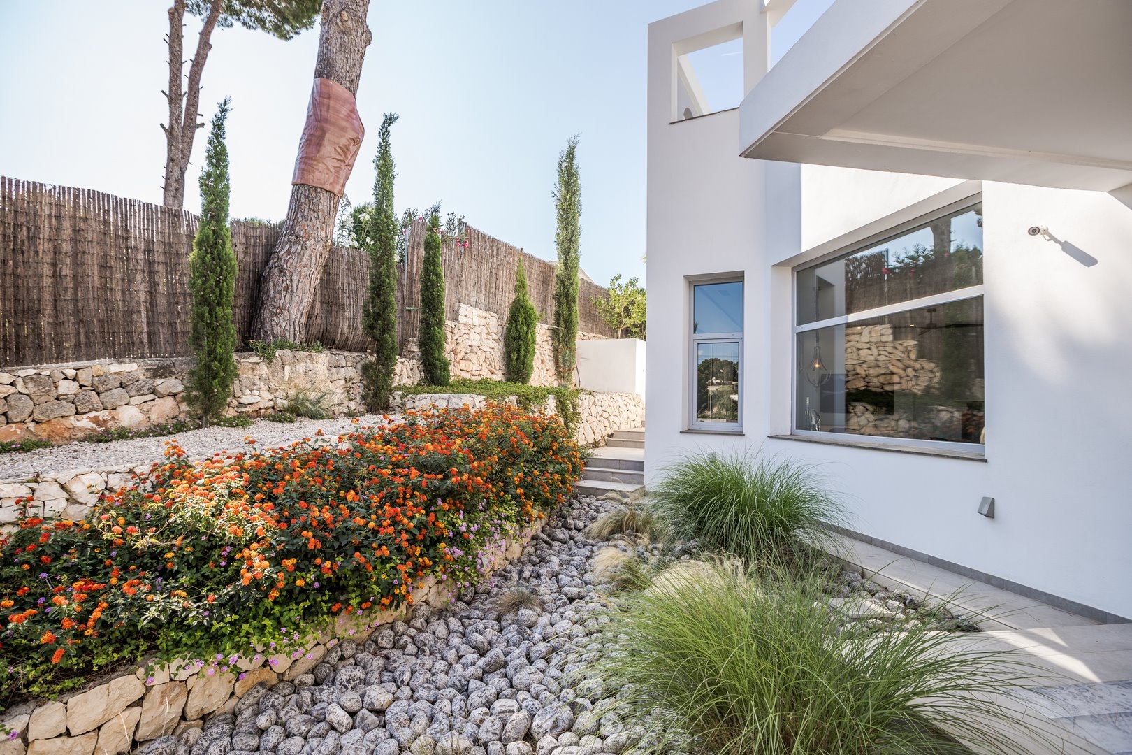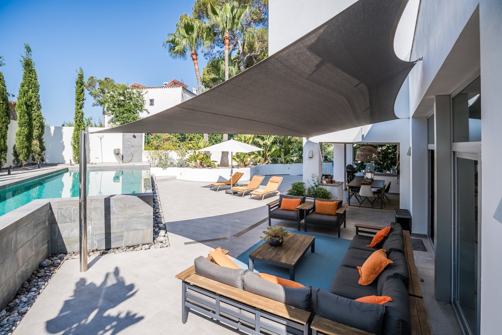 Buiten uitgestrekte terrassen en mediterrane tuinen omringen een zoutwaterzwembad van 16 meter met een watervalfunctie, er zijn overdekte loungeruimtes en een barbecueterras dat direct communiceert met het woongedeelte van het pand. Bij de ingang van de villa is een afgesloten overdekte parkeerplaats met een autolader.