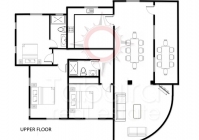 De villa is verdeeld over twee verdiepingen, die met elkaar verbonden zijn door een interne trap. De belangrijkste woonruimtes bevinden zich op de bovenverdieping, waar de woonkamers direct uitkomen op de tuin en het terras bij het zwembad. Deze verdieping bestaat uit drie tweepersoonsslaapkamers, twee badkamers (waarvan één en suite), een lichte woonkamer met adembenemend uitzicht op zee vanuit elk raam, een royale eetkamer, een volledig uitgeruste keuken en een groot overdekt terras met uitzicht op het zwembad en de zee, met uitzicht tot aan de Peñón de Ifach in Calpe.
