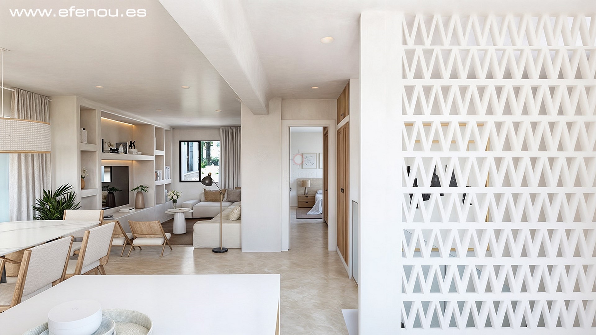 This stunning villa showcases a contemporary Mediterranean Ibizan design, blending timeless elegance with modern sophistication. Four generously proportioned bedrooms, including two luxurious master suites (one on the ground floor and one on the first floor), provide ample space for relaxation and privacy. The open-plan living area creates a seamless flow between the dedicated lounge and dining spaces, perfect for entertaining and family gatherings. A designer, fully equipped kitchen with a breakfast bar island serves as the heart of the home, combining style and functionality.