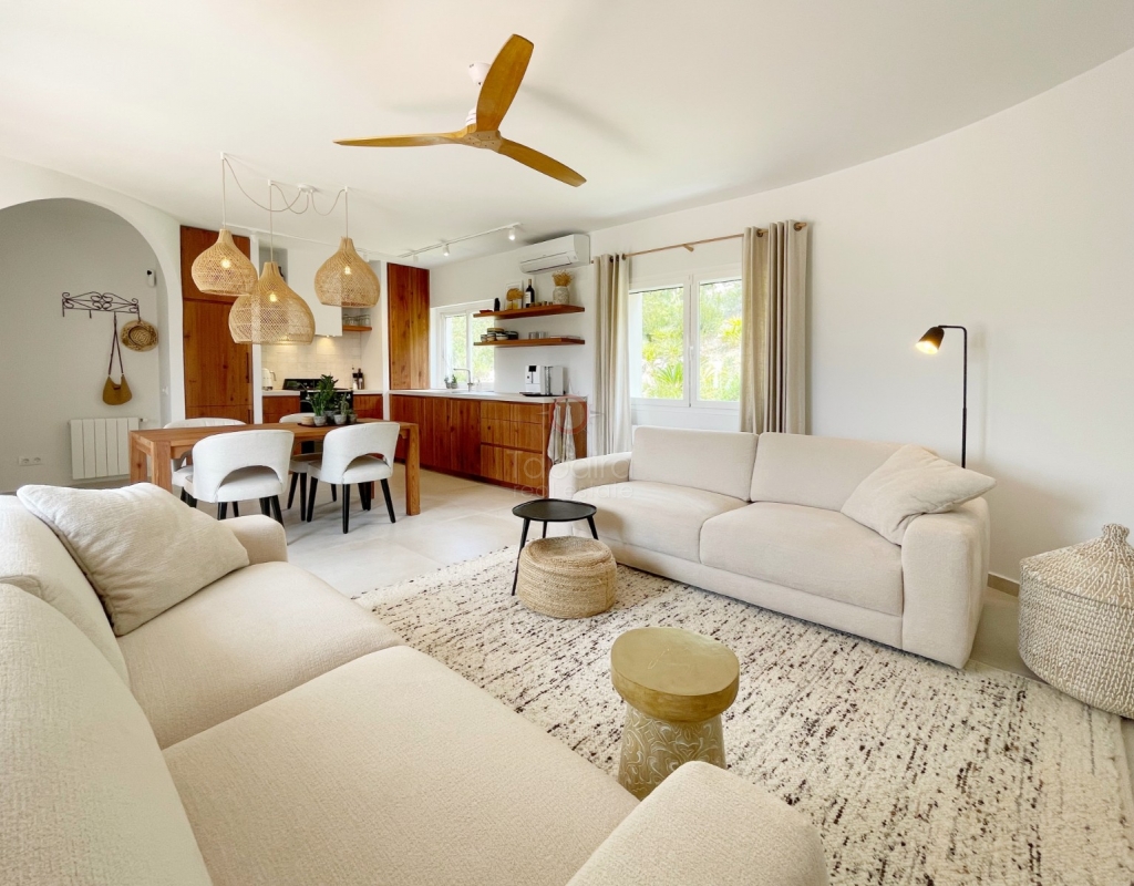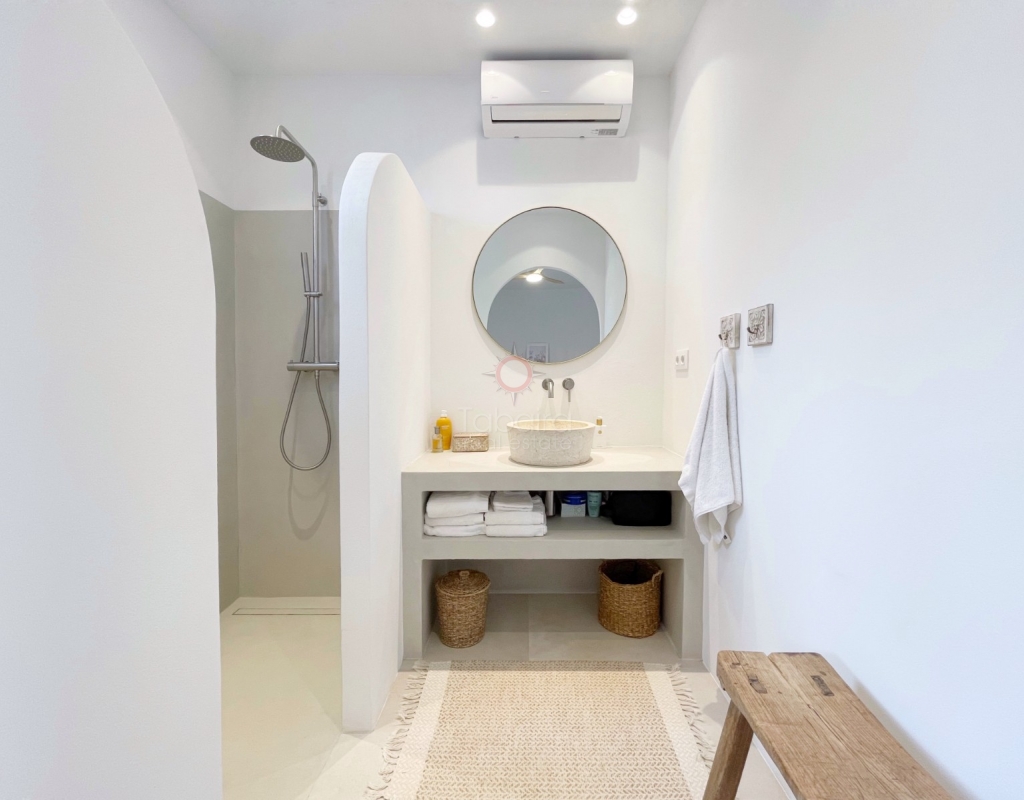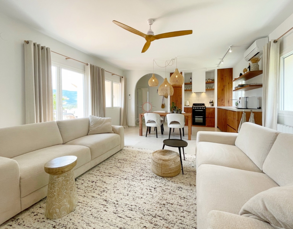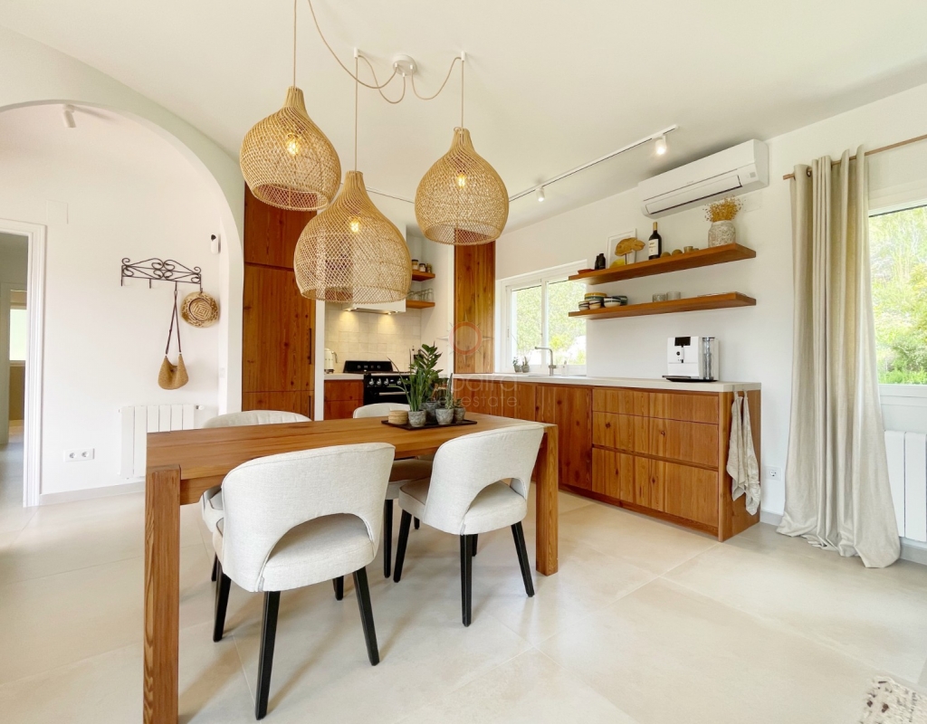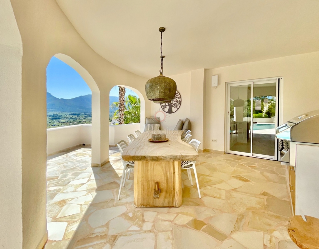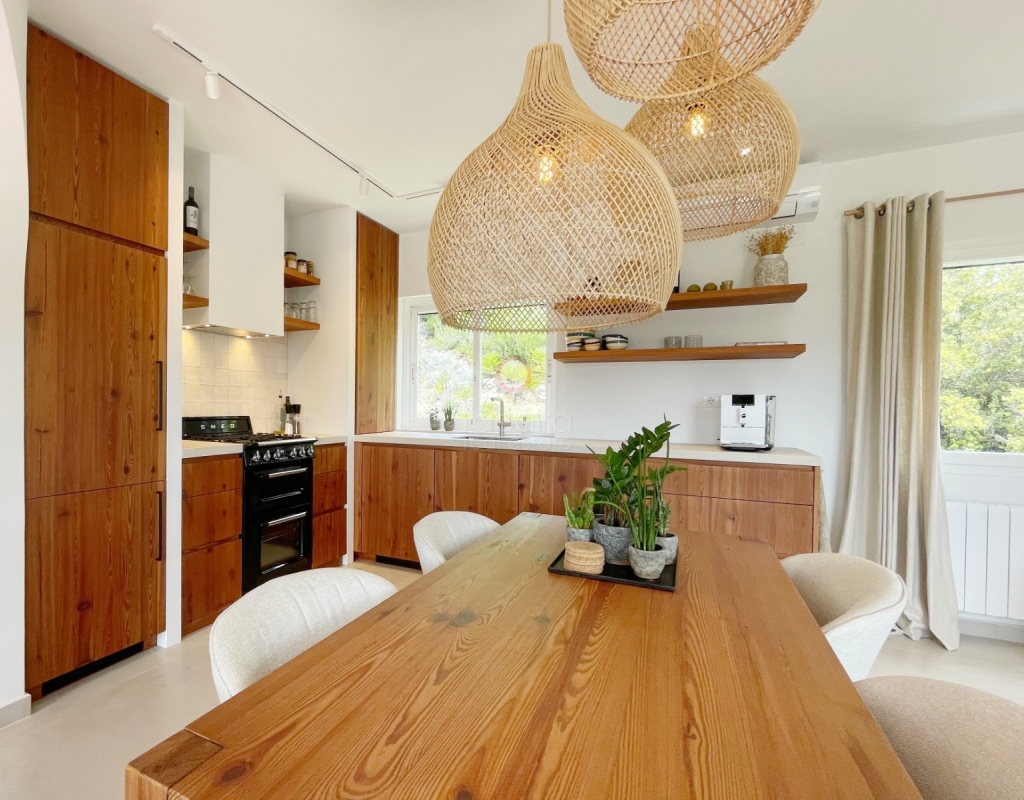Welcome to this completely ibiza-style renovated villa in Jalon, which underwent a high-quality overhaul in 2023. Really everything has been renewed: from walls, ceilings and floors to bathrooms, painting and installations. The house radiates luxury, comfort and quality and is finished to perfection. The house is equipped with all modern conveniences such as air conditioning in all rooms, mosquito nets, LED lighting (Wever & Ducré and built-in spots) and a new electrical installation with an extensive distribution board. The recent Vaillant Eco Tec Pure central heating boiler (2023) provides efficient heating via radiators.