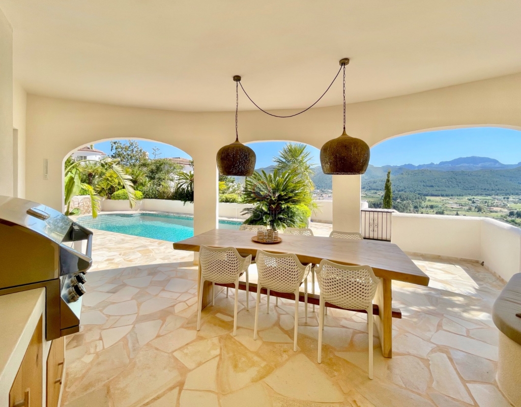 A number of steps lead up to this oasis of peace and privacy with sweeping views over Jalon and the entire valley. The property occupies 2 levels, the living floor offers a spacious living room with open kitchen, 3 bedrooms, 2 luxury bathrooms finished in microcement (one of which is en suite) and a south-facing naya. The lower floor offers a fourth bedroom with an en suite bathroom (again in microcement) a laundry room/utility room with the washer & dryer built in and a large American fridge. These rooms are connected to a larger naya with spacious outdoor kitchen with a microcement top, stainless steel gas barbecue (Napoleon 2023) and hot/cold water supply. Directly in front of this is the 8 x 4 M heated swimming pool surrounded by a lovely terrace, outdoor shower and a beautifully landscaped and illuminated garden. Here you will also find an additional storage room of approx. 60 m² which offers various possibilities for your own interpretation. Additional security is provided by a fence around the plot, an alarm system and camera surveillance.