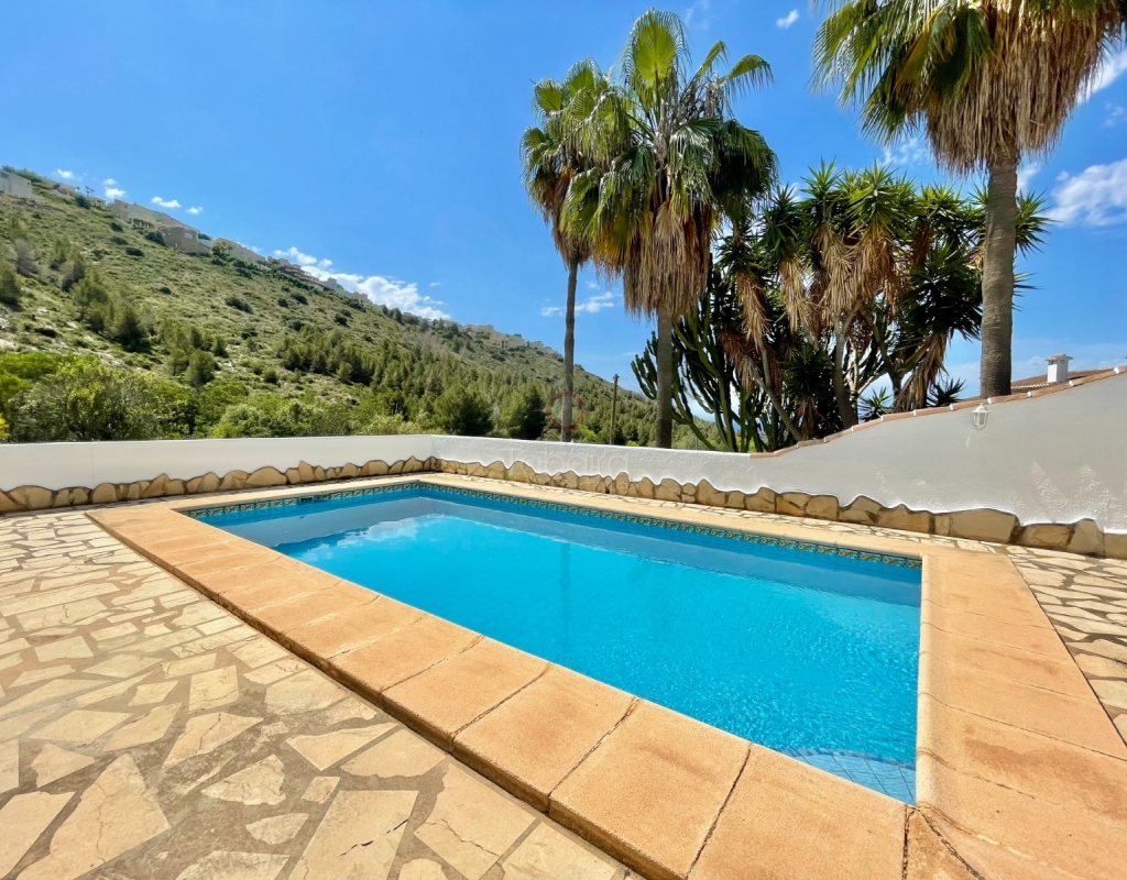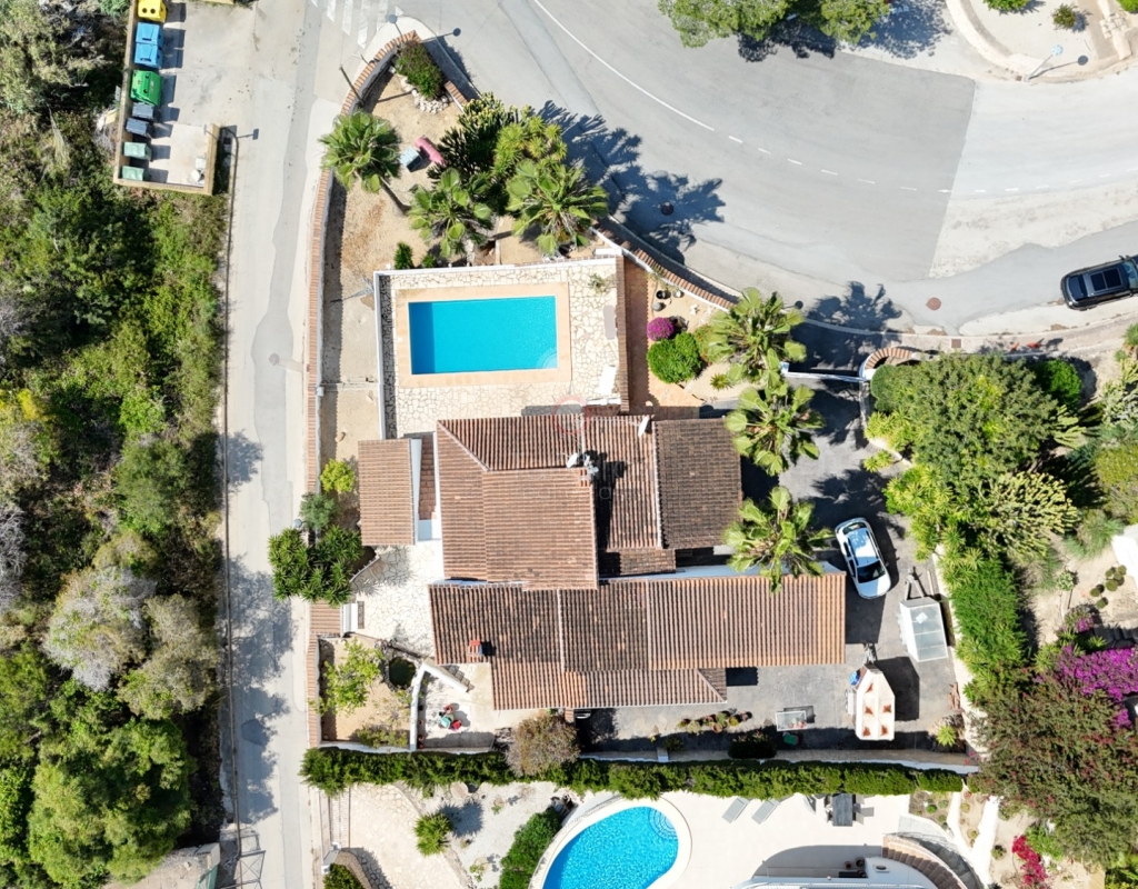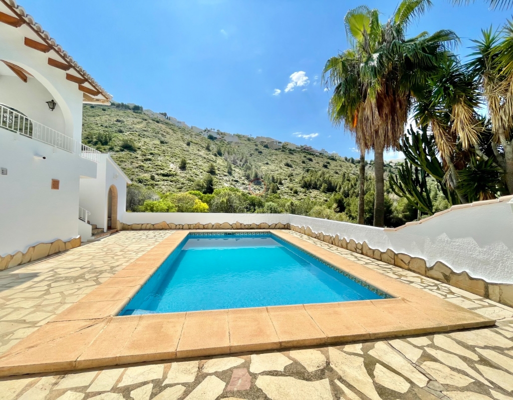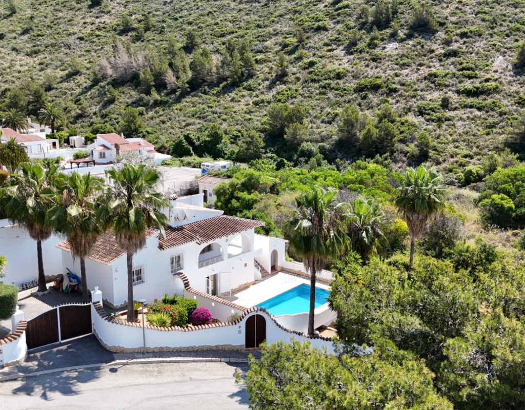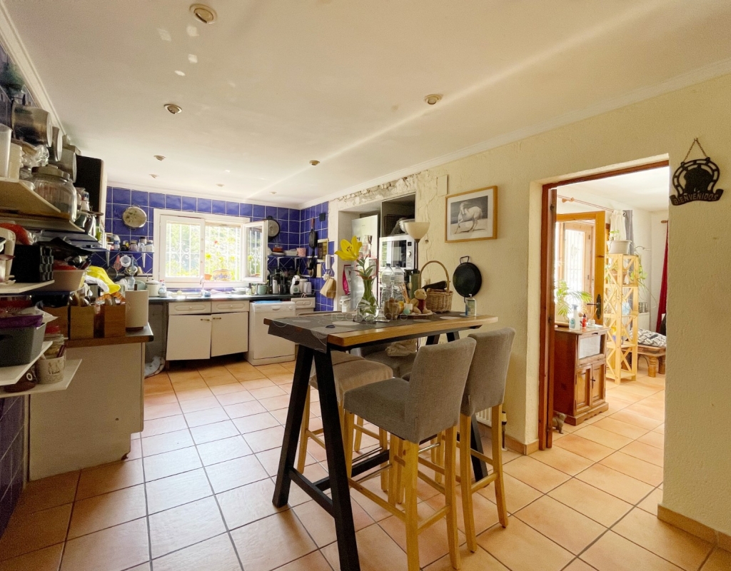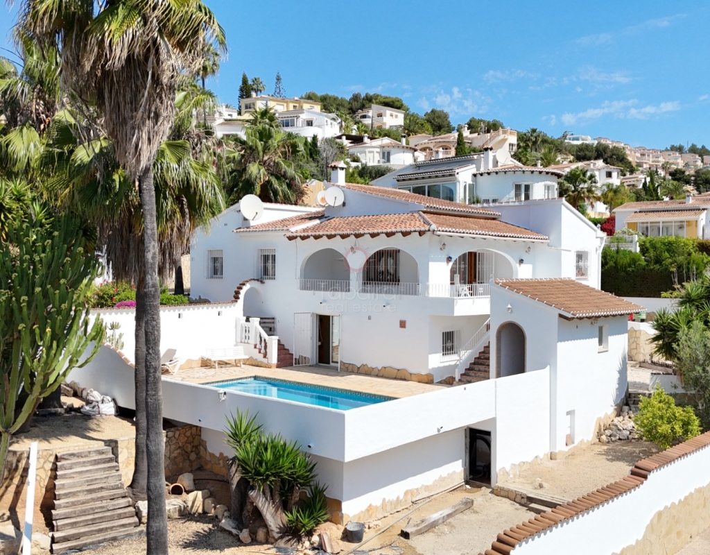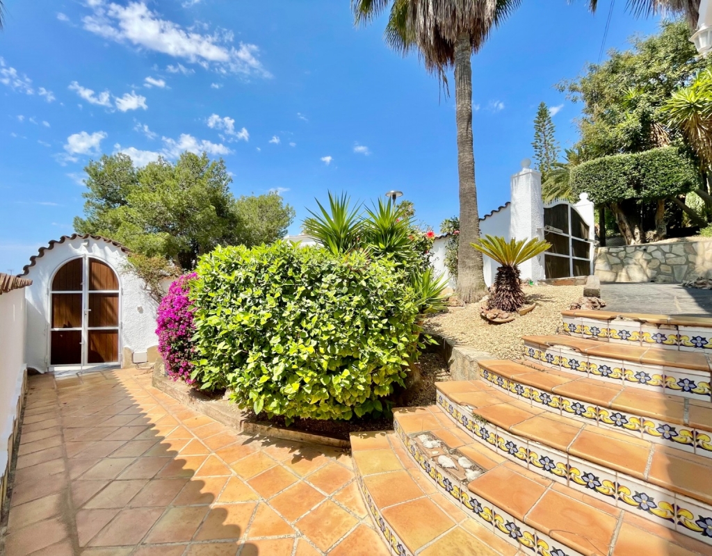 This charming Mediterranean-style villa is located in a quiet and green residential area of Benitachell, a short distance from the sea and amenities. The property is set on a spacious plot of 976 m² and offers 275 m² of living space, spread over two floors. The typical Mediterranean architecture with round arches and attractive Mediterranean garden immediately creates a warm and authentic feeling. The construction is solid and well maintained, but offers plenty of opportunities for modernisation in terms of aesthetics. An excellent opportunity to transform this villa completely to your own taste and style into your dream home on the Costa Blanca North. Description of the property The upper floor consists of a spacious and bright living room with direct access to the spacious naya (covered terrace), from where you can enjoy beautiful views of the green valley and the sea. Adjacent to this is the kitchen. This floor also has three comfortable double bedrooms and two separate bathrooms. A practical laundry room with extra storage space is accessible from the outside.The ground floor is accessible via both an internal staircase and an external staircase. Here you will find two more spacious double bedrooms, a generous family bathroom, a separate guest toilet and two large storage rooms, ideal for storage or possibly to be converted into extra living space. Outside is the 8 x 4 metre private swimming pool, surrounded by a spacious terrace where you can enjoy the sun to the fullest. Right next to it, you will find a covered outdoor kitchen and an additional guest toilet. The garden is landscaped with low-maintenance Mediterranean plants, including some beautiful palm trees and Mediterranean plants, which provide extra atmosphere and privacy. Spread across the plot are several terraces and seating areas, where you can enjoy the sun or shade at any time of the day. There is ample parking on site, including a spacious garage. Features Mature, low-maintenance garden with palm treesSpacious garage and ample parking on siteViews of the sea and a green valley Various possibilities for renovation Don't miss this opportunity and discover the possibilities of this property. Contact us today for more information or to schedule a viewing.