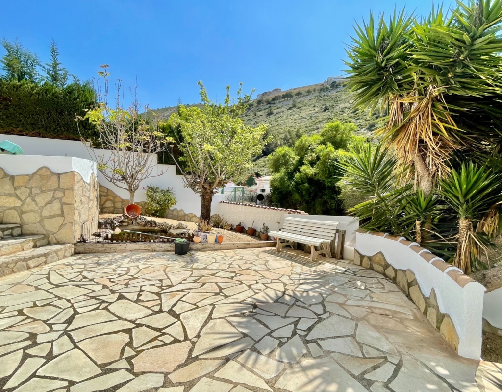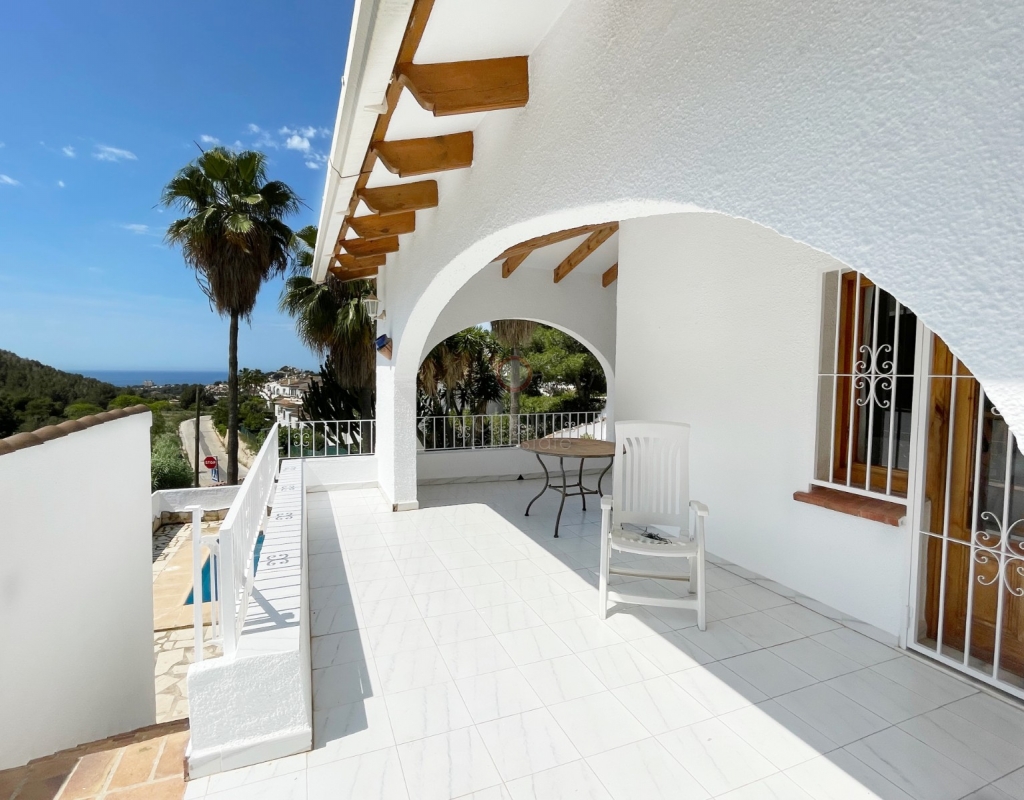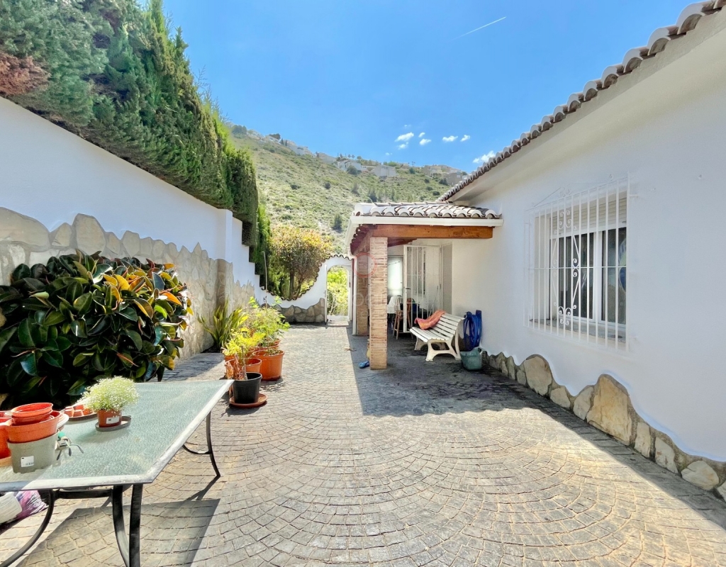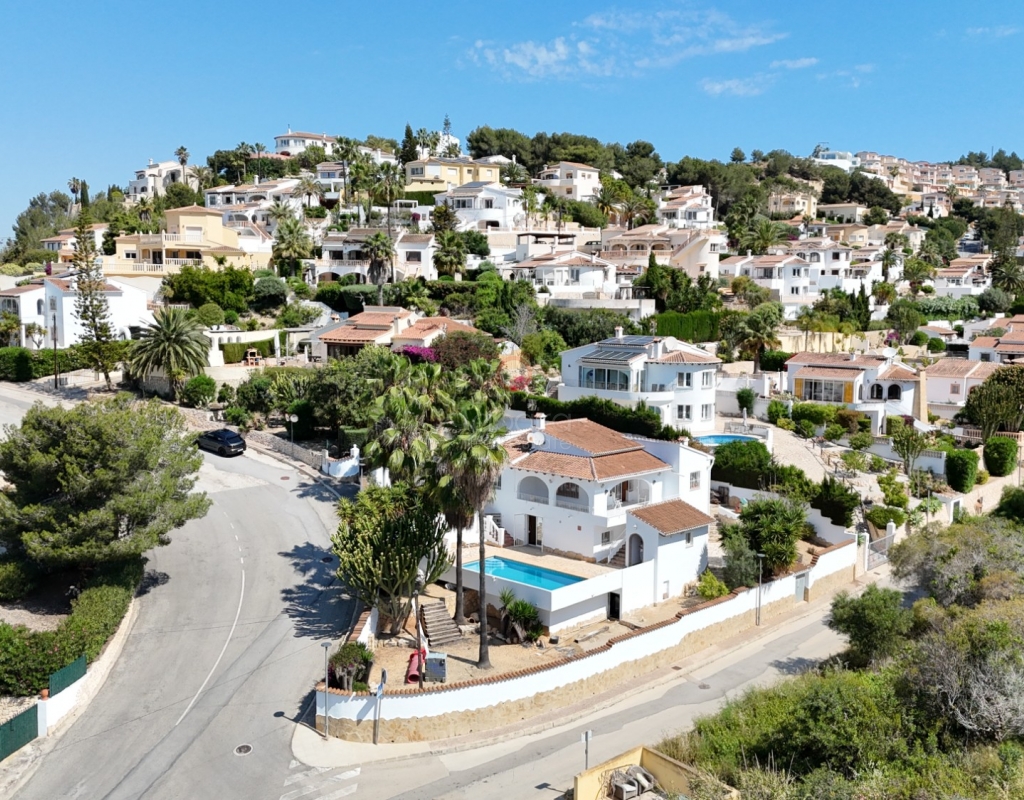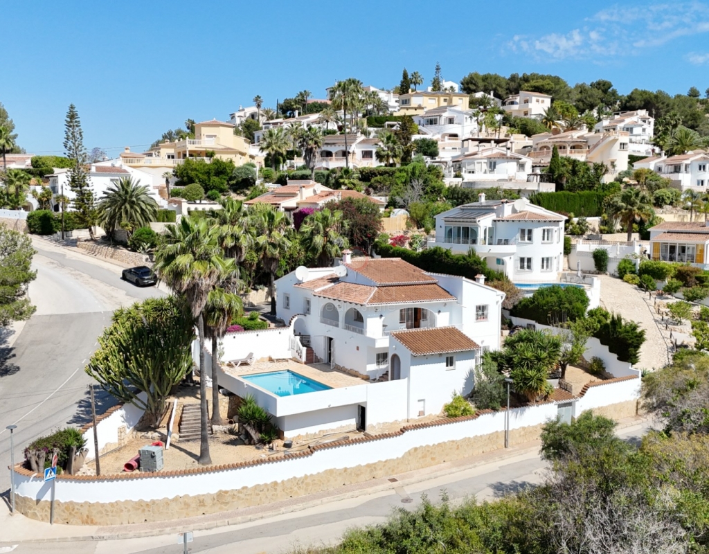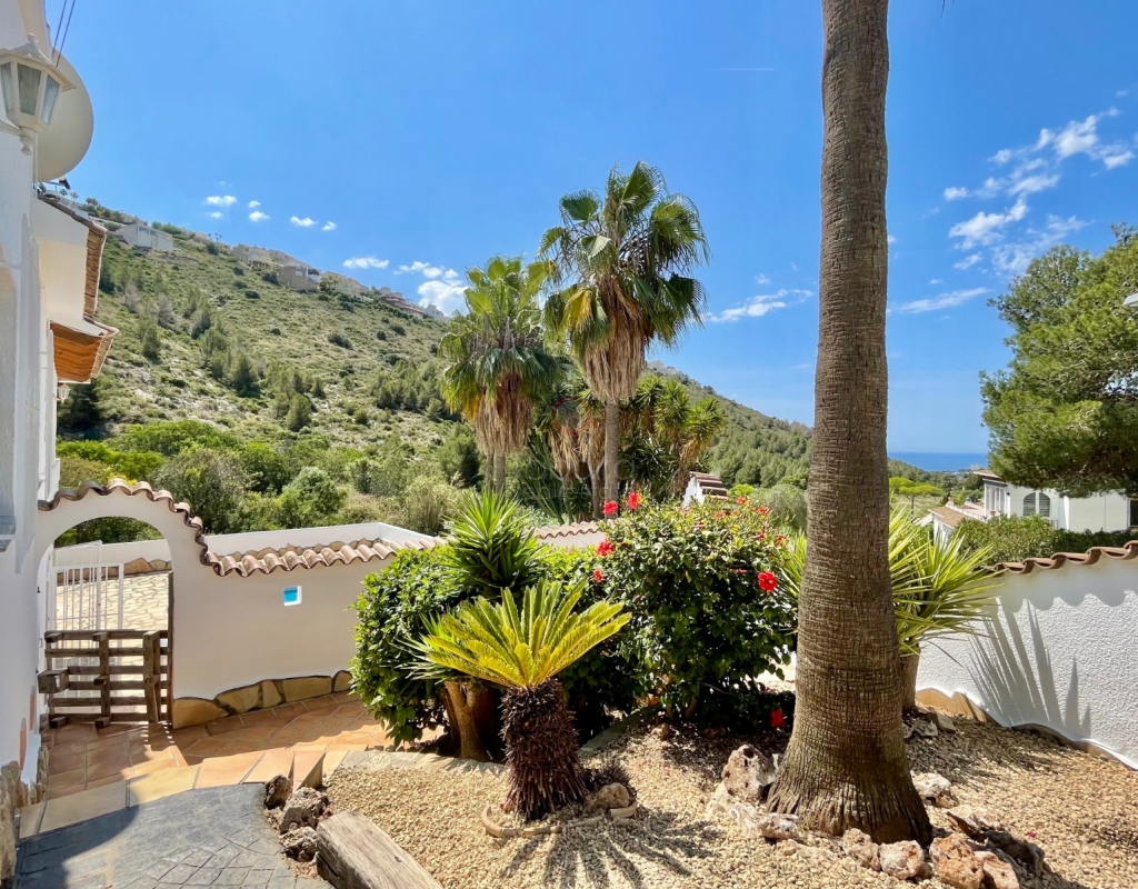This charming Mediterranean-style villa is located in a quiet and green residential area of Benitachell, a short distance from the sea and amenities. The property is set on a spacious plot of 976 m² and offers 275 m² of living space, spread over two floors. The typical Mediterranean architecture with round arches and attractive Mediterranean garden immediately creates a warm and authentic feeling. The construction is solid and well maintained, but offers plenty of opportunities for modernisation in terms of aesthetics. An excellent opportunity to transform this villa completely to your own taste and style into your dream home on the Costa Blanca North. Description of the property The upper floor consists of a spacious and bright living room with direct access to the spacious naya (covered terrace), from where you can enjoy beautiful views of the green valley and the sea. Adjacent to this is the kitchen. This floor also has three comfortable double bedrooms and two separate bathrooms. A practical laundry room with extra storage space is accessible from the outside.The ground floor is accessible via both an internal staircase and an external staircase. Here you will find two more spacious double bedrooms, a generous family bathroom, a separate guest toilet and two large storage rooms, ideal for storage or possibly to be converted into extra living space. Outside is the 8 x 4 metre private swimming pool, surrounded by a spacious terrace where you can enjoy the sun to the fullest. Right next to it, you will find a covered outdoor kitchen and an additional guest toilet. The garden is landscaped with low-maintenance Mediterranean plants, including some beautiful palm trees and Mediterranean plants, which provide extra atmosphere and privacy. Spread across the plot are several terraces and seating areas, where you can enjoy the sun or shade at any time of the day. There is ample parking on site, including a spacious garage. Features Mature, low-maintenance garden with palm treesSpacious garage and ample parking on siteViews of the sea and a green valley Various possibilities for renovation Don't miss this opportunity and discover the possibilities of this property. Contact us today for more information or to schedule a viewing.
