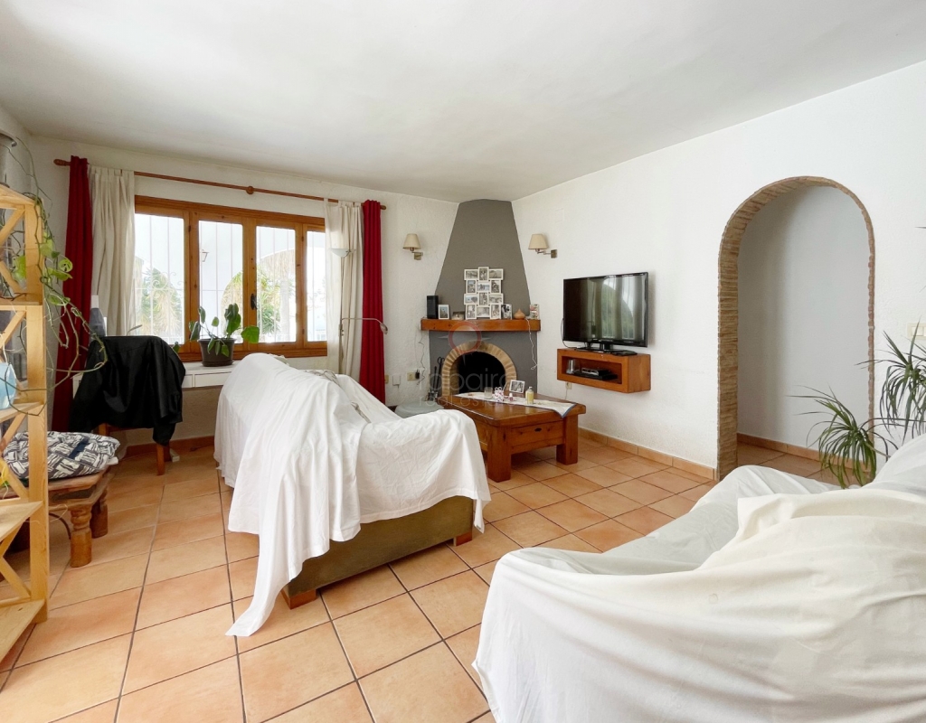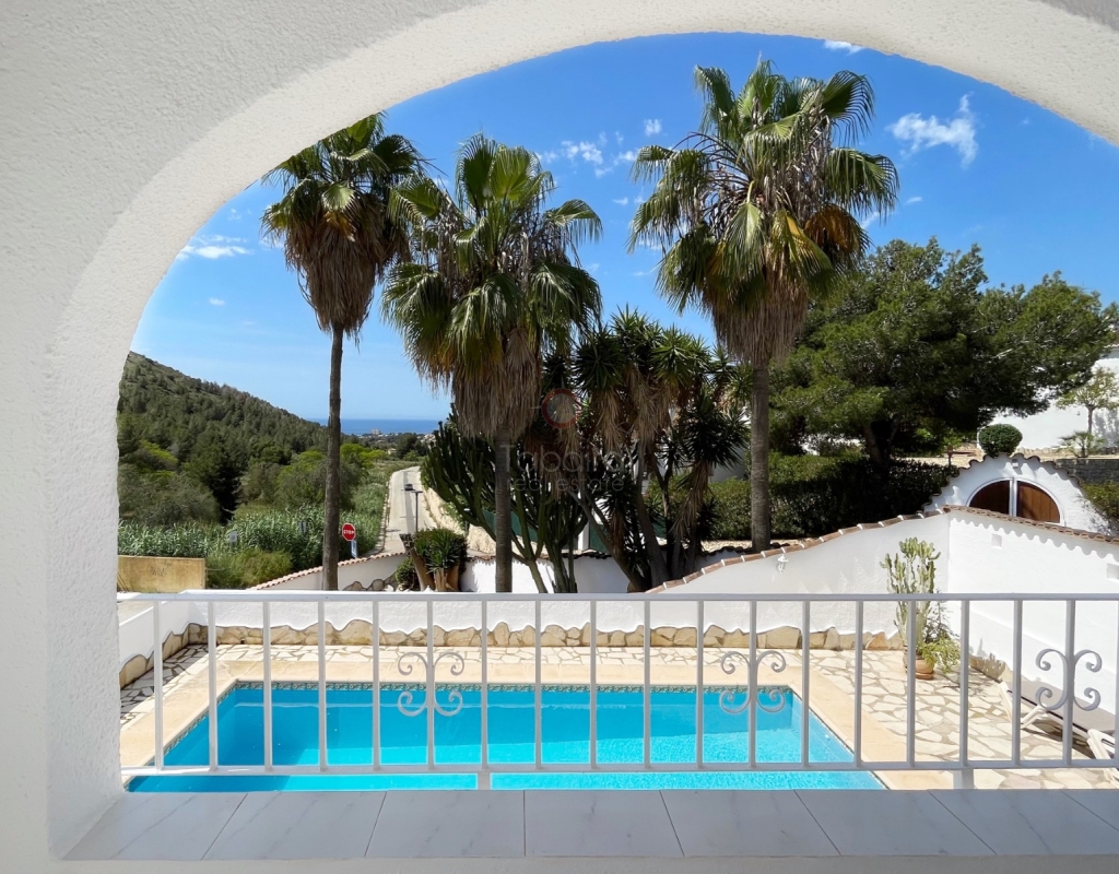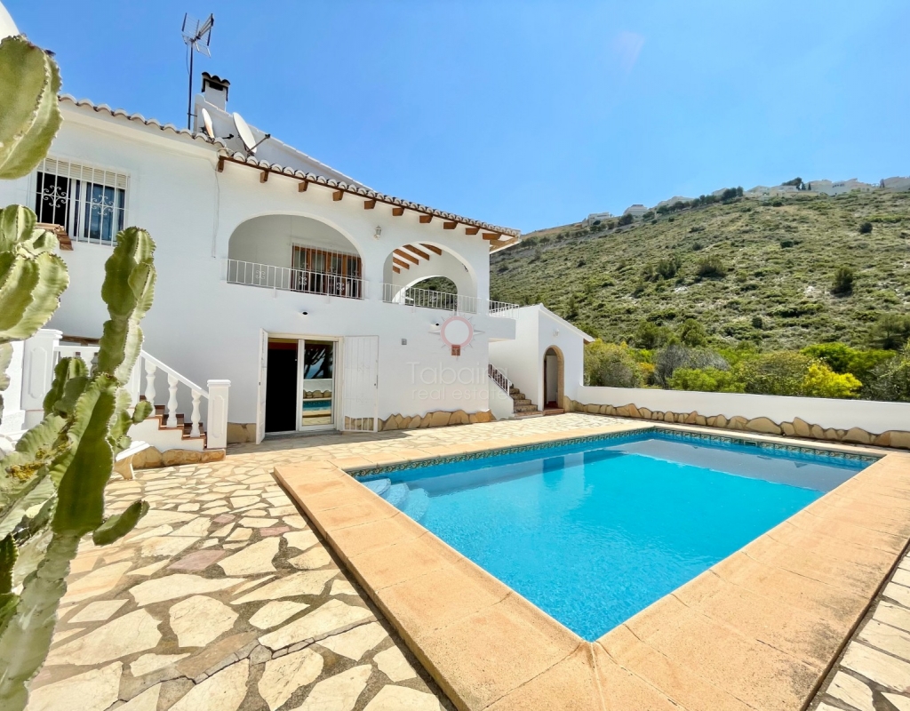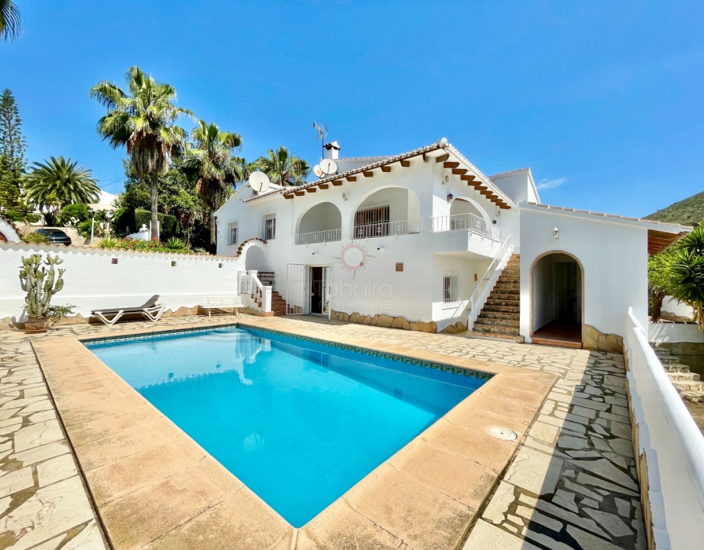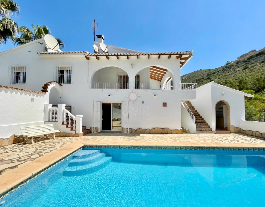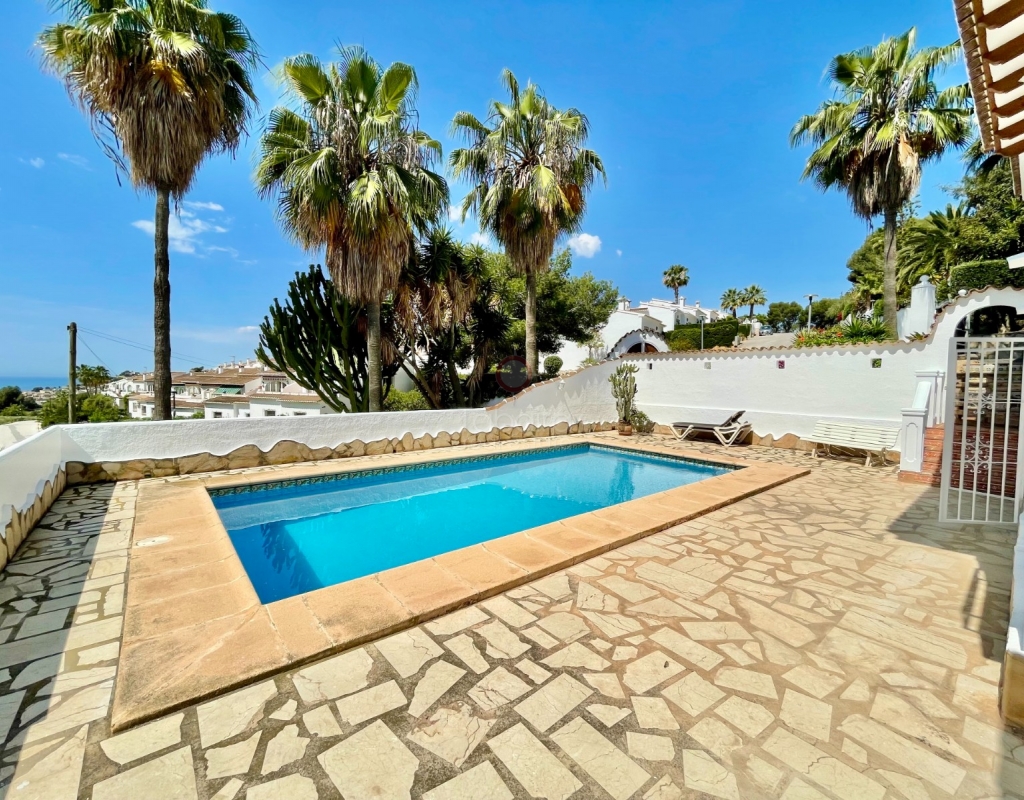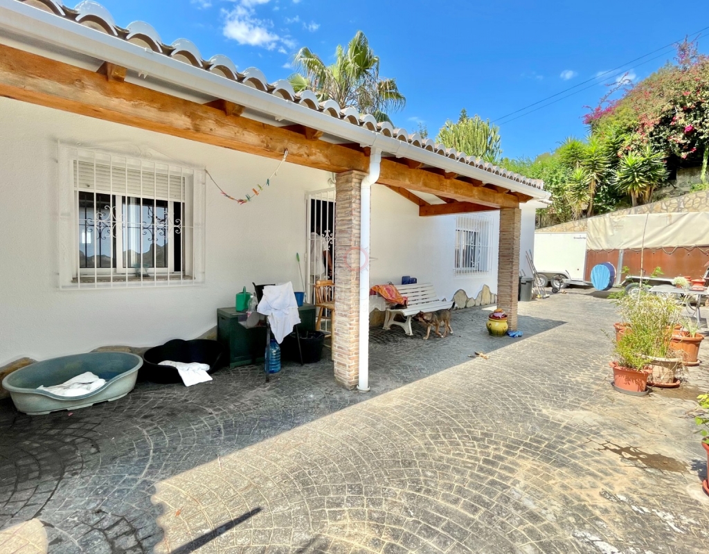 This charming Mediterranean-style villa is located in a quiet and green residential area of Benitachell, a short distance from the sea and amenities. The property is set on a spacious plot of 976 m² and offers 275 m² of living space, spread over two floors. The typical Mediterranean architecture with round arches and attractive Mediterranean garden immediately creates a warm and authentic feeling. The construction is solid and well maintained, but offers plenty of opportunities for modernisation in terms of aesthetics. An excellent opportunity to transform this villa completely to your own taste and style into your dream home on the Costa Blanca North. Description of the property The upper floor consists of a spacious and bright living room with direct access to the spacious naya (covered terrace), from where you can enjoy beautiful views of the green valley and the sea. Adjacent to this is the kitchen. This floor also has three comfortable double bedrooms and two separate bathrooms. A practical laundry room with extra storage space is accessible from the outside.The ground floor is accessible via both an internal staircase and an external staircase. Here you will find two more spacious double bedrooms, a generous family bathroom, a separate guest toilet and two large storage rooms, ideal for storage or possibly to be converted into extra living space. Outside is the 8 x 4 metre private swimming pool, surrounded by a spacious terrace where you can enjoy the sun to the fullest. Right next to it, you will find a covered outdoor kitchen and an additional guest toilet. The garden is landscaped with low-maintenance Mediterranean plants, including some beautiful palm trees and Mediterranean plants, which provide extra atmosphere and privacy. Spread across the plot are several terraces and seating areas, where you can enjoy the sun or shade at any time of the day. There is ample parking on site, including a spacious garage. Features Mature, low-maintenance garden with palm treesSpacious garage and ample parking on siteViews of the sea and a green valley Various possibilities for renovation Don't miss this opportunity and discover the possibilities of this property. Contact us today for more information or to schedule a viewing.