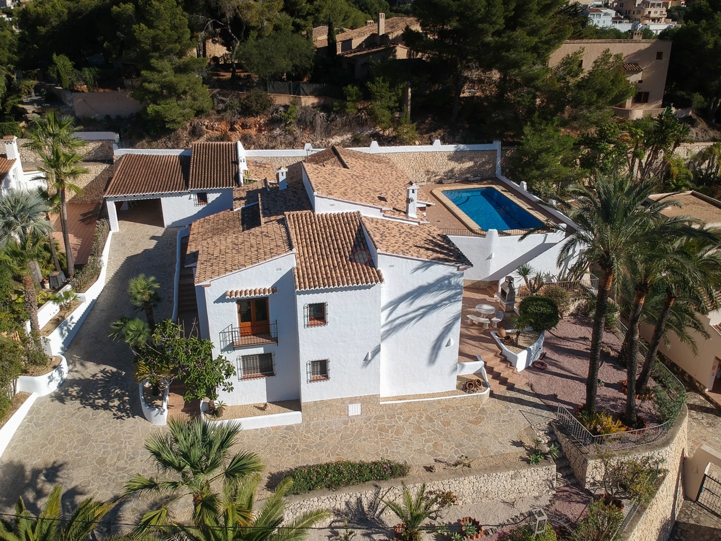 The property is completed by fully enclosed, low-maintenance Mediterranean gardens, beautifully stocked with a selection of palms and plants and finished with gravel for ease of care. If your search is focused on finding premium sea view villas in Moraira that perfectly blend space, high-end luxury, and an unbeatable location, this exceptional property is an absolute must-see.