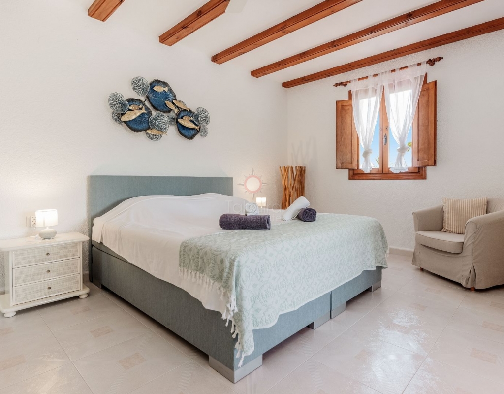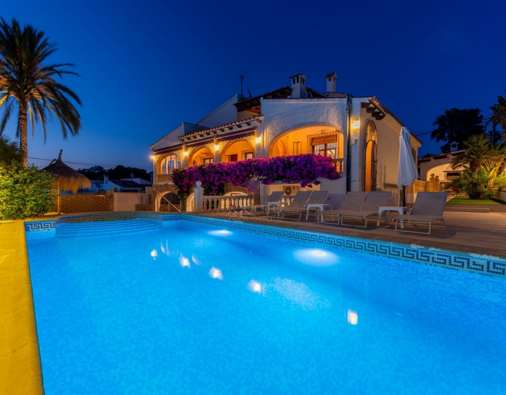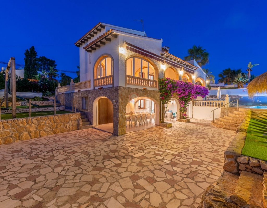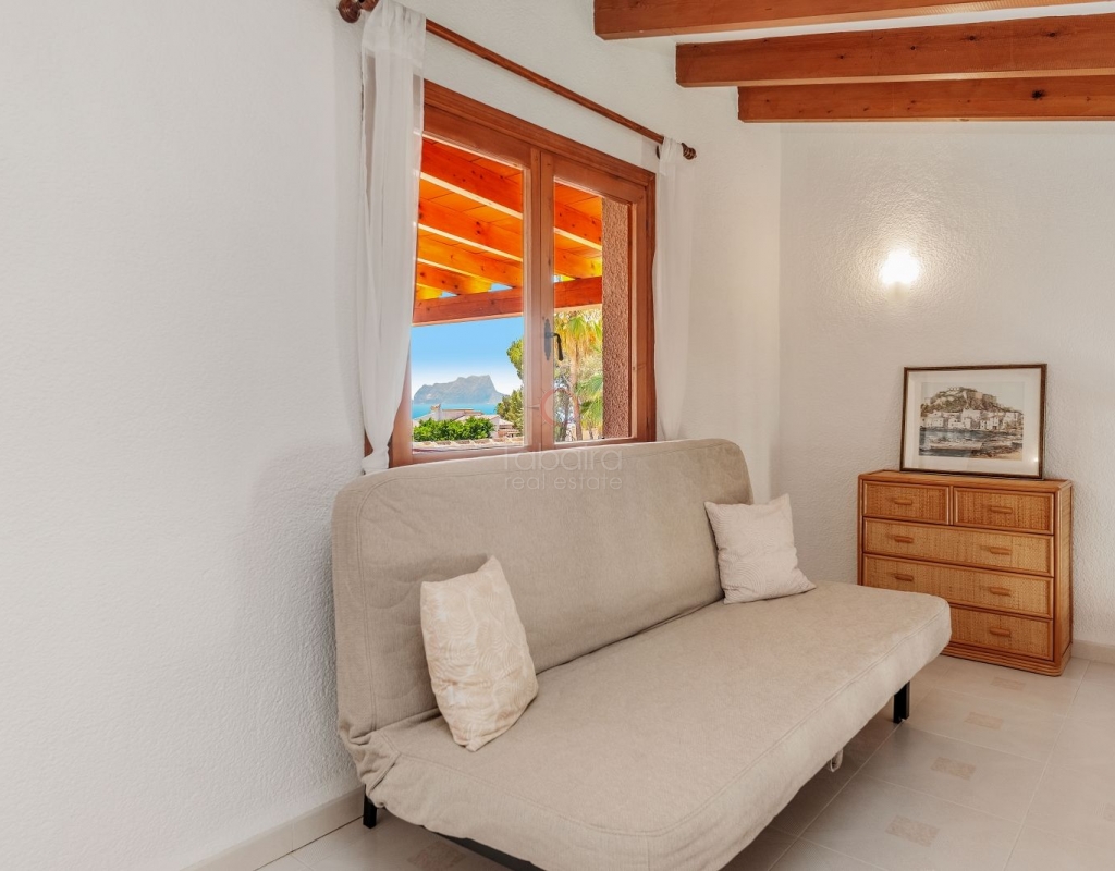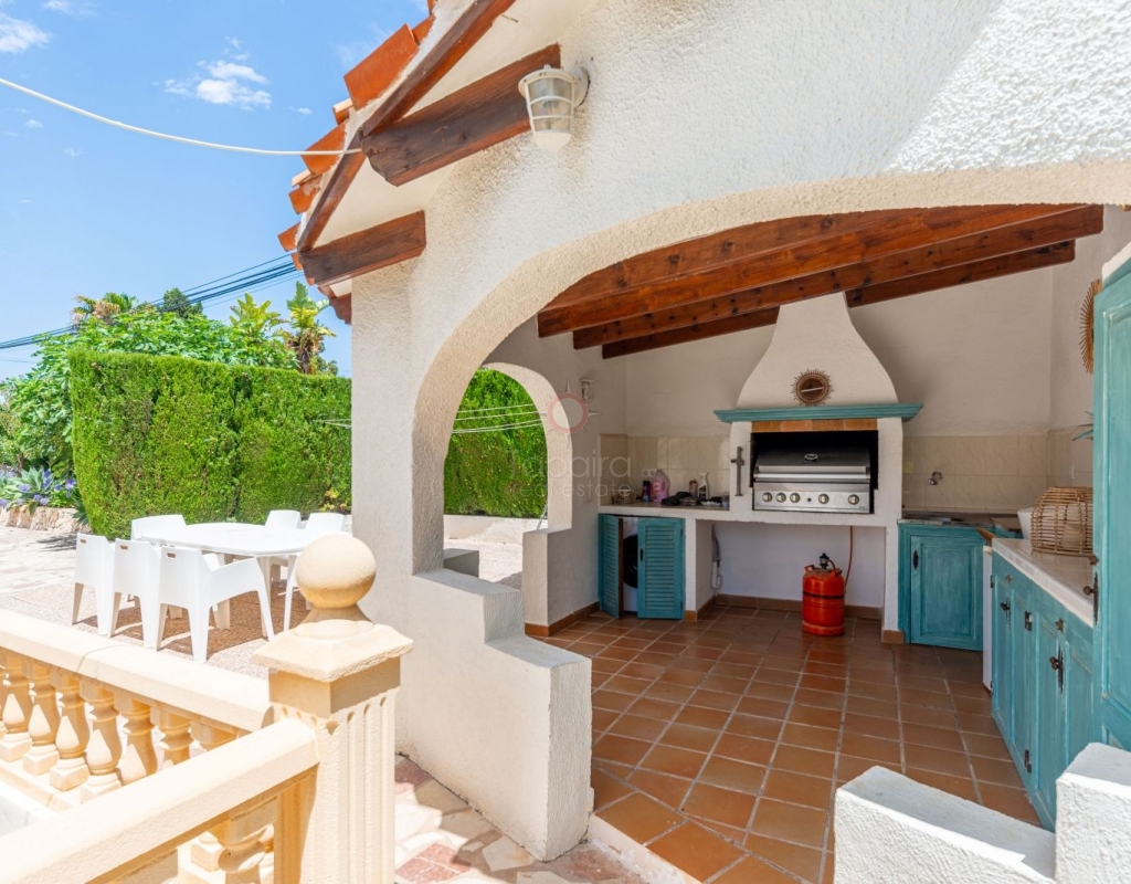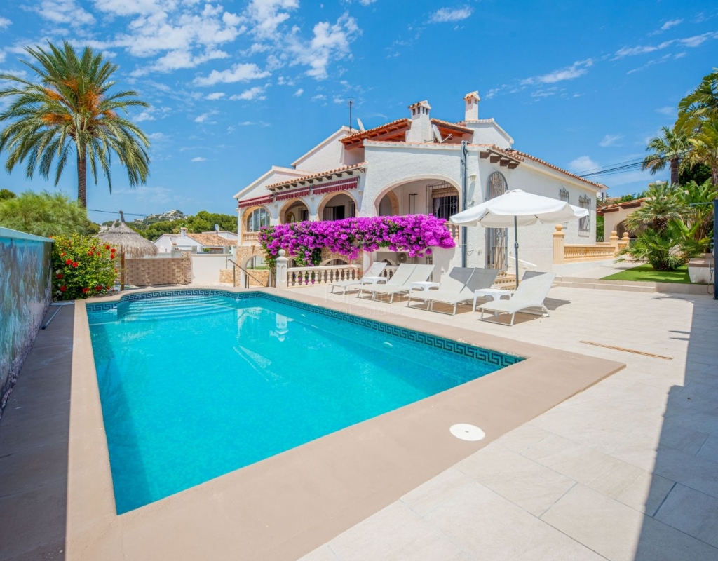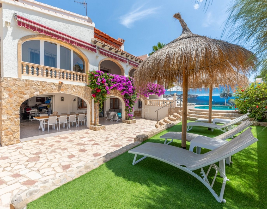 Located in one of the most exclusive areas of Moraira, Pla del Mar, this spacious Mediterranean-style villa offers the perfect blend of tranquility, comfort, and proximity to the town centre and beaches. Ideal for large families, the property stands out not only for its generous main residence but also for a fully independent guest house. Layout of the Main House (2 Floors): Main Floor: -Spacious living/dining room with fireplace -Three large double bedrooms -Fully equipped independent kitchen -Bathroom with shower -Separate guest toilet -Very spacious covered terrace (naya) Additionally, on this level of the plot, there is parking space for three cars, accessible via an electric gate. Upper Floor (accessed via internal staircase): -Master bedroom with en-suite bathroom (with bathtub and shower) -Large private balcony with sea views and views of Calpe’s Peñón de Ifach Guest House (Ground Floor, Completely Independent): -Bright and spacious living-dining room -Three large double bedrooms -Fully equipped separate kitchen -Bathroom with shower -Storage room -Large covered porch -Spacious garage and extra parking space on the plot Outdoor Area: Enjoy the various well-connected terraces that provide the perfect place to relax. Around the private pool, you’ll find a large solarium ideal for sunbathing. There is also an outdoor shower with both hot and cold water, and a separate outdoor toilet for added convenience. The generous covered summer kitchen is perfect for outdoor cooking and dining, while children will enjoy their own playground in the garden. Additional Features: -Central heating via wall-mounted radiators -Air conditioning in all bedrooms (hot and cold air) -Pool heating system -Garage -Storage room This beautiful Mediterranean villa is a unique opportunity for those seeking a versatile property with multiple possibilities, just a short walk from Moraira's centre and beaches. For more information or to schedule a viewing, please do not hesitate to contact us.Legal notice: The built area, land size, and other dimensions and data mentioned in this publication are based on the information provided by the owner. Although we have gathered this data diligently, no rights can be derived from it.