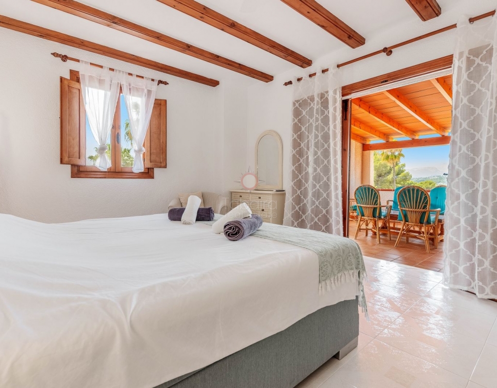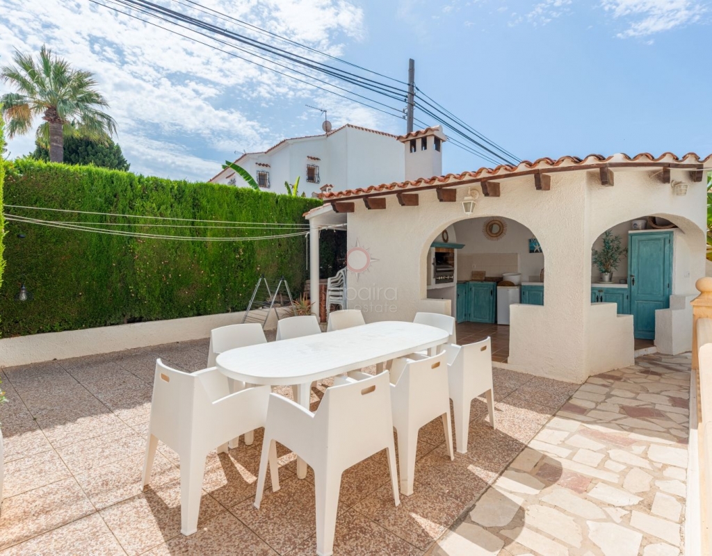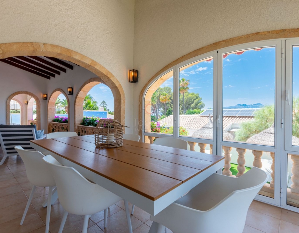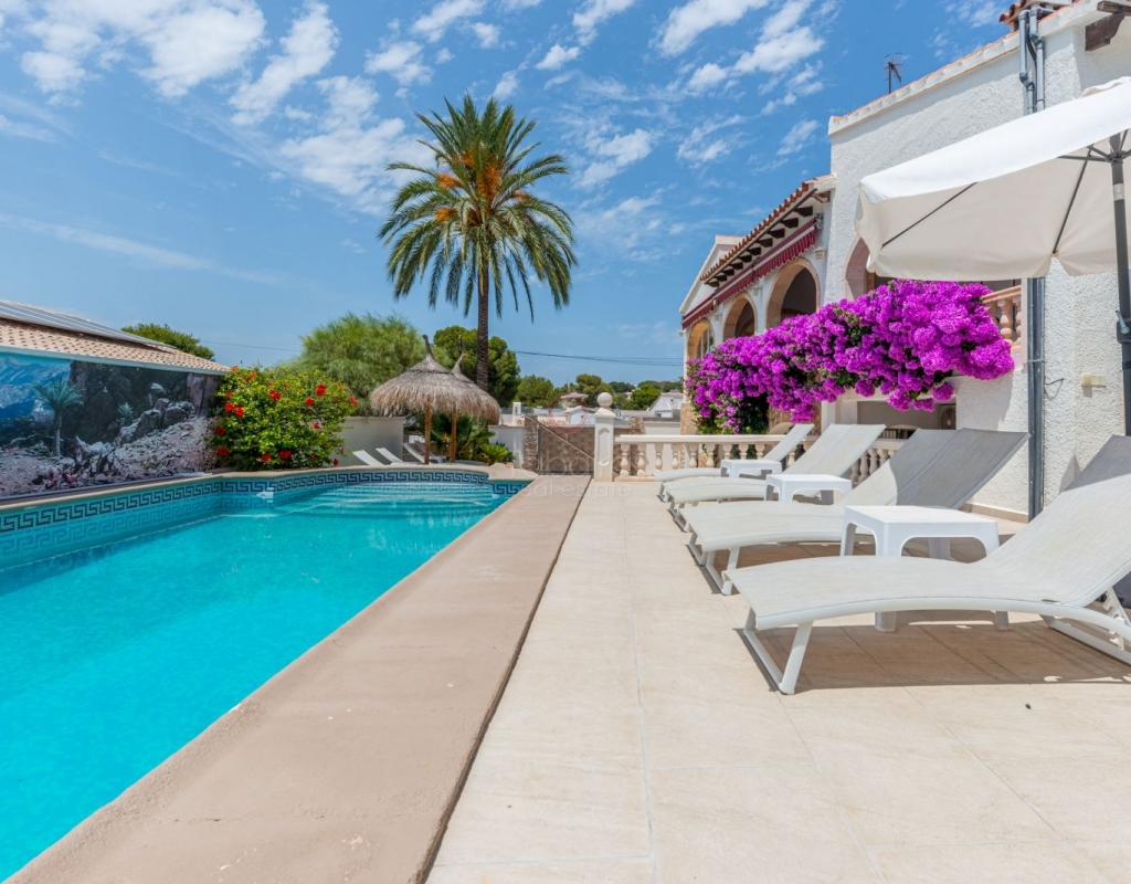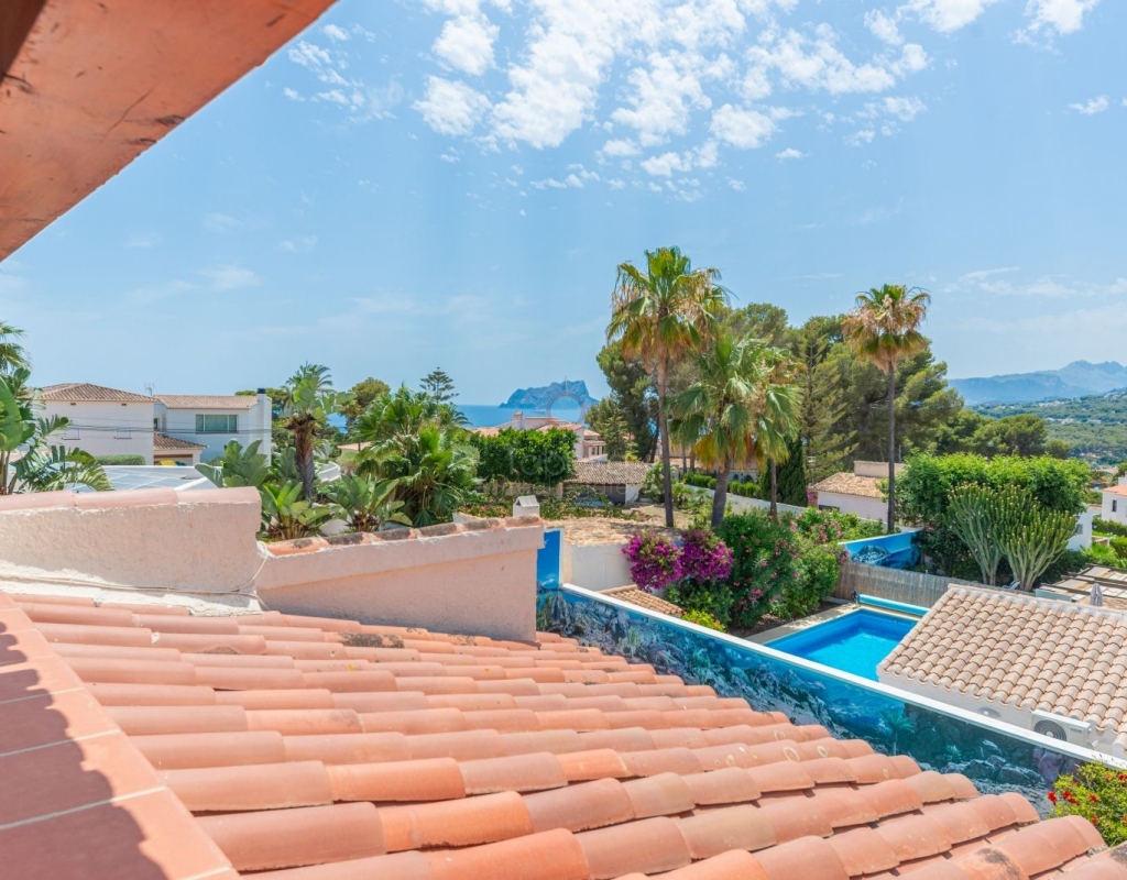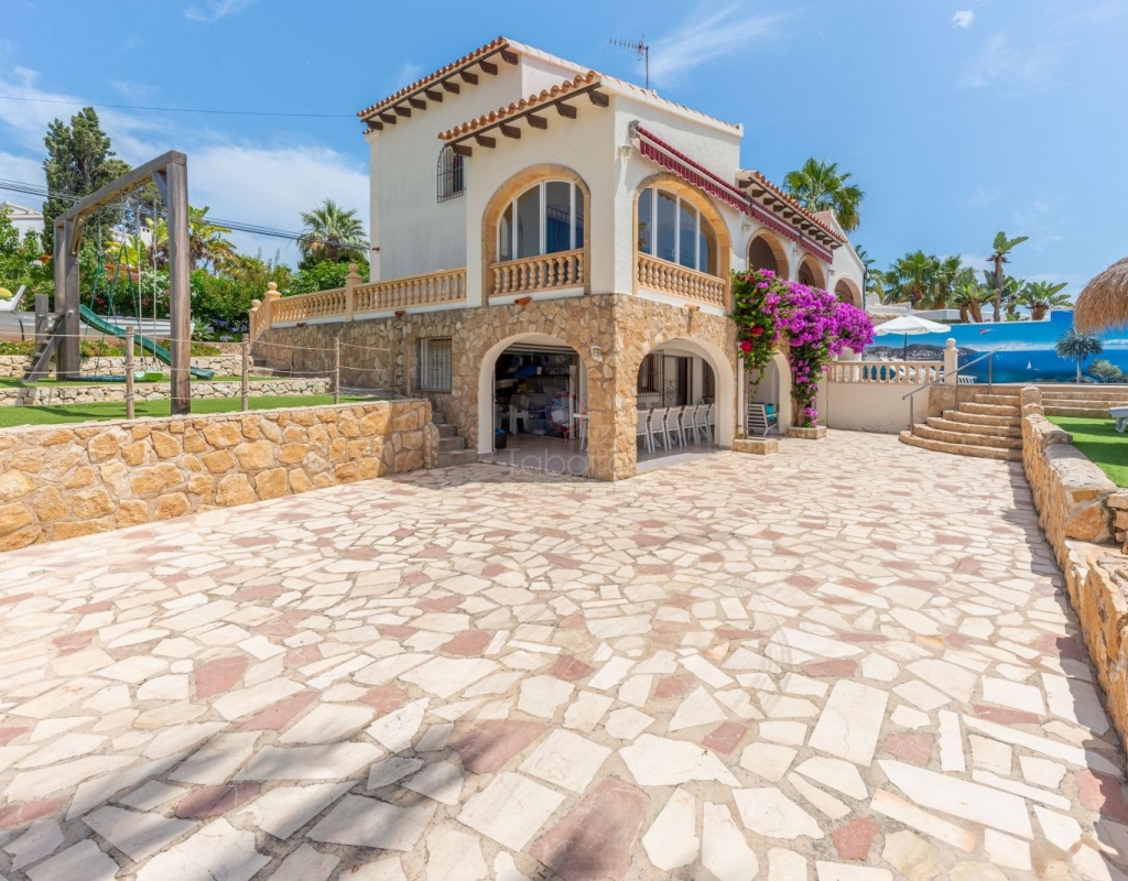 Located in one of the most exclusive areas of Moraira, Pla del Mar, this spacious Mediterranean-style villa offers the perfect blend of tranquility, comfort, and proximity to the town centre and beaches. Ideal for large families, the property stands out not only for its generous main residence but also for a fully independent guest house. Layout of the Main House (2 Floors): Main Floor: -Spacious living/dining room with fireplace -Three large double bedrooms -Fully equipped independent kitchen -Bathroom with shower -Separate guest toilet -Very spacious covered terrace (naya) Additionally, on this level of the plot, there is parking space for three cars, accessible via an electric gate. Upper Floor (accessed via internal staircase): -Master bedroom with en-suite bathroom (with bathtub and shower) -Large private balcony with sea views and views of Calpe’s Peñón de Ifach Guest House (Ground Floor, Completely Independent): -Bright and spacious living-dining room -Three large double bedrooms -Fully equipped separate kitchen -Bathroom with shower -Storage room -Large covered porch -Spacious garage and extra parking space on the plot Outdoor Area: Enjoy the various well-connected terraces that provide the perfect place to relax. Around the private pool, you’ll find a large solarium ideal for sunbathing. There is also an outdoor shower with both hot and cold water, and a separate outdoor toilet for added convenience. The generous covered summer kitchen is perfect for outdoor cooking and dining, while children will enjoy their own playground in the garden. Additional Features: -Central heating via wall-mounted radiators -Air conditioning in all bedrooms (hot and cold air) -Pool heating system -Garage -Storage room This beautiful Mediterranean villa is a unique opportunity for those seeking a versatile property with multiple possibilities, just a short walk from Moraira's centre and beaches. For more information or to schedule a viewing, please do not hesitate to contact us.Legal notice: The built area, land size, and other dimensions and data mentioned in this publication are based on the information provided by the owner. Although we have gathered this data diligently, no rights can be derived from it.