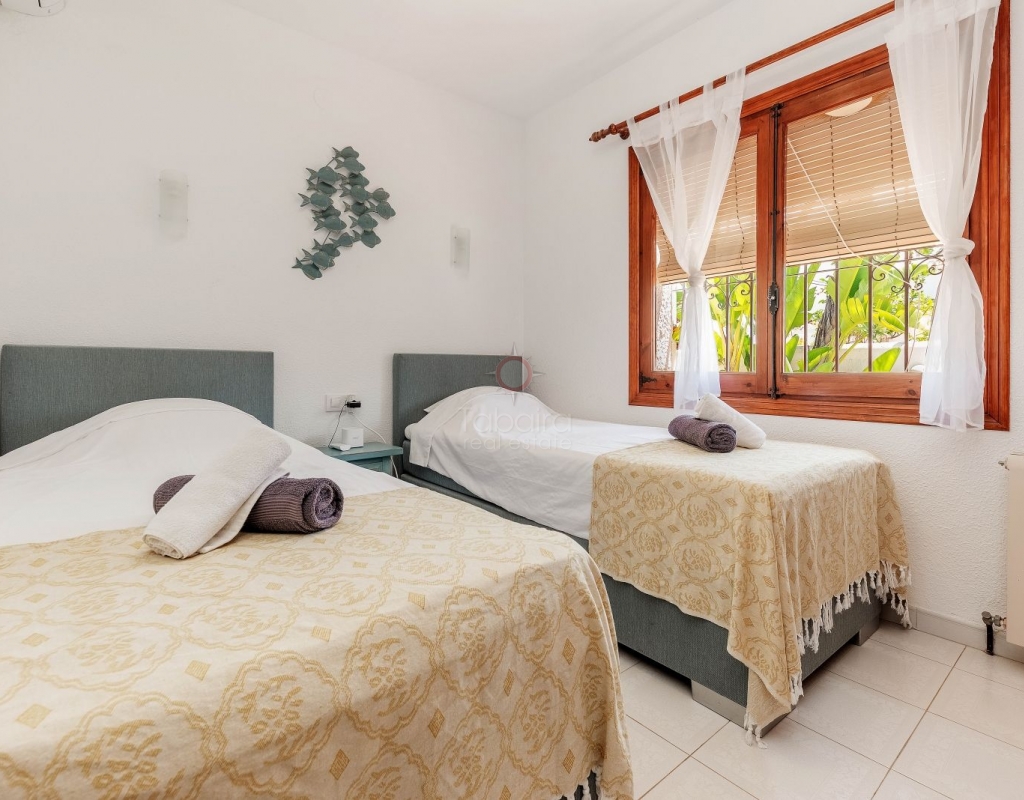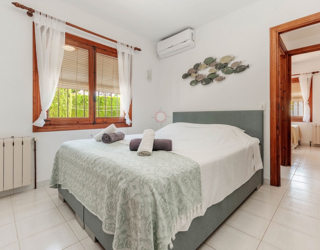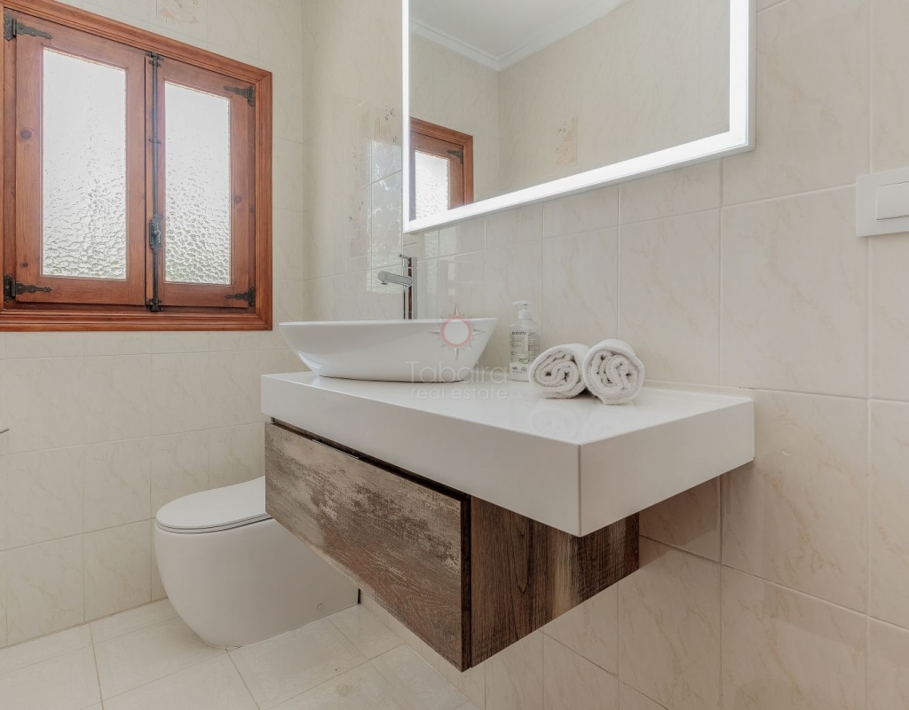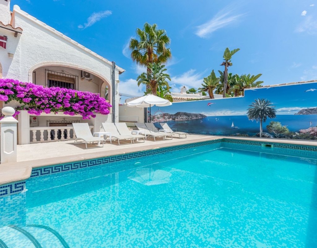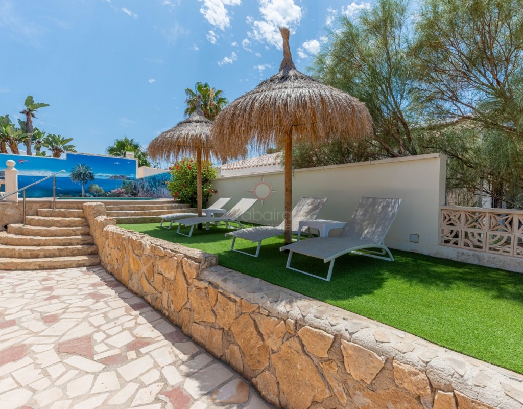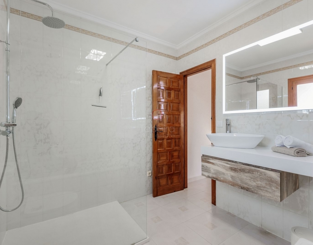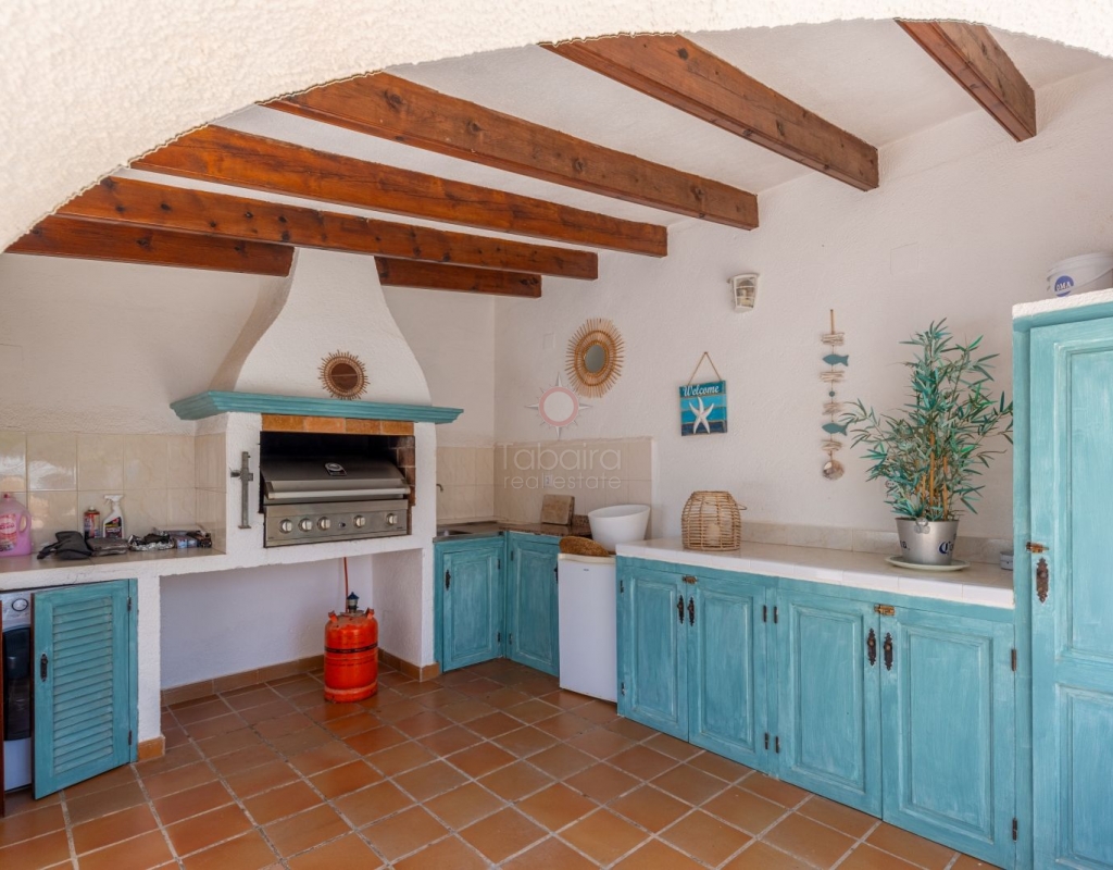 Located in one of the most exclusive areas of Moraira, Pla del Mar, this spacious Mediterranean-style villa offers the perfect blend of tranquility, comfort, and proximity to the town centre and beaches. Ideal for large families, the property stands out not only for its generous main residence but also for a fully independent guest house. Layout of the Main House (2 Floors): Main Floor: -Spacious living/dining room with fireplace -Three large double bedrooms -Fully equipped independent kitchen -Bathroom with shower -Separate guest toilet -Very spacious covered terrace (naya) Additionally, on this level of the plot, there is parking space for three cars, accessible via an electric gate. Upper Floor (accessed via internal staircase): -Master bedroom with en-suite bathroom (with bathtub and shower) -Large private balcony with sea views and views of Calpe’s Peñón de Ifach Guest House (Ground Floor, Completely Independent): -Bright and spacious living-dining room -Three large double bedrooms -Fully equipped separate kitchen -Bathroom with shower -Storage room -Large covered porch -Spacious garage and extra parking space on the plot Outdoor Area: Enjoy the various well-connected terraces that provide the perfect place to relax. Around the private pool, you’ll find a large solarium ideal for sunbathing. There is also an outdoor shower with both hot and cold water, and a separate outdoor toilet for added convenience. The generous covered summer kitchen is perfect for outdoor cooking and dining, while children will enjoy their own playground in the garden. Additional Features: -Central heating via wall-mounted radiators -Air conditioning in all bedrooms (hot and cold air) -Pool heating system -Garage -Storage room This beautiful Mediterranean villa is a unique opportunity for those seeking a versatile property with multiple possibilities, just a short walk from Moraira's centre and beaches. For more information or to schedule a viewing, please do not hesitate to contact us.Legal notice: The built area, land size, and other dimensions and data mentioned in this publication are based on the information provided by the owner. Although we have gathered this data diligently, no rights can be derived from it.