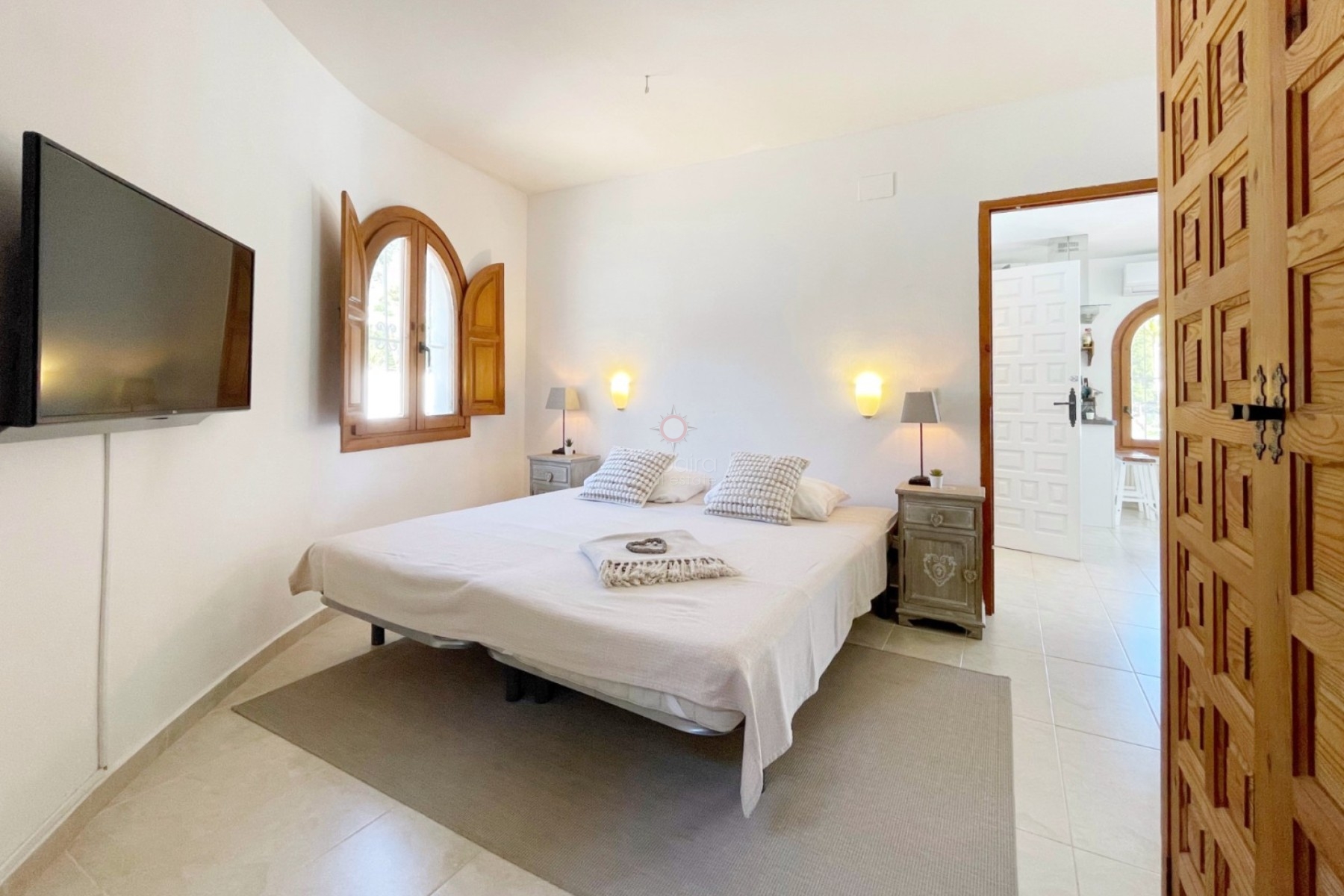 Through a characteristic wooden gate, we enter the spacious pool terrace with a good-sized swimming pool. Here you will also find a cozy lounge area with a shade cloth so you can relax in peace, either in the shade or in the sun. Due to its location, you enjoy complete privacy around the pool terrace. Upon entering the ground floor villa, we arrive in the living-dining room, equipped with recently replaced air conditioning and heating via radiators in each room. Behind it is the open kitchen, equipped with all necessary appliances. On the left are the two bedrooms, which share a modern bathroom with shower, sink, and toilet. The bedrooms feature characteristic elements such as wooden castellano doors, built-in wardrobes, and wooden shutters on the windows. Outside, there is a storage room, an outdoor shower, and a wooden pergola next to the kitchen, perfect for enjoying breakfast outside in the morning or dinner under the stars in the evening.