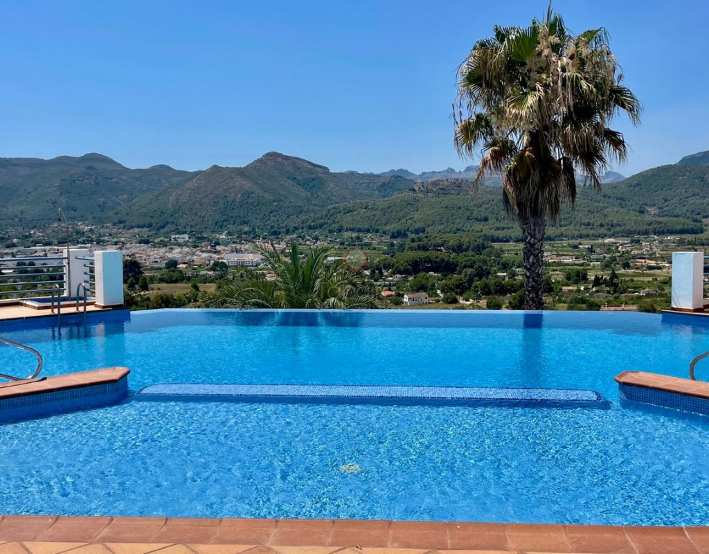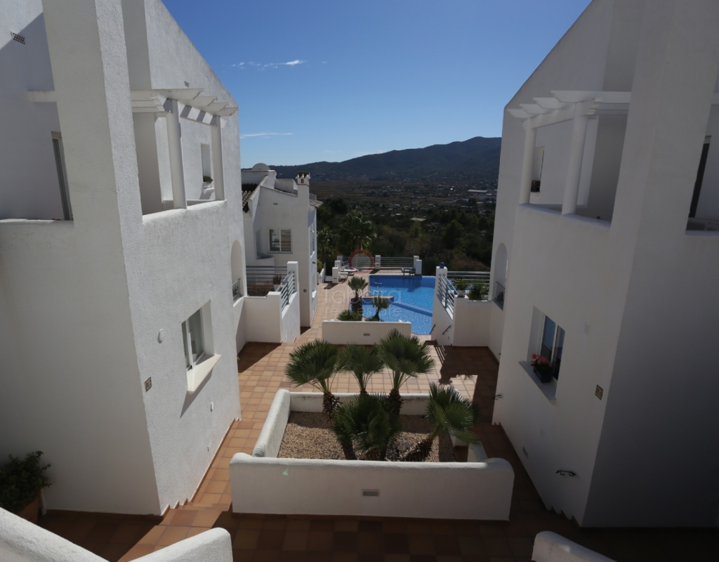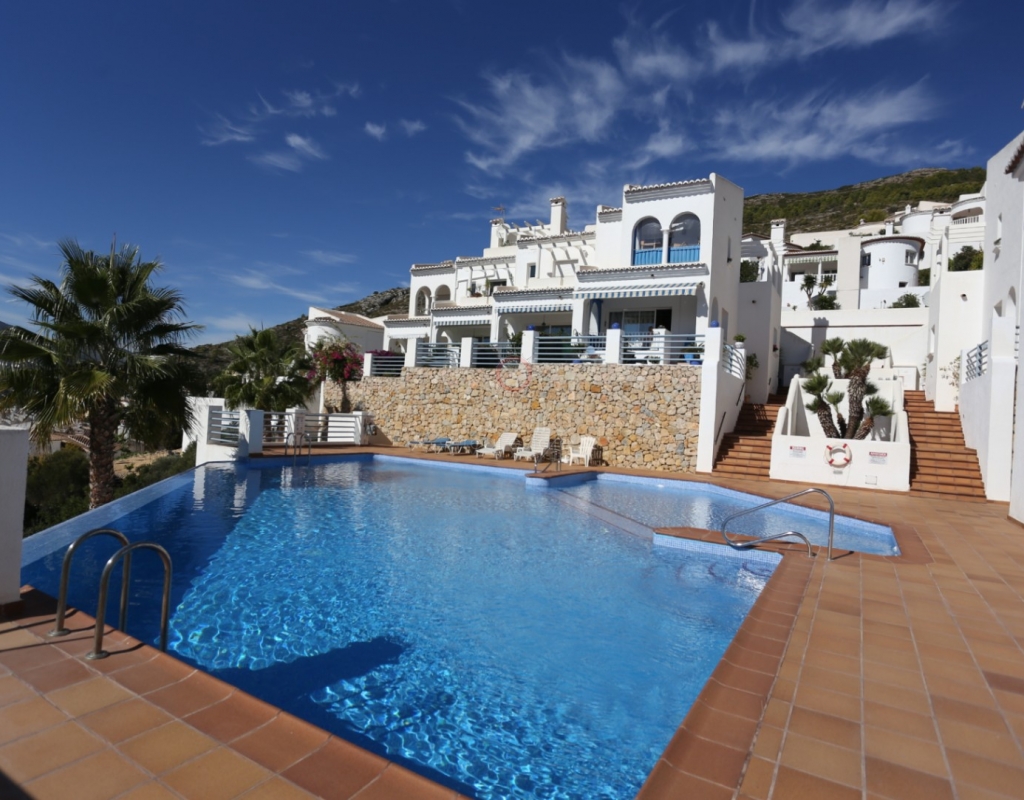 Located on an exclusive development just a short distance from the charming town of Jalon, this beautifully presented south-facing linked townhouse offers modern, light-filled living with stunning views across the valley. The property features a spacious open-plan lounge and dining area with a stylish log-effect gas fire, hot and cold air conditioning, and sliding patio doors that lead to a covered naya and a private enclosed sun terrace, perfect for relaxing or entertaining. The fully fitted kitchen includes a convenient hatch/breakfast bar, and there is also a guest toilet on the ground floor. Upstairs comprises a bright master bedroom with fitted wardrobes, air conditioning, and direct access to a private sun terrace, a second double bedroom with fitted wardrobes and a ceiling fan, and a generous family walk-in shower room. Additional benefits include metered gas central heating, double glazing throughout, and off-street parking within the complex. The small, well-maintained development boasts a fabulous infinity communal pool with poolside shower and sun terrace areas, all enjoying breathtaking panoramic views of the Jalon Valley. Ideal as a permanent residence, lock-up-and-leave holiday home, or rental investment, this stylish property is presented in excellent condition and must be seen to be fully appreciated.