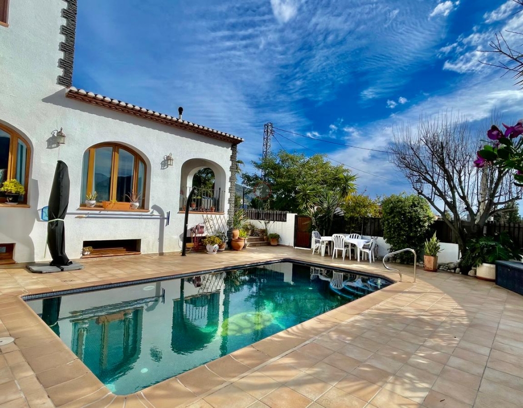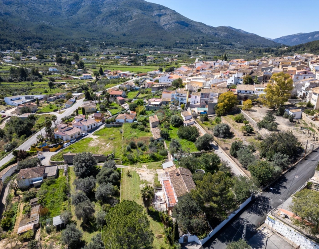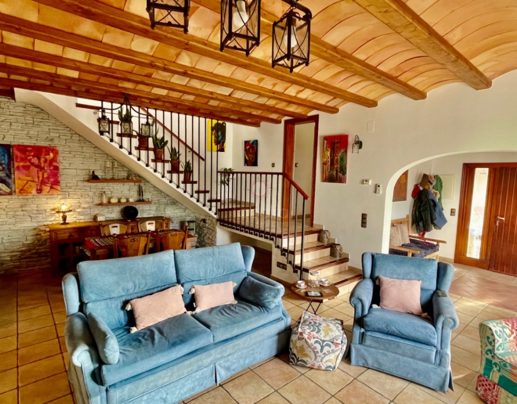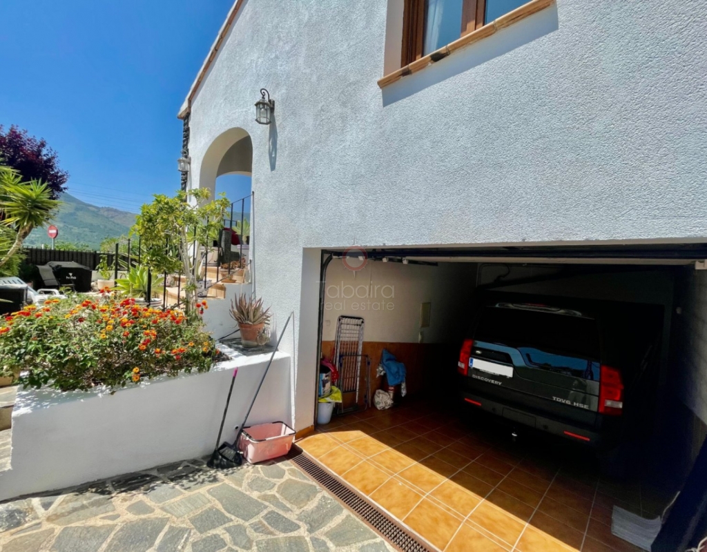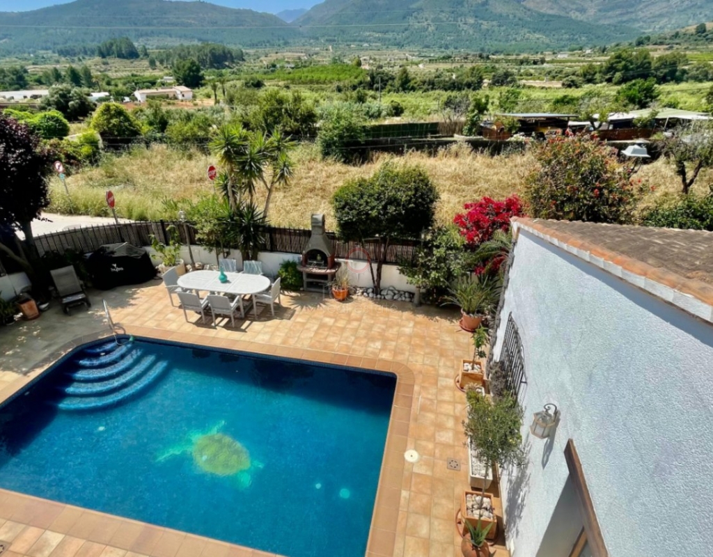 A modern four-bed village home with a separate two-bed casita. These two beautiful properties preserve their traditional charm while offering a unique contemporary ambience. Set on a prime, private, south-facing frontline flat plot with breathtaking panoramic views, these exceptional properties are just a 3-minute walk from the centre of Alcalalí. The main house comprises an open covered gallery wooden beamed ceiling naya with entrance door to an 80m2 open plan reception lounge dining area with large feature double arched patio windows, and wood beamed ceilings, corner wood burner, underfloor heating and hot and cold air conditioning, guest toilet, large open plan fully fitted kitchen with breakfast island, utility pantry area with external door leading to an outside paella cooking area. From the lounge, three steps lead up to the master bedroom, featuring pitched wood-beamed ceilings, built-in sliding wardrobes, hot and cold air conditioning, and an en-suite walk-in shower room. Upstairs, you will find a spacious reception lounge area, a hallway leading to three double bedrooms, all with pitched wood-beamed ceilings, sliding fitted wardrobes, loft mezzanine storage areas, and hot and cold air conditioning. On this level, you have one ensuite shower room and an additional family bathroom. The main house features a large, underground 100 m² garage with an electric door, separate storage, a guest toilet, a wine cellar, and a soundproof room, making it ideal for musicians. The garage can be accessed from the main house via an internal staircase. The villa has a very private 8 x 4.5m pool with south-facing sun terrace, BBQ chill-out area, and easily maintained private Mediterranean gardens. The separate, self-contained guest house, attached to the main house, shares the same spectacular views and has its own private garden with an open, south-facing covered naya. Accommodation comprises an entrance door leading to a lounge/dining area with wood beam gallery ceiling, hot and cold air conditioning, a separate fitted kitchen, guest toilet, hallway to spacious master bedroom with sliding fitted wardrobes, dressing area and hot and cold air conditioning, a double bedroom with access to the external secured courtyard, and a bathroom. This guest house can be accessed, if required, from the main house via the internal staircase to the garage. It is perfect for multi-generational living or could be used commercially, as it is currently, providing an additional rental income. Both properties benefit from high specification double glazing and radiator oil central heating. The main house also has underfloor heating. Viewing is strongly recommended to appreciate this exceptional village residence with privacy, easy access, and a unique location.