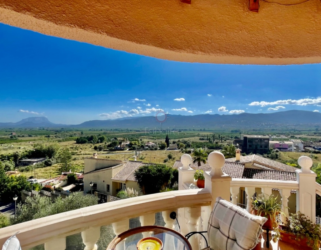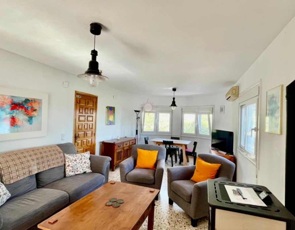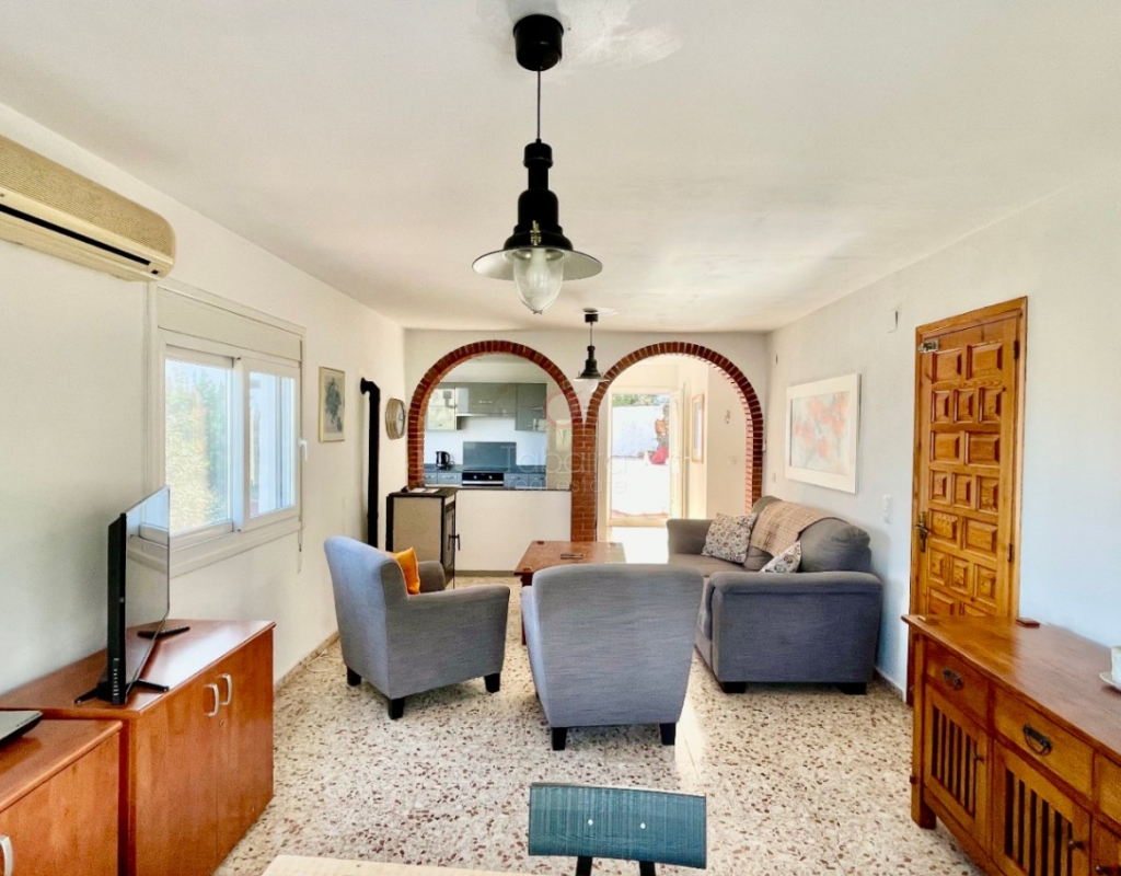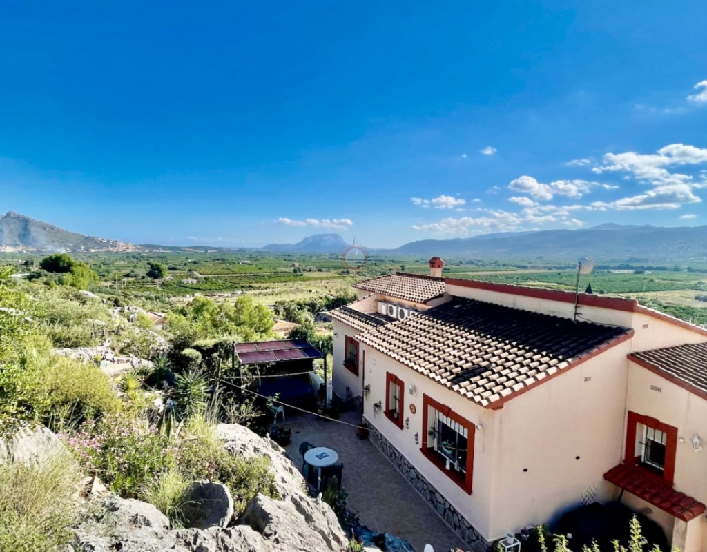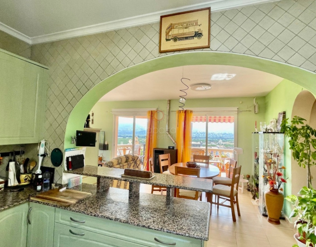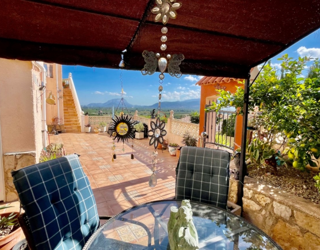 This detached, light-filled villa enjoys a perfect south-facing position with breathtaking panoramic views across the mountains, valley, and towards the distant sea. Ideally located within just a 3-minute walk to the charming village of Tormos, the property offers spacious and versatile accommodation throughout. The main level features a large covered naya with wood-beamed ceilings, retractable sun awnings, and sliding patio doors opening into a bright open-plan living and dining area with hot & cold air conditioning. The American-style kitchen is fully fitted and includes a breakfast bar and separate utility room, with direct access to a private sun terrace, perfect for al fresco dining. A hallway leads to the master bedroom with fitted wardrobes, hot & cold air conditioning, ceiling fan, and an ensuite shower room. There are also two further double bedrooms, both with fitted wardrobes, ceiling fans, air conditioning, and a shared family bathroom. On the lower level, double patio doors open onto spacious entertainment rooms that offer excellent potential to be converted into a self-contained two-bedroom apartment with its own bathroom. The exterior offers a generous sun terrace with a shaded pergola, low-maintenance gardens, and a carport with a sunshade sail for off-street parking. The property benefits from double glazing and numerous additional features throughout. Viewing is highly recommended to fully appreciate the impressive views and exceptional setting of this south-facing villa overlooking the valley and coastline