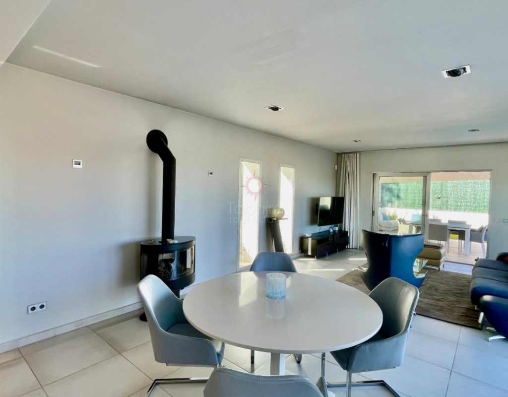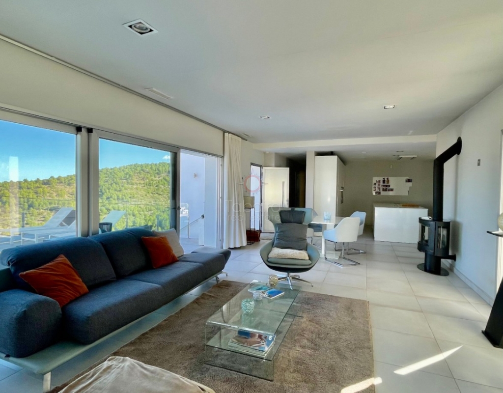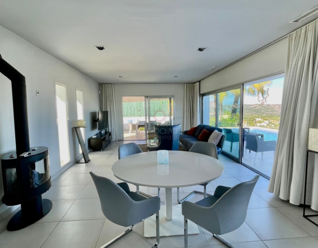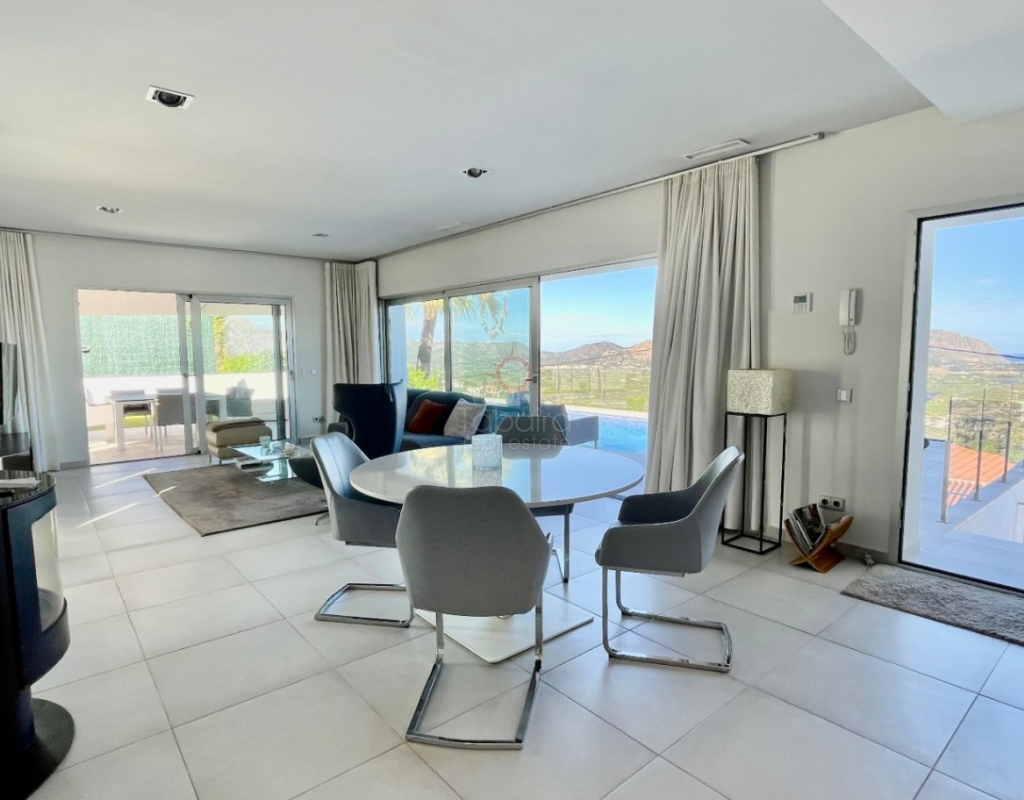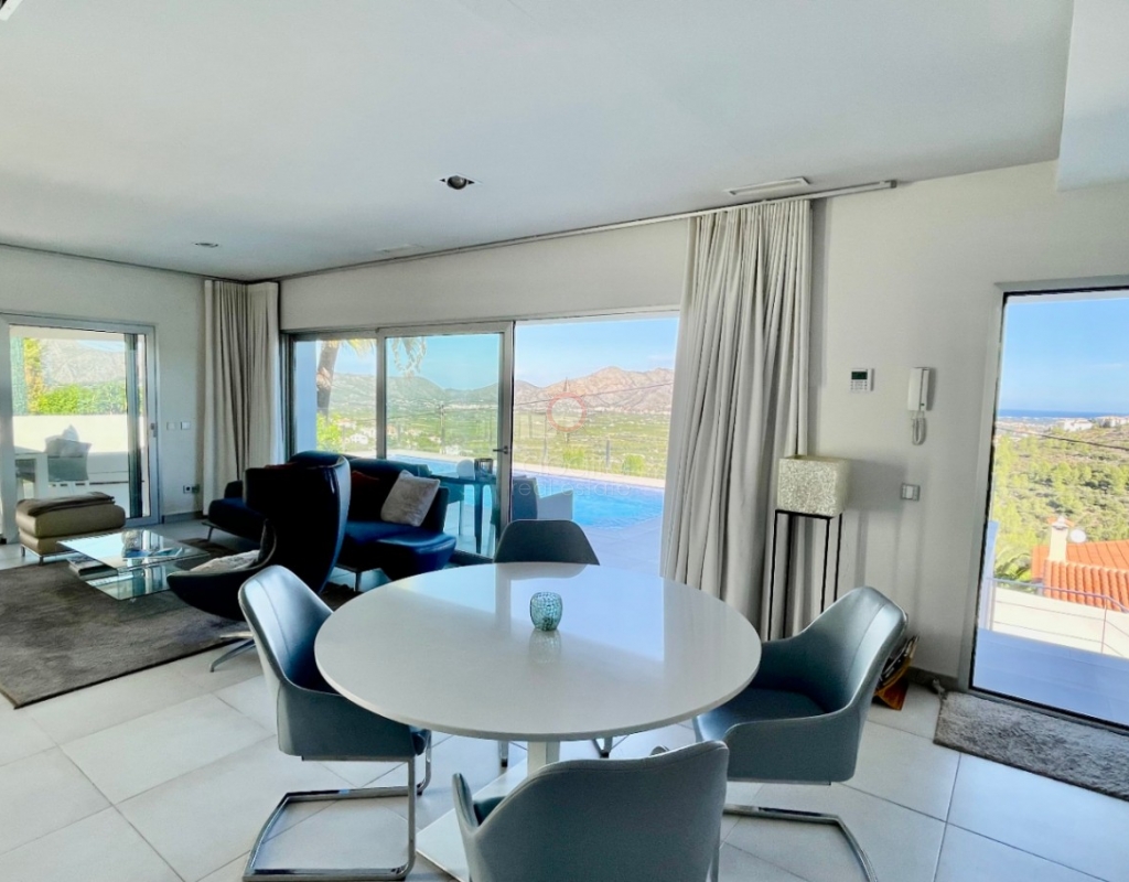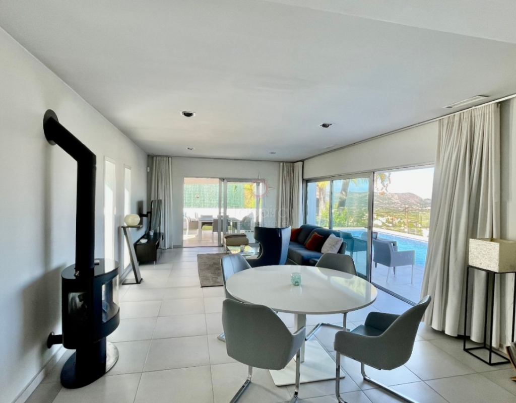 This elegant, minimalist luxury detached villa, built in 2020, is set on one level and offers breathtaking views across the Orba Valley towards Dénia and the Mediterranean Sea. The property features a bright and spacious open-plan living area with a feature free-standing wooden burner, state-of-the-art fully fitted luxury kitchen area with centralised cooking island, and from the lounge two sets of sliding patio doors opening onto a 100m² pool terrace. Here, you’ll find a beautiful swimming pool, sunbathing area, and a stylish chill-out BBQ terrace shaded by a sun sail—perfect for relaxing or entertaining while enjoying the views. The spacious master bedroom boasts sliding fitted wardrobes, a large picture window framing the stunning scenery, and a modern luxury en-suite walk-in shower room. There are two additional double bedrooms with fitted sliding wardrobes and a contemporary family walk-in shower room. Outside, the villa offers a low-maintenance terraced garden with mature trees to the rear, a driveway with space for two cars, and a large utility, pool casita, and storage room. Designed for comfort and easy living, the home includes a centralised air conditioning system, double glazing, and a layout that ensures effortless upkeep. This property is ideal as a permanent residence or a luxurious holiday retreat.