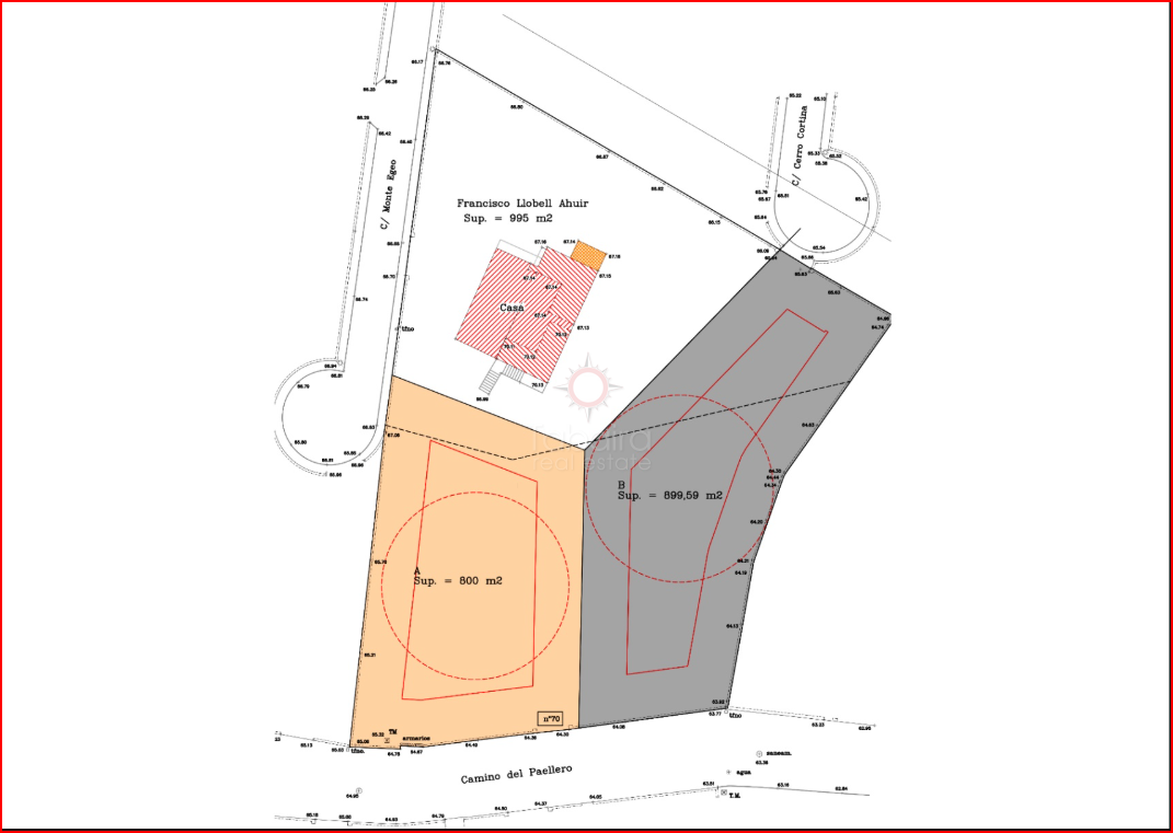 Property for sale in Moraira, located just 800 metres from the sea and 1 km from the town centre. The property sits on a large plot of 2,694 m², which can be divided into three separate plots of approximately 995 m², 900 m² and 800 m².