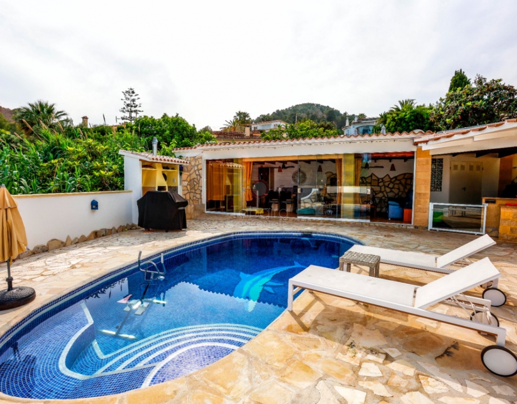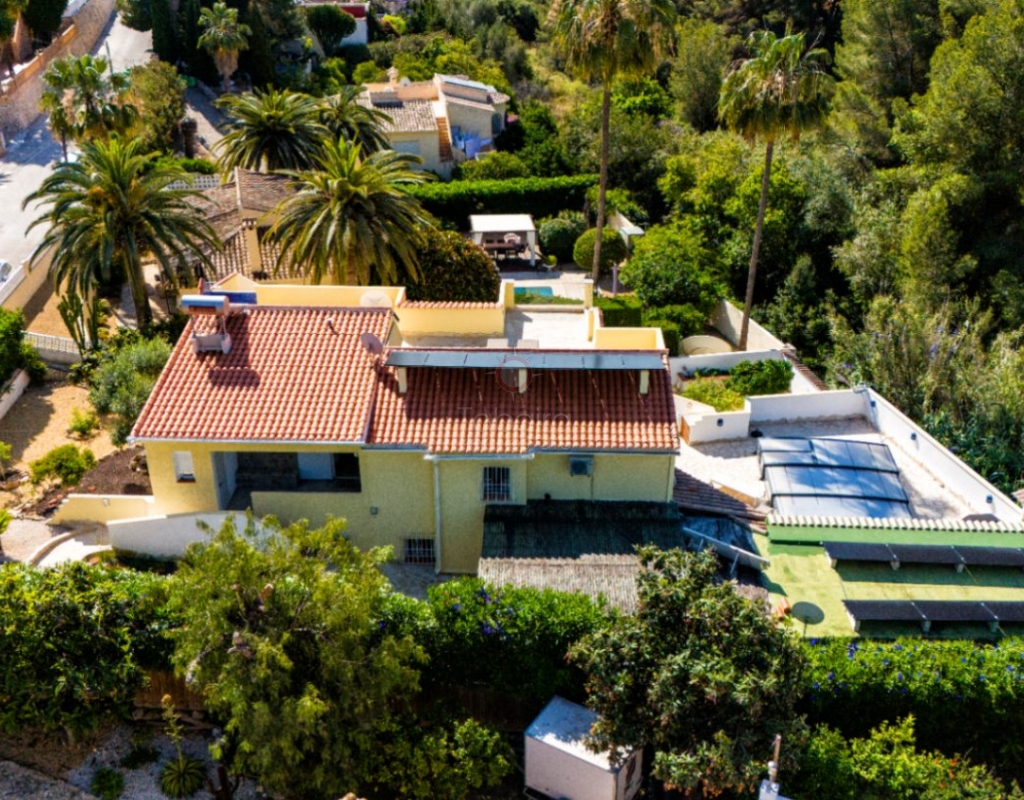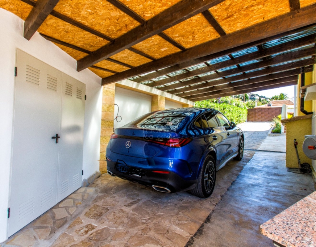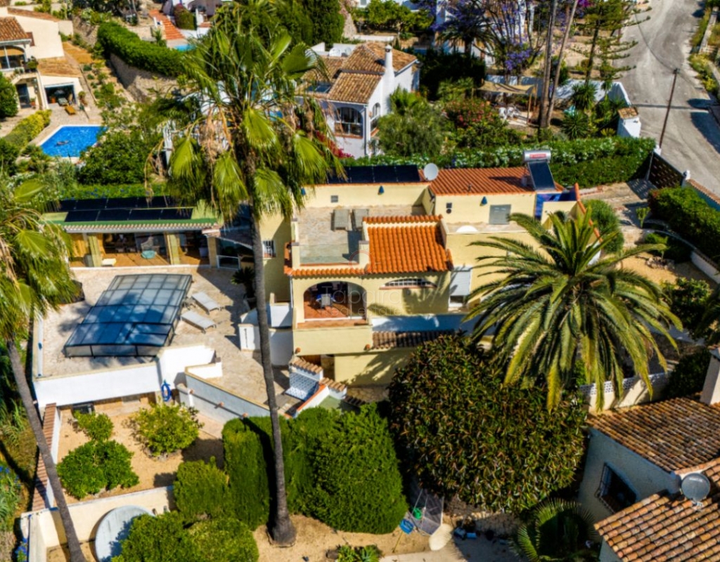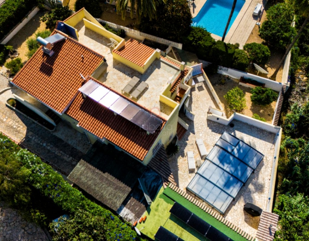Villa for sale in Benissa La Viña with swimming pool and south-facing position. Spacious property with 5 bedrooms, solar panels, Energy Certificate A and possibility for two residential units on the Costa Blanca. In the quiet residential area of La Viña in Benissa, this well-maintained villa is for sale on the Costa Blanca on a flat plot with a south-facing position. The layout over two floors allows for a variety of uses. Description The upper floor has a living-dining room, a separate fully equipped kitchen and a porch enclosed by glass curtains with views of the green surroundings. This space connects to an open terrace. On this floor there is also a spacious bedroom with en-suite bathroom, a second bedroom (currently used as an office) and a separate bathroom. An internal staircase leads to the lower floor with three additional bedrooms, a bathroom, separate toilet, laundry room and extra storage. Two bedrooms are currently used as storage space and fitness or office space. The property is equipped with hot/cold air conditioning, pellet stoves on both floors, double glazing and electric shutters. The villa has solar panels, an automatic gate, carport, home automation and Energy Certificate A. The property is largely wheelchair accessible and can be divided into two independent residential units. From the porch, a staircase leads to the pool terrace with a large covered summer kitchen and lounge area, which can be closed off with sliding glass doors. The pool was renovated in 2023, heated and equipped with a cover and outdoor shower. Special features Villa for sale in Benissa – La ViñaFlat plot with south-facing position5 bedrooms and 4 bathroomsHeated swimming pool Huge summer kitchen, lounge areaSolar panels and energy class APossibility of two residential unitsWhy view this villa LocationLots of potentialSustainableA special villa for sale in Benissa with many possibilities. Great for year-round living, but also very suitable for rental. See for yourself and schedule a viewing with one of our sales agents today.