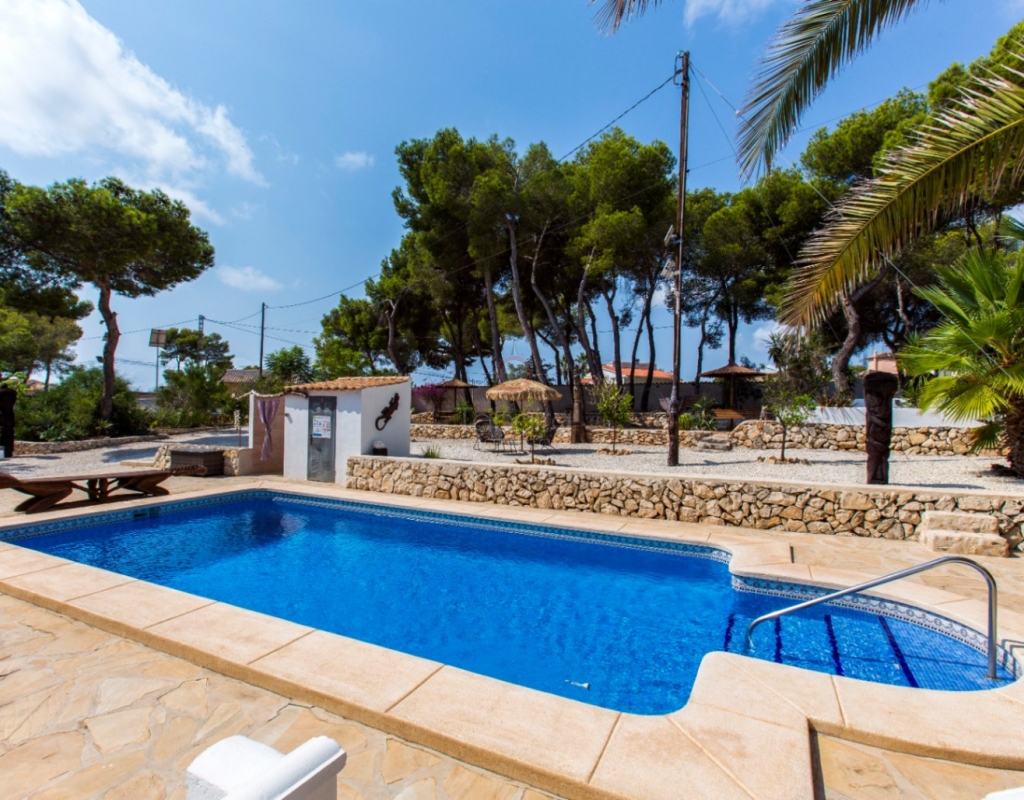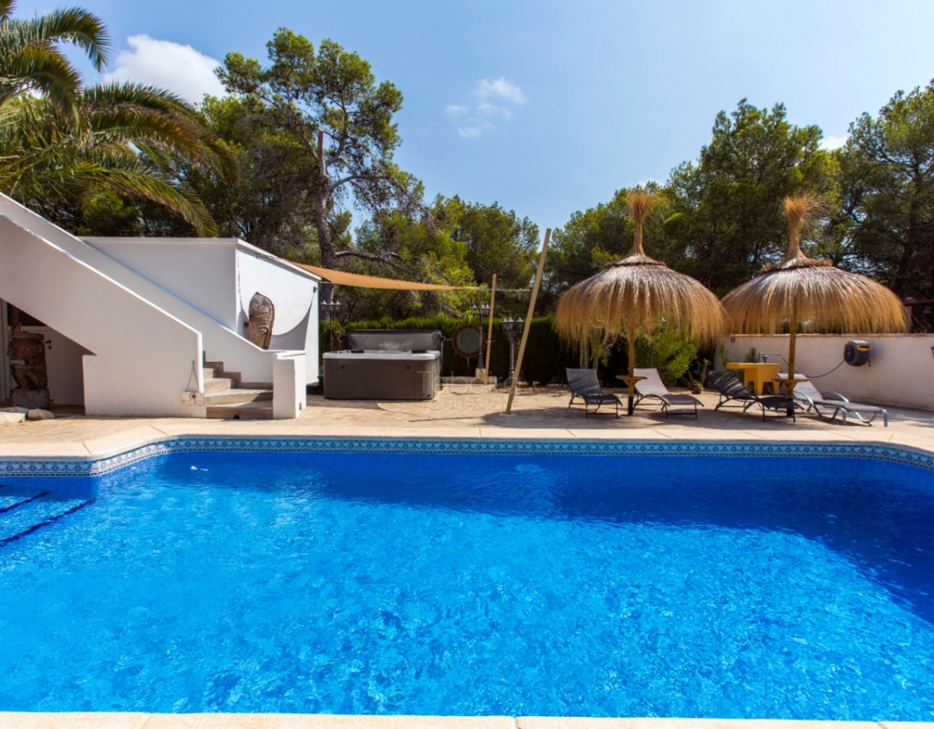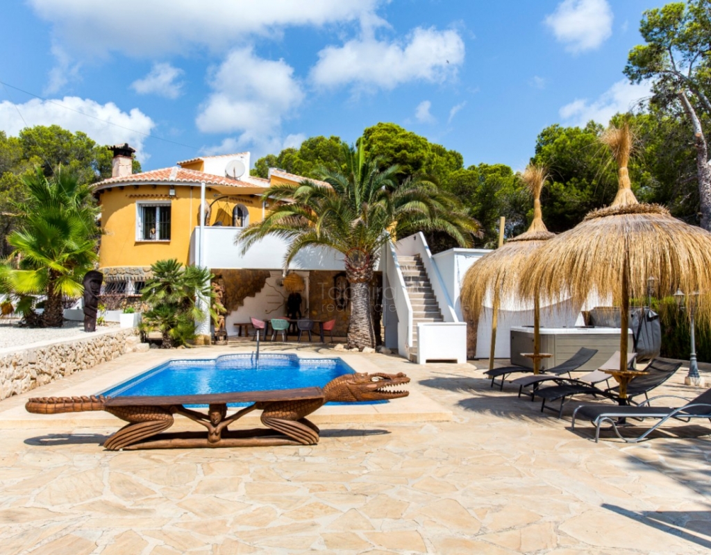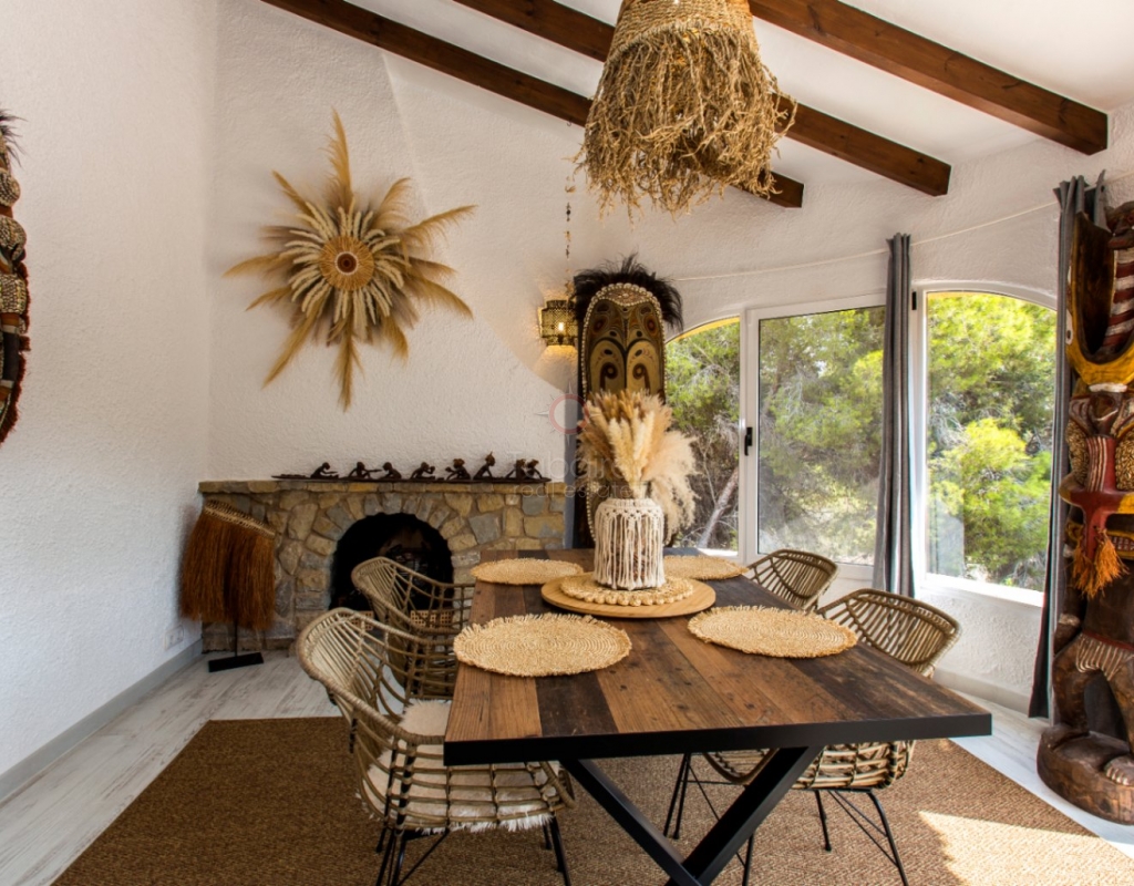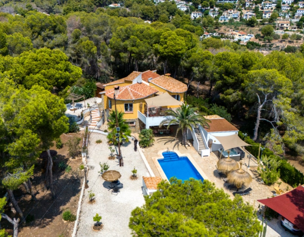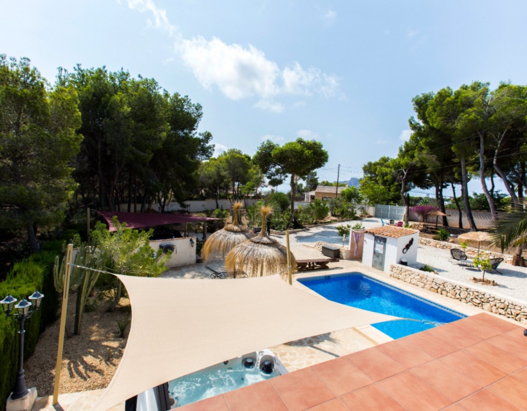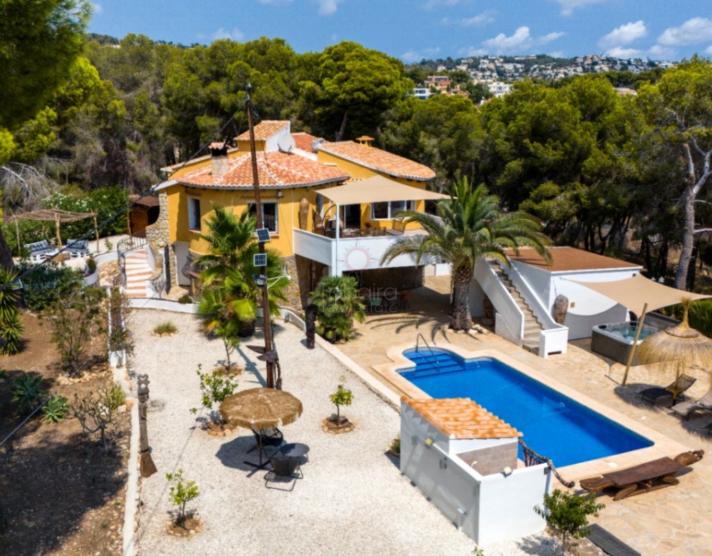 Detached villa with two separate apartments, that can be joined, for sale in Benissa, on a spacious plot, within walking distance of the sea In a quiet residential area, directly adjacent to a private forest with a lot of piece and quietness and with an open south-west facing position, this detached house is located just 700 meters from the Mediterranean Sea and bays. Ideally situated between Calpe and Moraira. The property was originally built in 1977, but was thoroughly renovated in 2022 and equipped with modern amenities. Description This property is spread over two floors, which are connected by an external staircases. The upper floor has a spacious living room with a fireplace, a dining room that opens onto a pleasant terrace area with seaviews, a fully equipped kitchen, two double bedrooms and a bathroom. On the ground floor, there is a living room with a dining area, a spacious fully equipped kitchen, two double bedrooms (one with a fireplace), a bathroom, a separate toilet and a laundry room with exit to the garden. Outside, the plot offers an 8x4 meter automatic salt water swimming pool with terrace, a jacuzzi, outdoor shower hot/cold, a summer kitchen with a 37m2 big covered terrace in front of the pool and several cosy seating and eating areas. There is a 20m2 big separate air conditioned room ideal for an office or small gym. The garden is green and low-maintenance, with fruit trees and other plants with beautiful night illumination. The property has a carport, parking space for several cars or mobile home and a spacious storage room. Special features Only 700 metres from the seaSouth-west facing with open views and seaviewsRenovated in 2022Air conditioning in all roomsDouble glazing, insect screens and roller shuttersFiber opticTourist licence (the ground floor is currently used for holiday rentals)Large flat plot with garden, fruit trees and seating areasWhy view this villa The location: quiet and in green surroundingsReady to move inSuitable for permanent residence and holiday rentalsIdeal for outdoor livingThe villa is an ideal combination of location, comfort and layout, ready for immediate use. Book a viewing with one of our staff today.