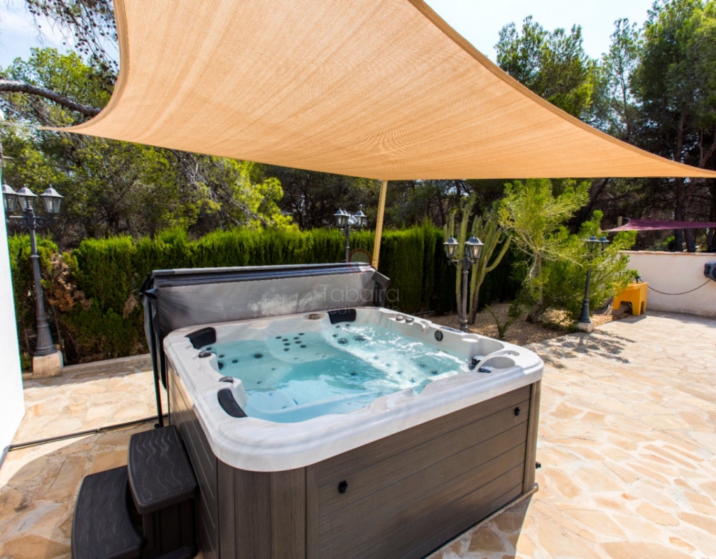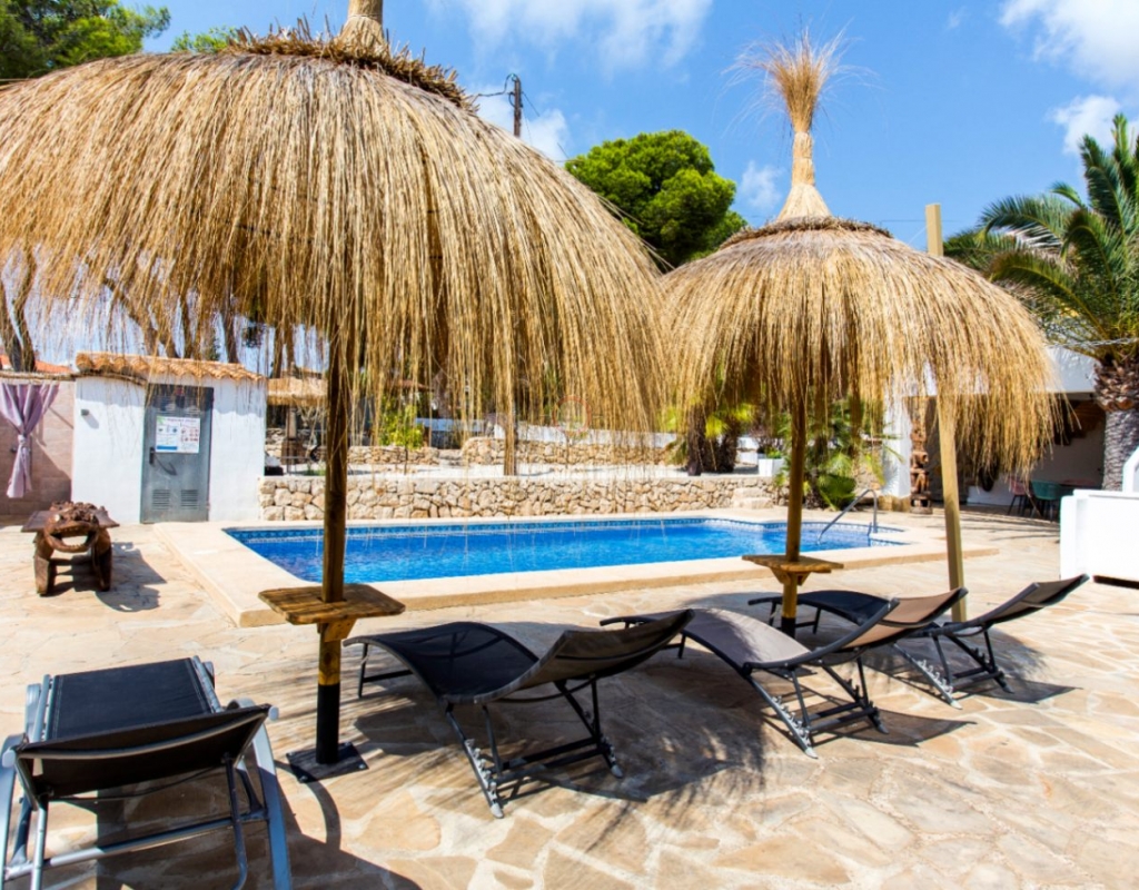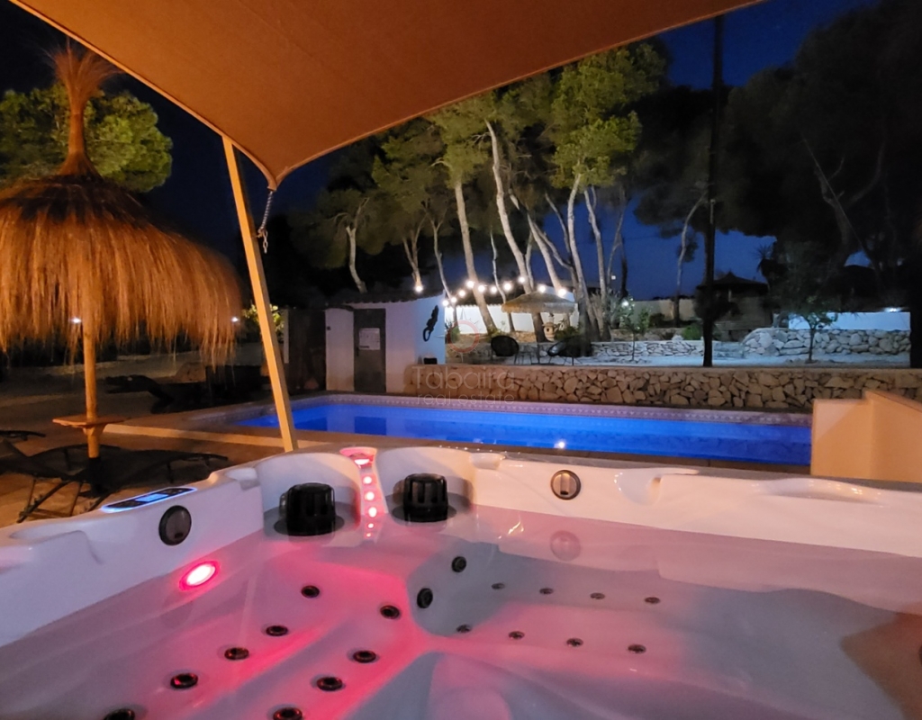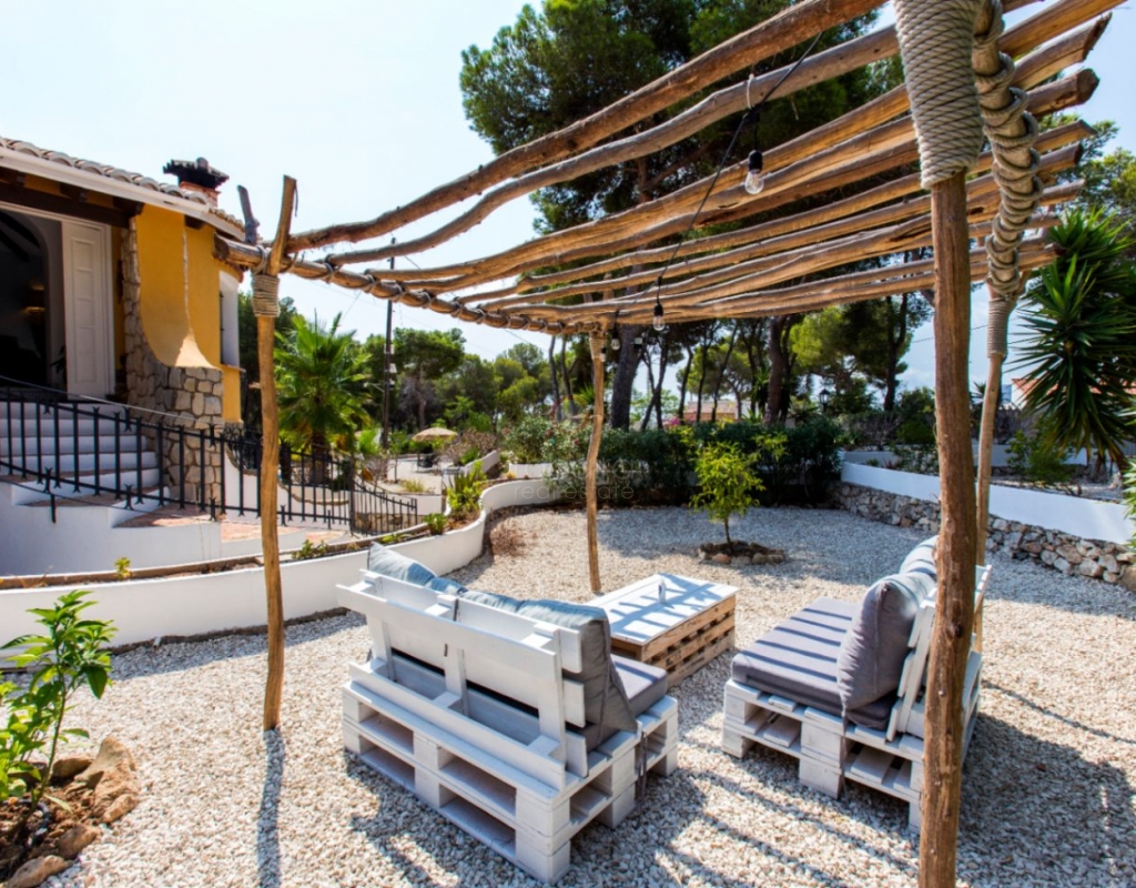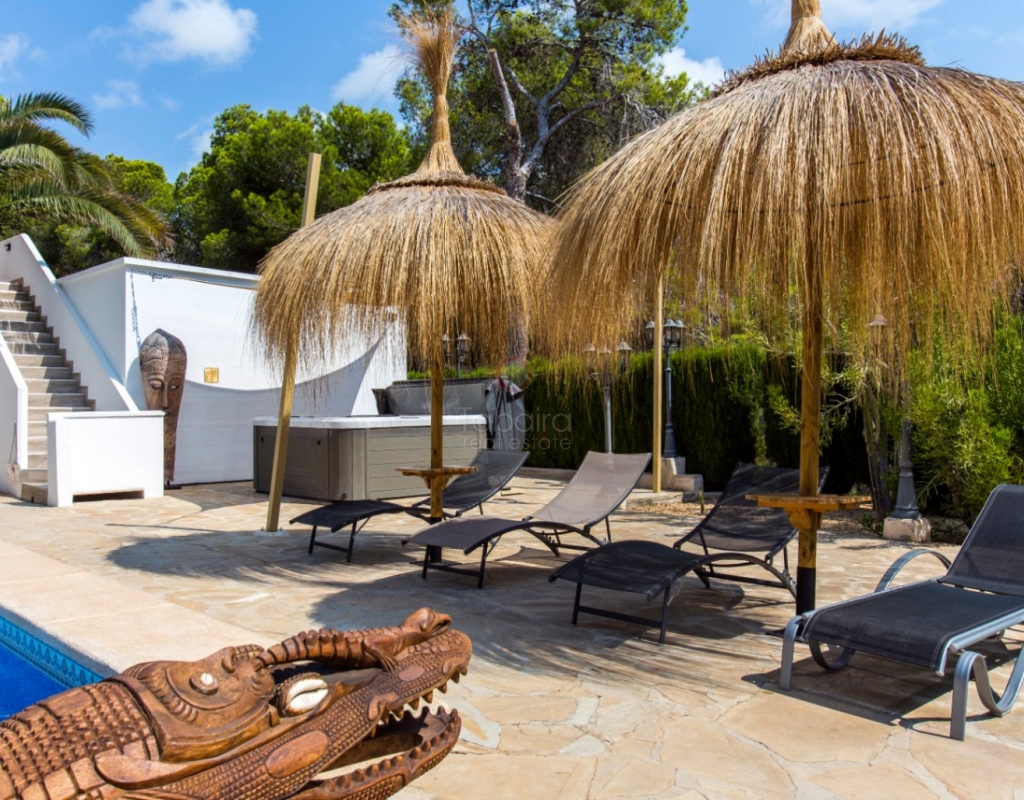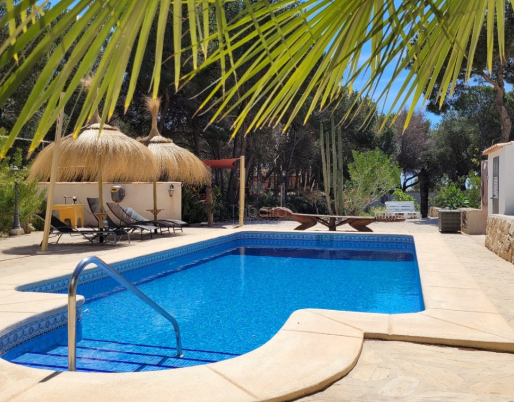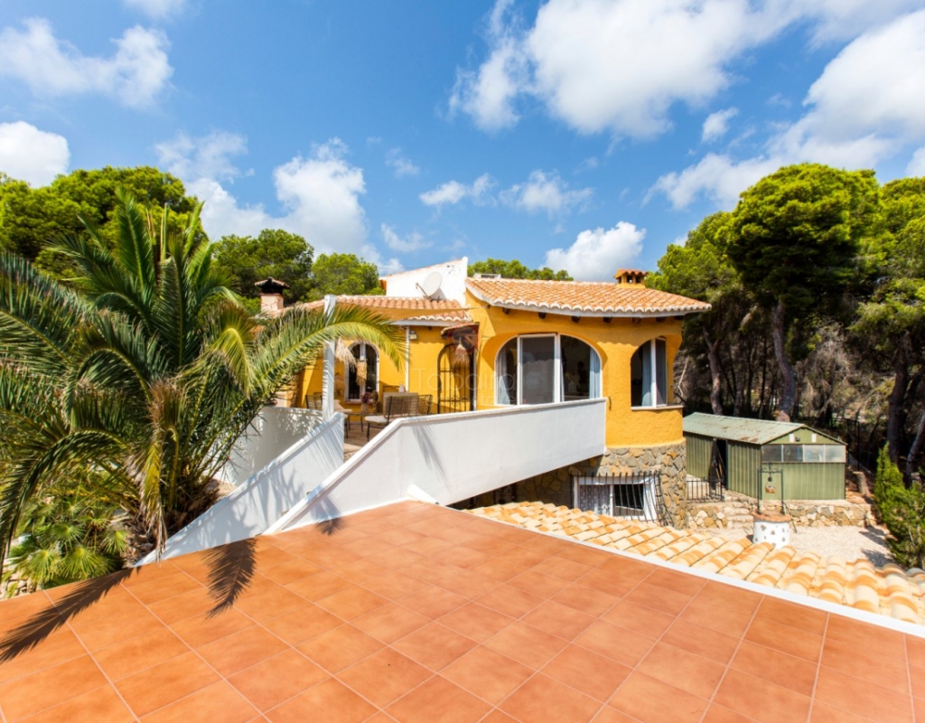 Detached villa with two separate apartments, that can be joined, for sale in Benissa, on a spacious plot, within walking distance of the sea In a quiet residential area, directly adjacent to a private forest with a lot of piece and quietness and with an open south-west facing position, this detached house is located just 700 meters from the Mediterranean Sea and bays. Ideally situated between Calpe and Moraira. The property was originally built in 1977, but was thoroughly renovated in 2022 and equipped with modern amenities. Description This property is spread over two floors, which are connected by an external staircases. The upper floor has a spacious living room with a fireplace, a dining room that opens onto a pleasant terrace area with seaviews, a fully equipped kitchen, two double bedrooms and a bathroom. On the ground floor, there is a living room with a dining area, a spacious fully equipped kitchen, two double bedrooms (one with a fireplace), a bathroom, a separate toilet and a laundry room with exit to the garden. Outside, the plot offers an 8x4 meter automatic salt water swimming pool with terrace, a jacuzzi, outdoor shower hot/cold, a summer kitchen with a 37m2 big covered terrace in front of the pool and several cosy seating and eating areas. There is a 20m2 big separate air conditioned room ideal for an office or small gym. The garden is green and low-maintenance, with fruit trees and other plants with beautiful night illumination. The property has a carport, parking space for several cars or mobile home and a spacious storage room. Special features Only 700 metres from the seaSouth-west facing with open views and seaviewsRenovated in 2022Air conditioning in all roomsDouble glazing, insect screens and roller shuttersFiber opticTourist licence (the ground floor is currently used for holiday rentals)Large flat plot with garden, fruit trees and seating areasWhy view this villa The location: quiet and in green surroundingsReady to move inSuitable for permanent residence and holiday rentalsIdeal for outdoor livingThe villa is an ideal combination of location, comfort and layout, ready for immediate use. Book a viewing with one of our staff today.